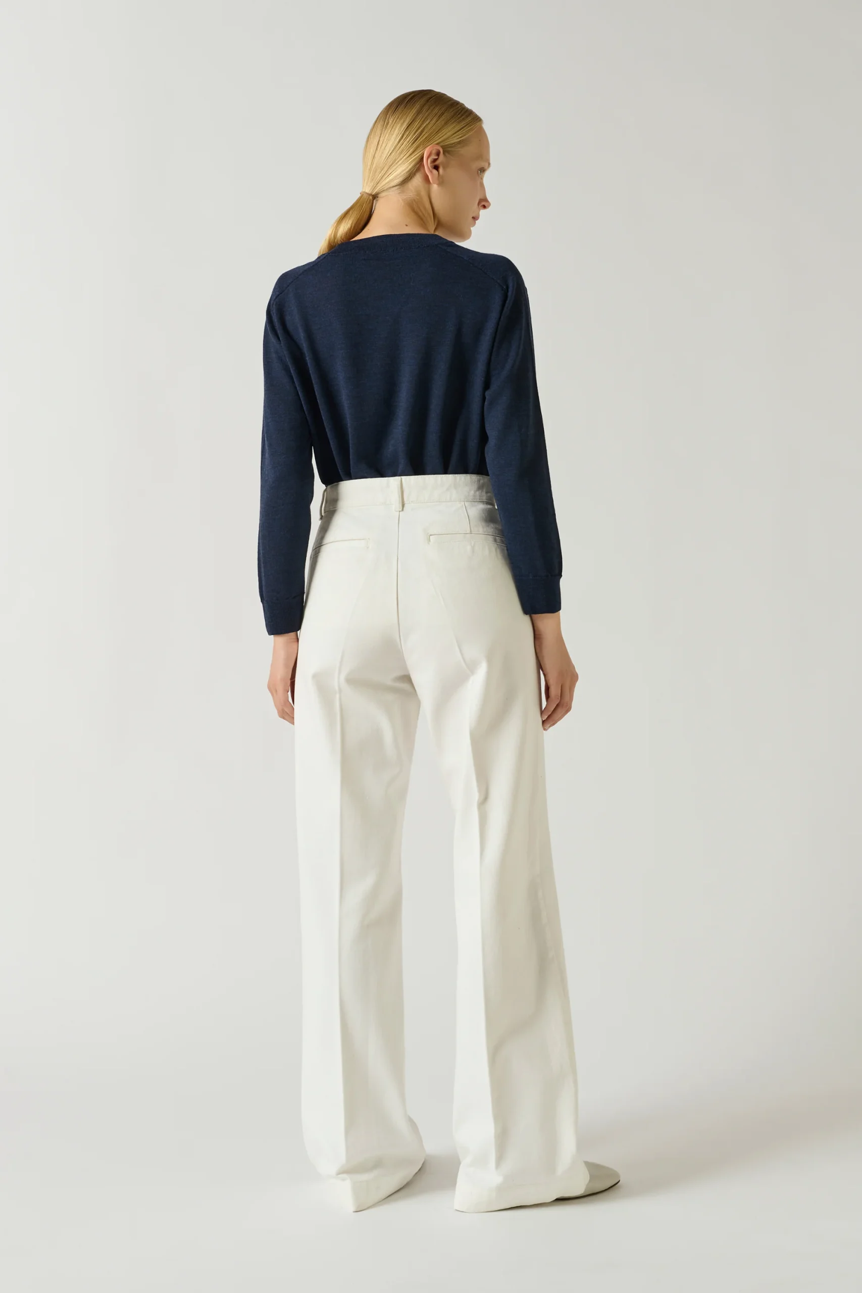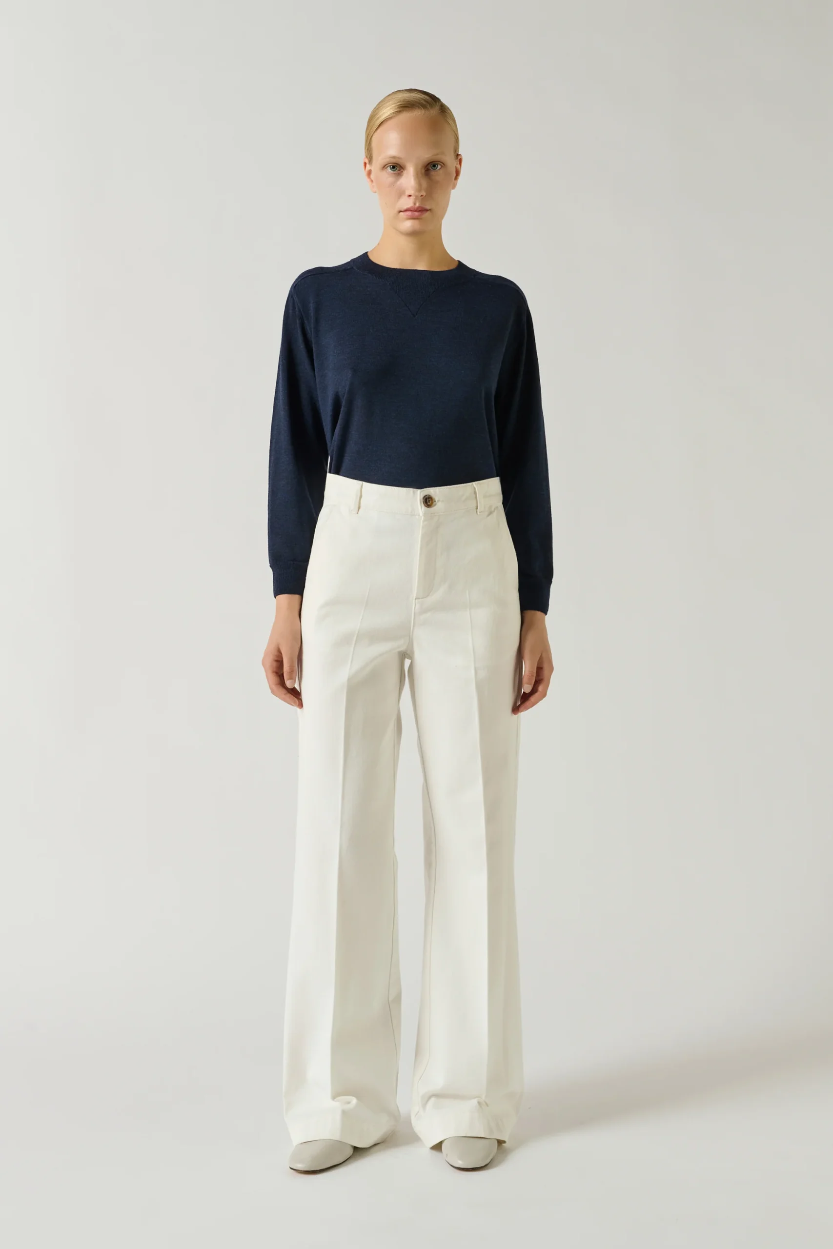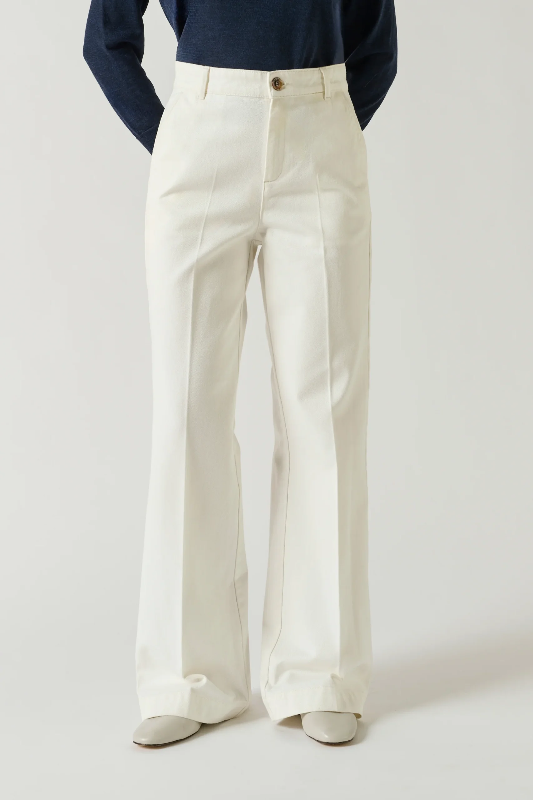 CALIFORNIA est un jean intemporel, iconique du vestiaire Sœur, à la coupe large et évasée. Sa taille est haute, il parfait une allure féminine et élancée. Cette version en denim épais craie (blanc cassé) est souple et confortable au quotidien.