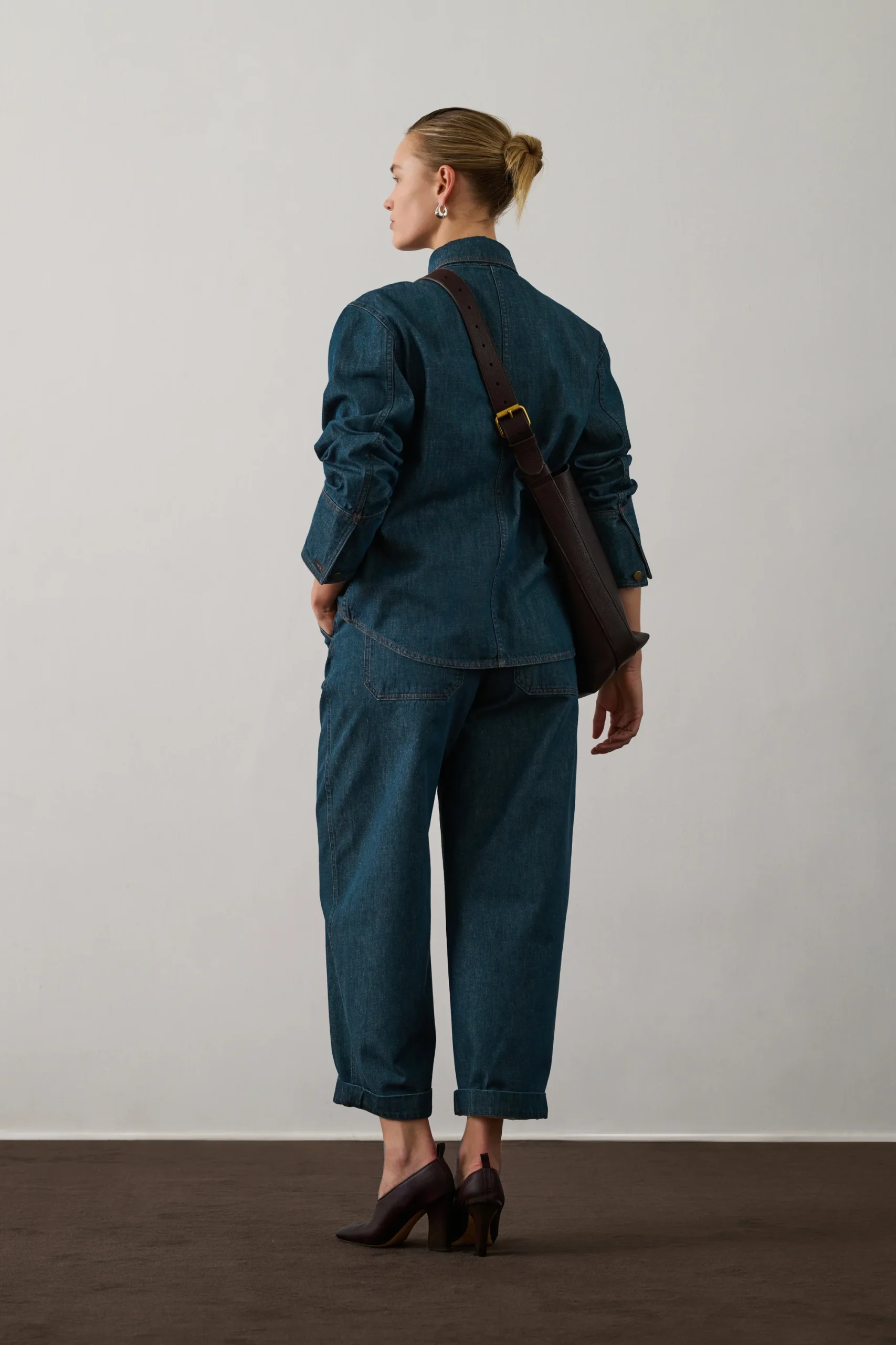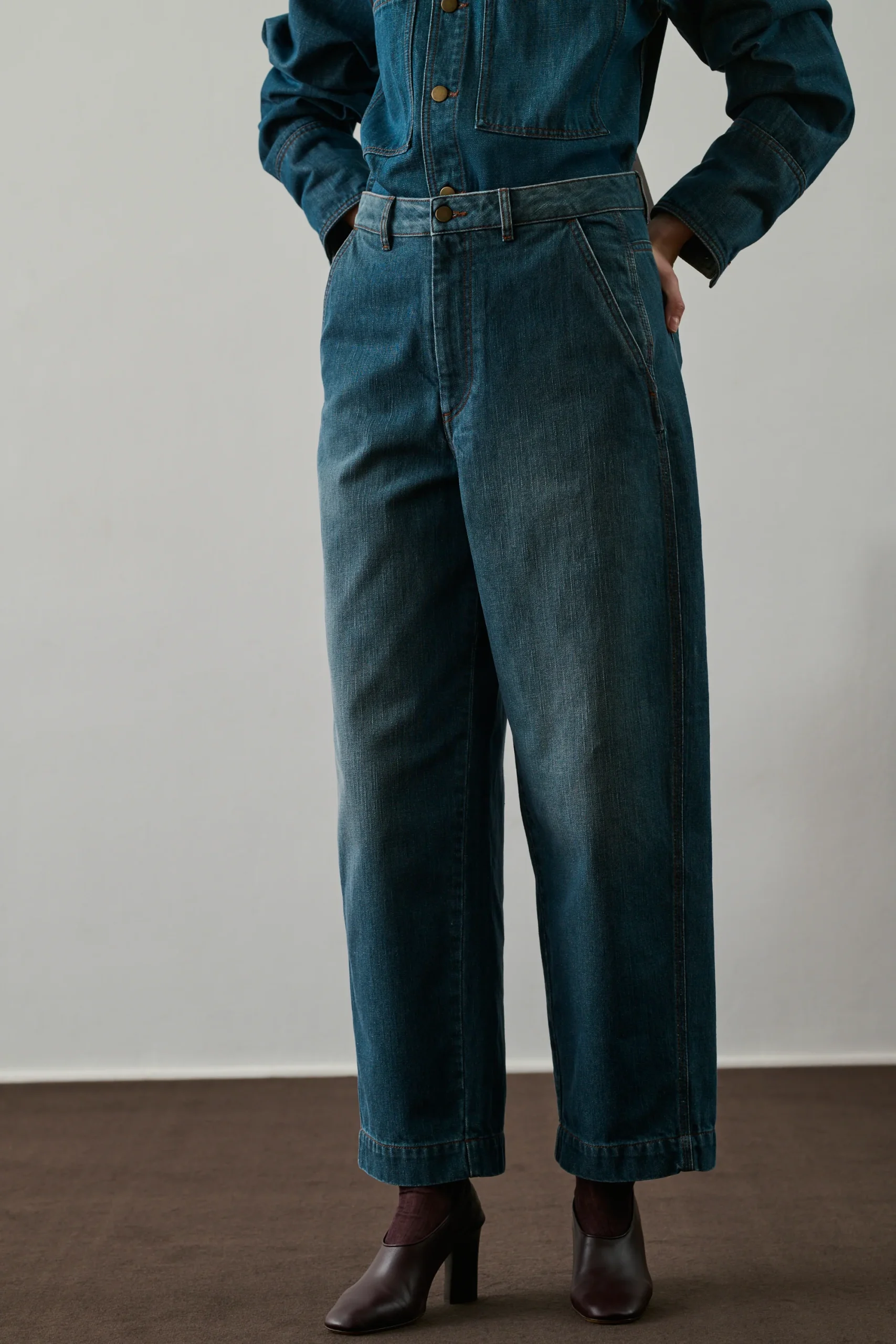 GABIN est un pantalon en denim greencast à la coupe ample et droite, taille mi-haute. Son délavage bleu-vert subtil révèle des nuances uniques. L’étiquette « Soeur » au dos ajoute une touche signature.