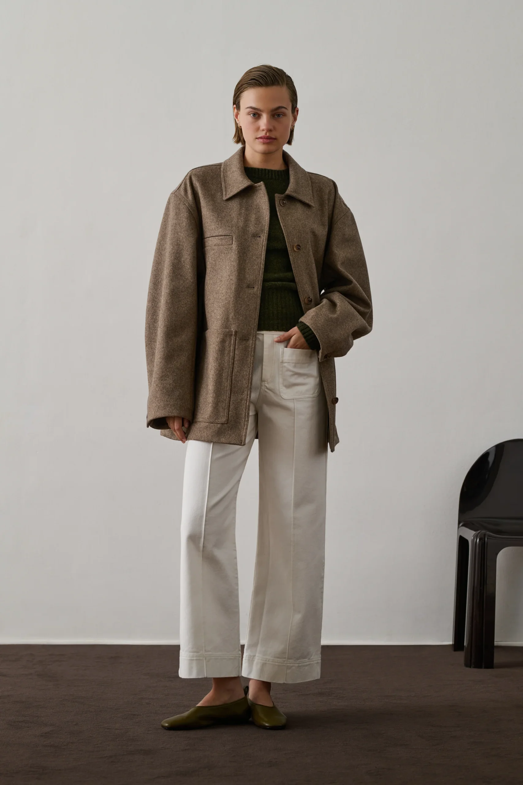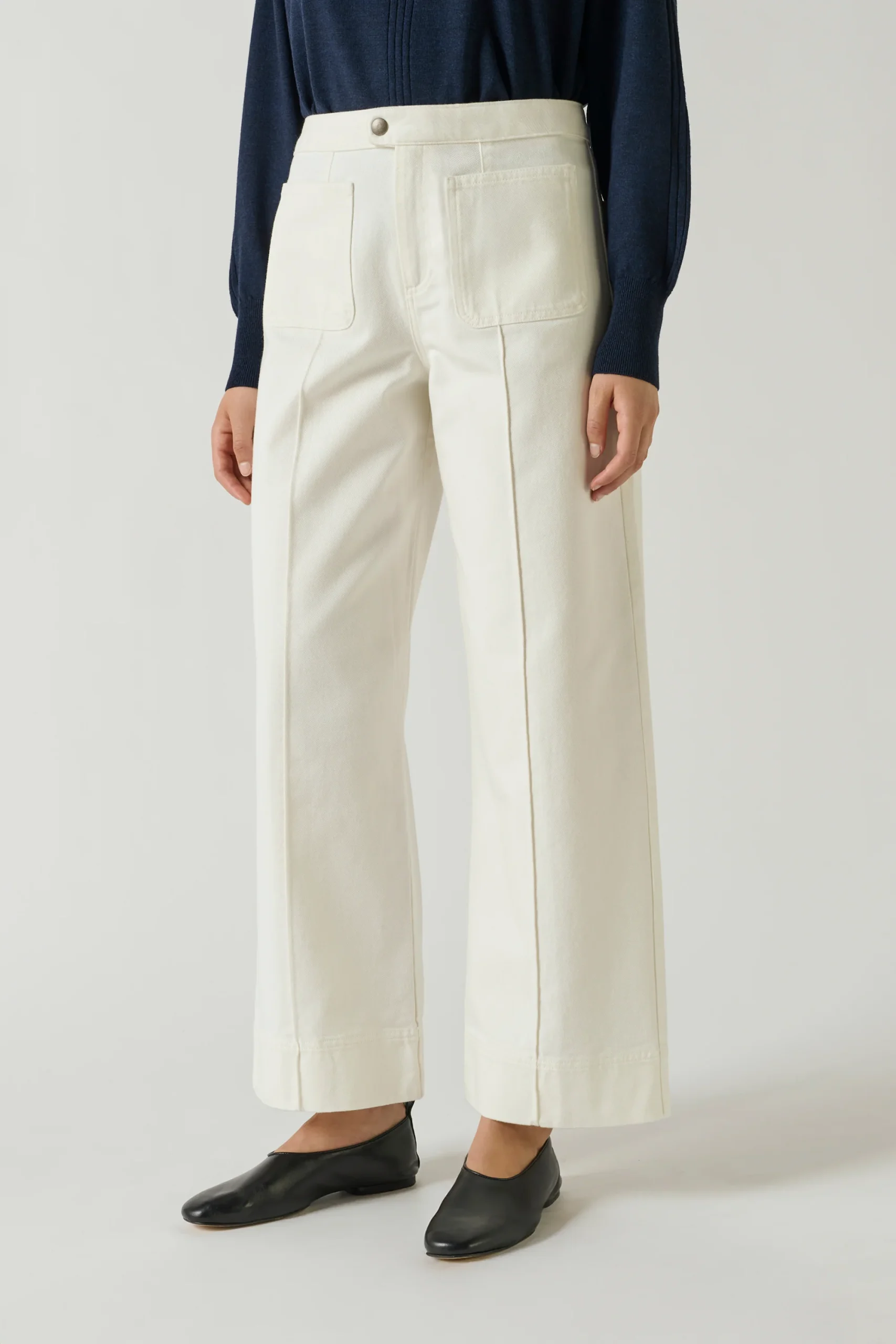 HARRY est un pantalon iconique du vestiaire Soeur, identifiable par ses poches plaquées à l’avant et à l’arrière et son pli marqué le long de la jambe. Il convient à toutes les morphologies grâce à sa coupe légèrement évasée et sa longueur 7/8e suspendue sur la cheville qui allonge la silhouette. Cette version en denim épais craie (blanc cassé) est souple et confortable au quotidien.