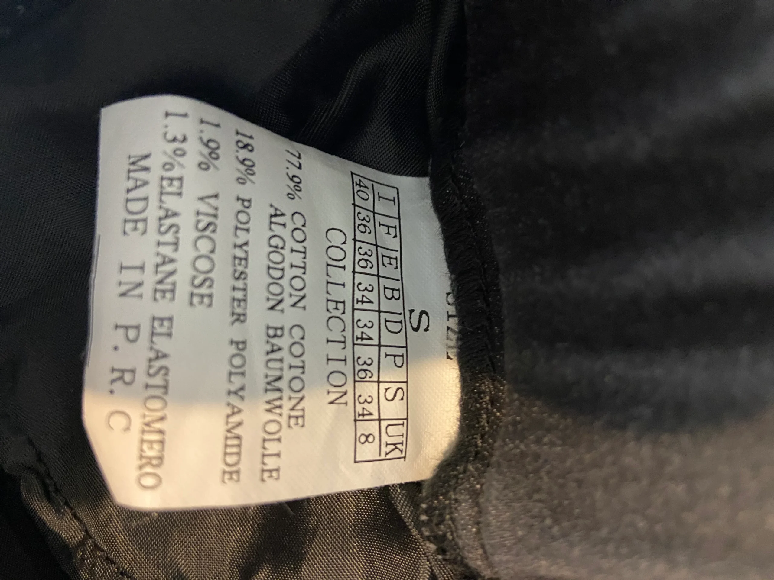 Matière : 77,9% coton – 18,9% polyester – 1,9% viscose – 1,3% élasthanne.