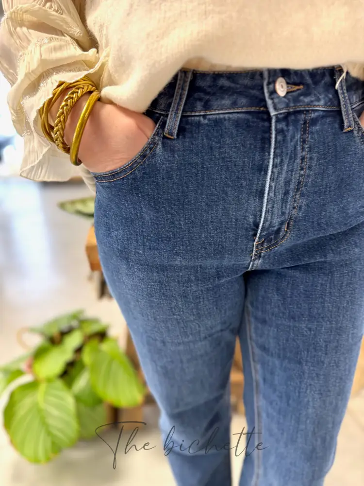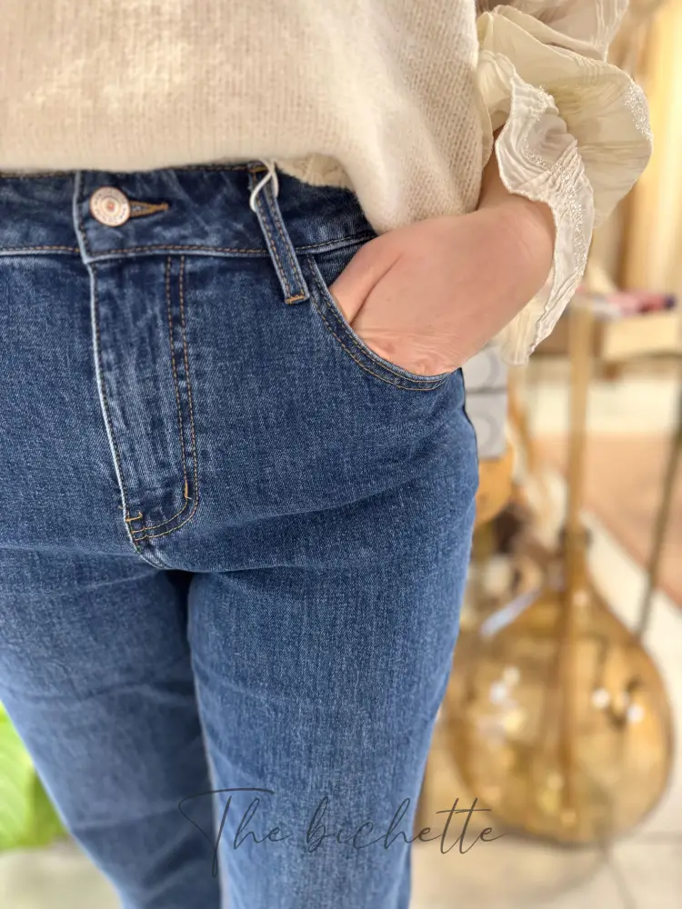 Jean Solange, un jean à coupe droite • Oraije Taille haute Passant pour ceinture Fermeture par bouton et zip 5 poches Coupe courte : idéale pour les bichettes mesurant moins de 1,70m