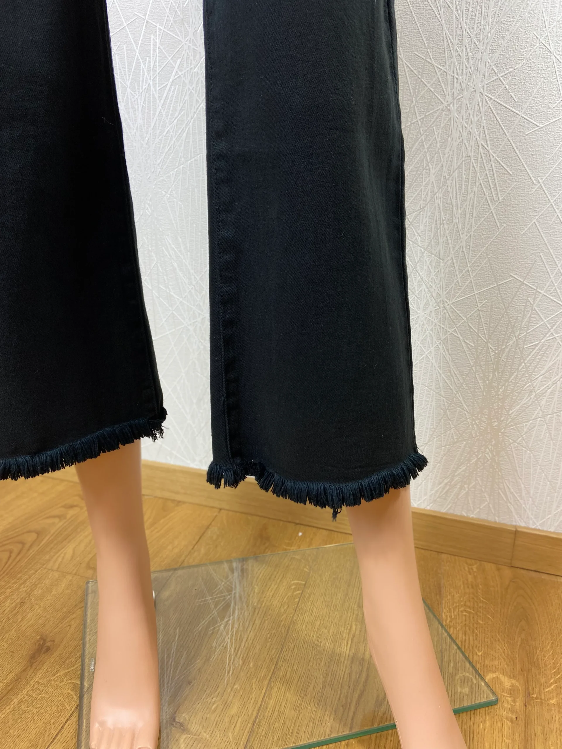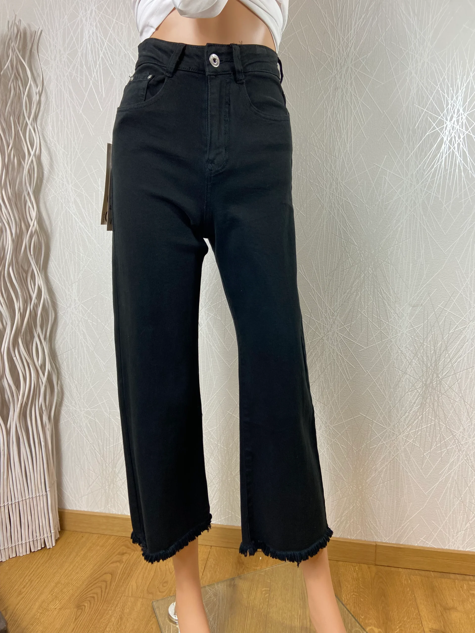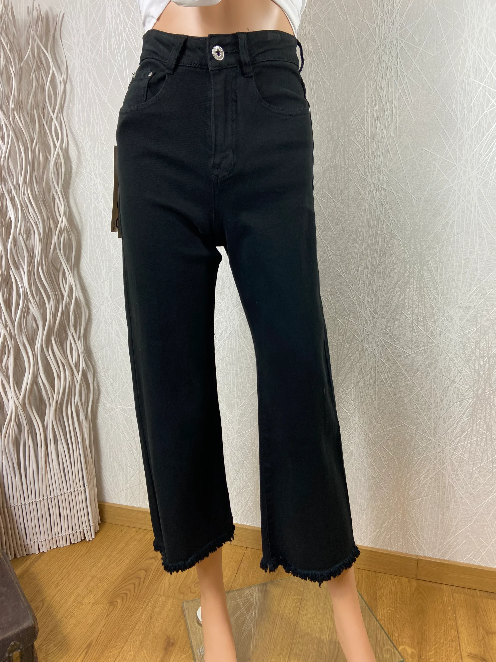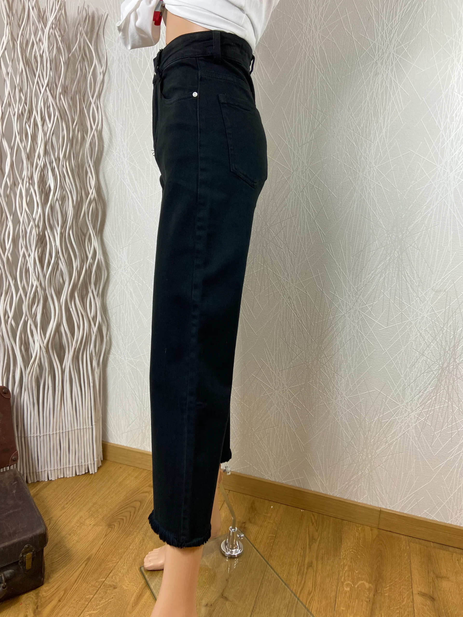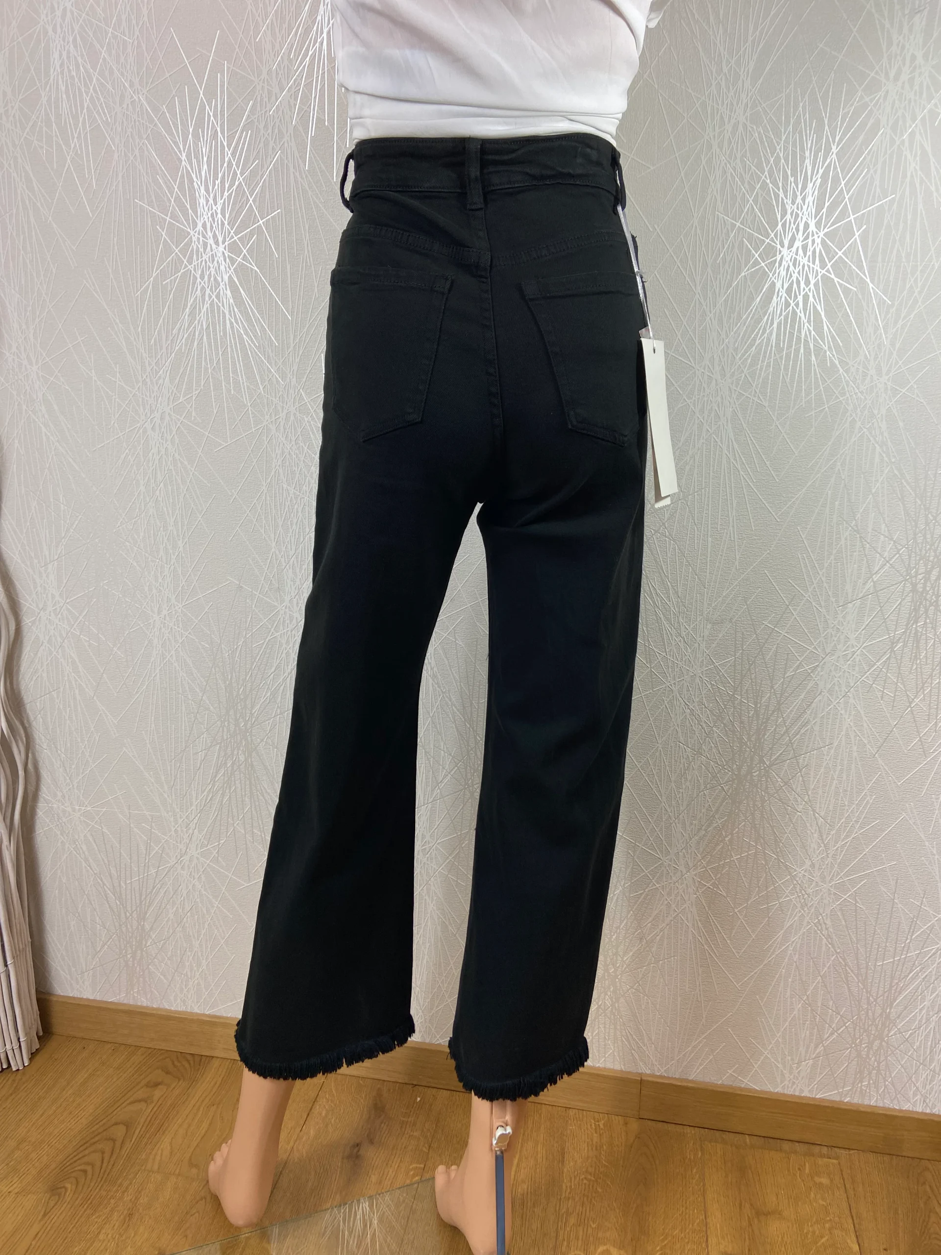 Taille haute, coupe ample, ourlet effiloché frangé sur le bas, 3 poches à l’avant et 2 poches à l’arrière, passants pour ceinture, fermeture avec bouton et zip.