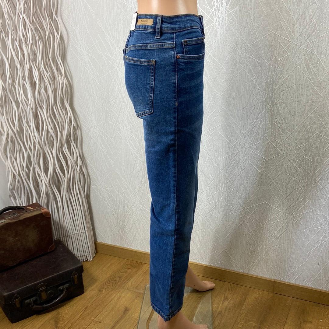 Taille normale, effet délavé sur l’avant, 3 poches à l’avant, 2 poches à l’arrière, fermeture bouton et zip.
