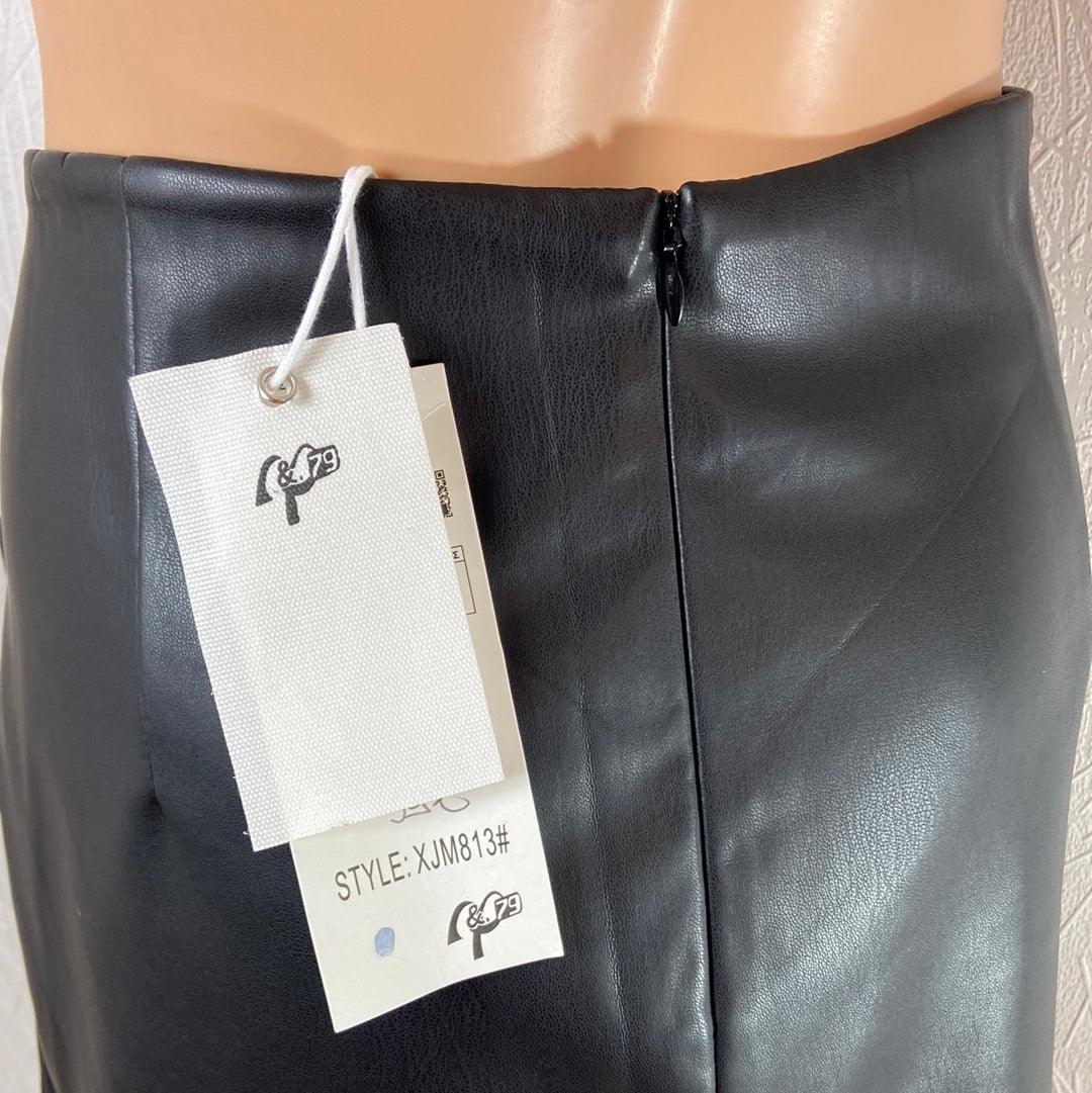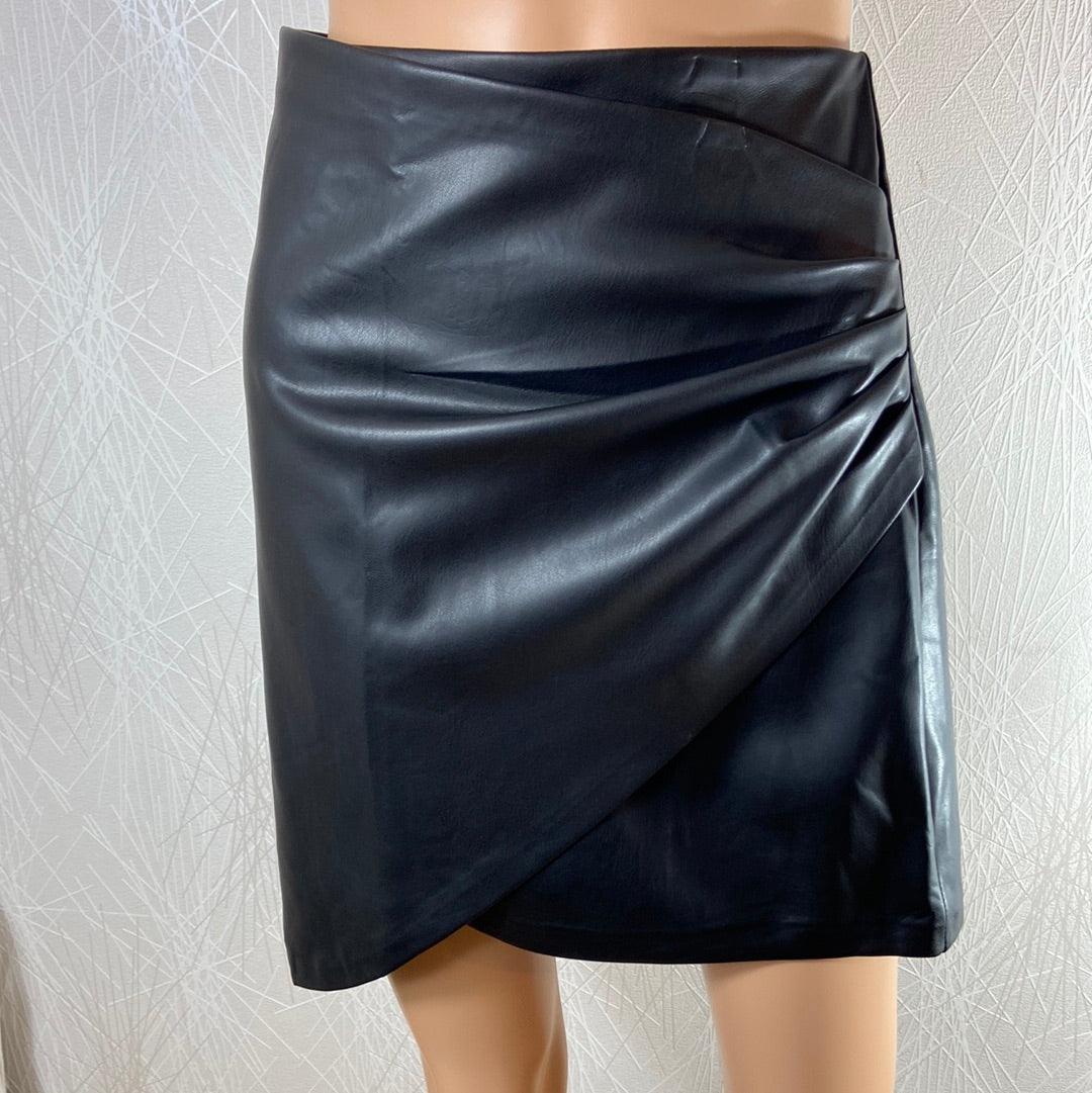 Jupe courte en cuir synthétique noir, taille mi-haute avec jeux de plis sur le côté et fermeture zip dans le dos.