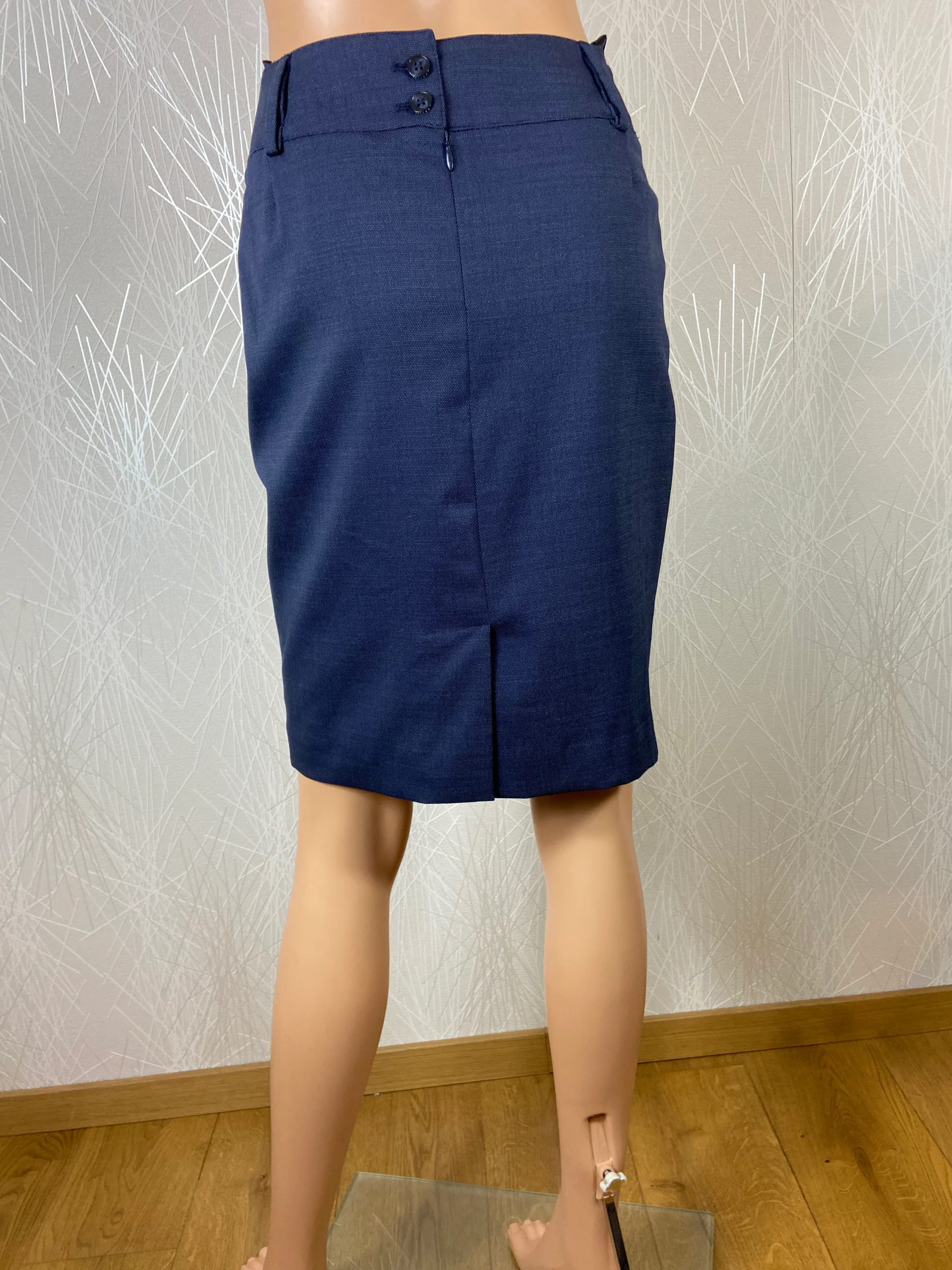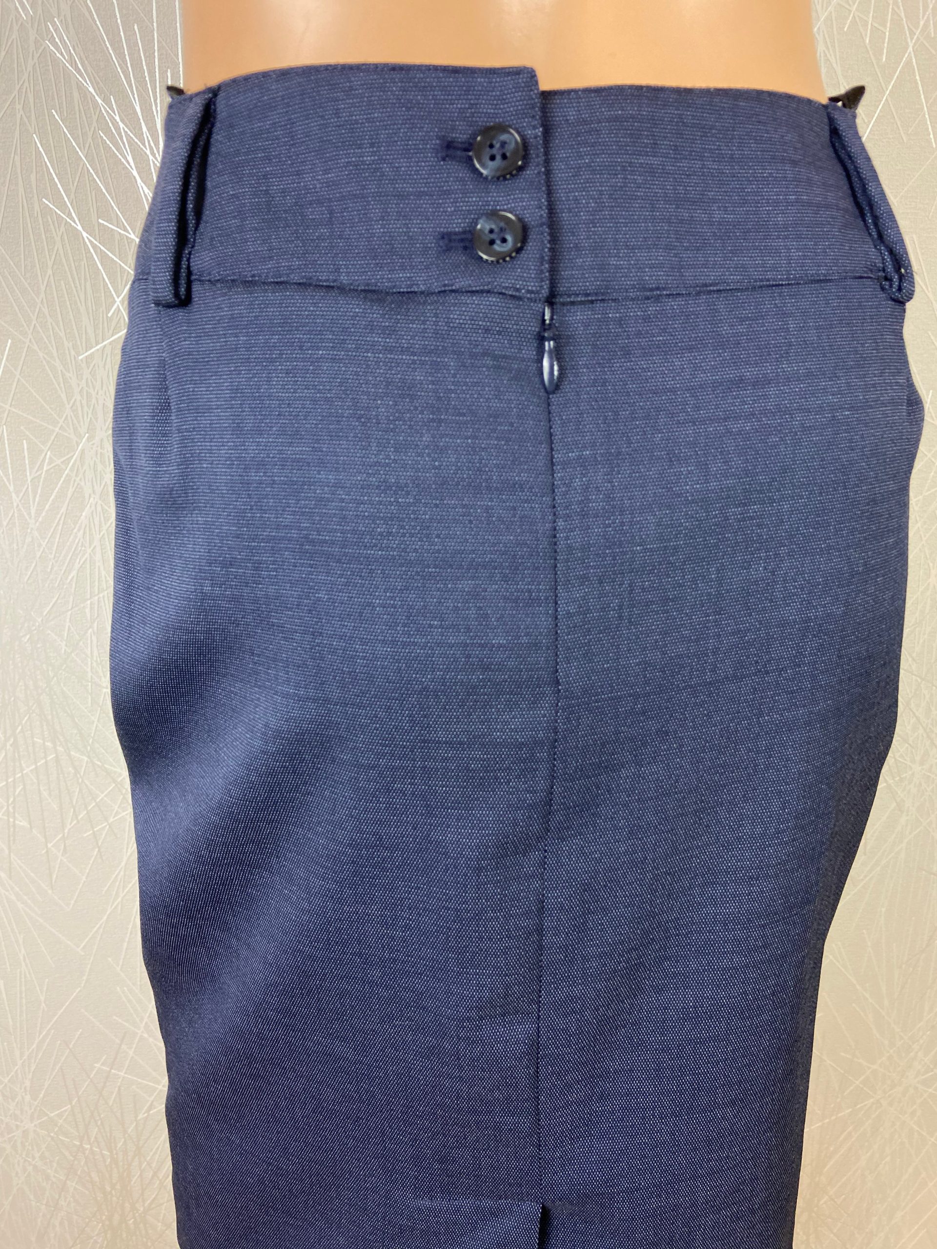 Jupe crayon, doublée, 2 poches passepoilées à l’avant, large ceinture à la taille, fermeture avec zip et 2 boutons à l’arrière.