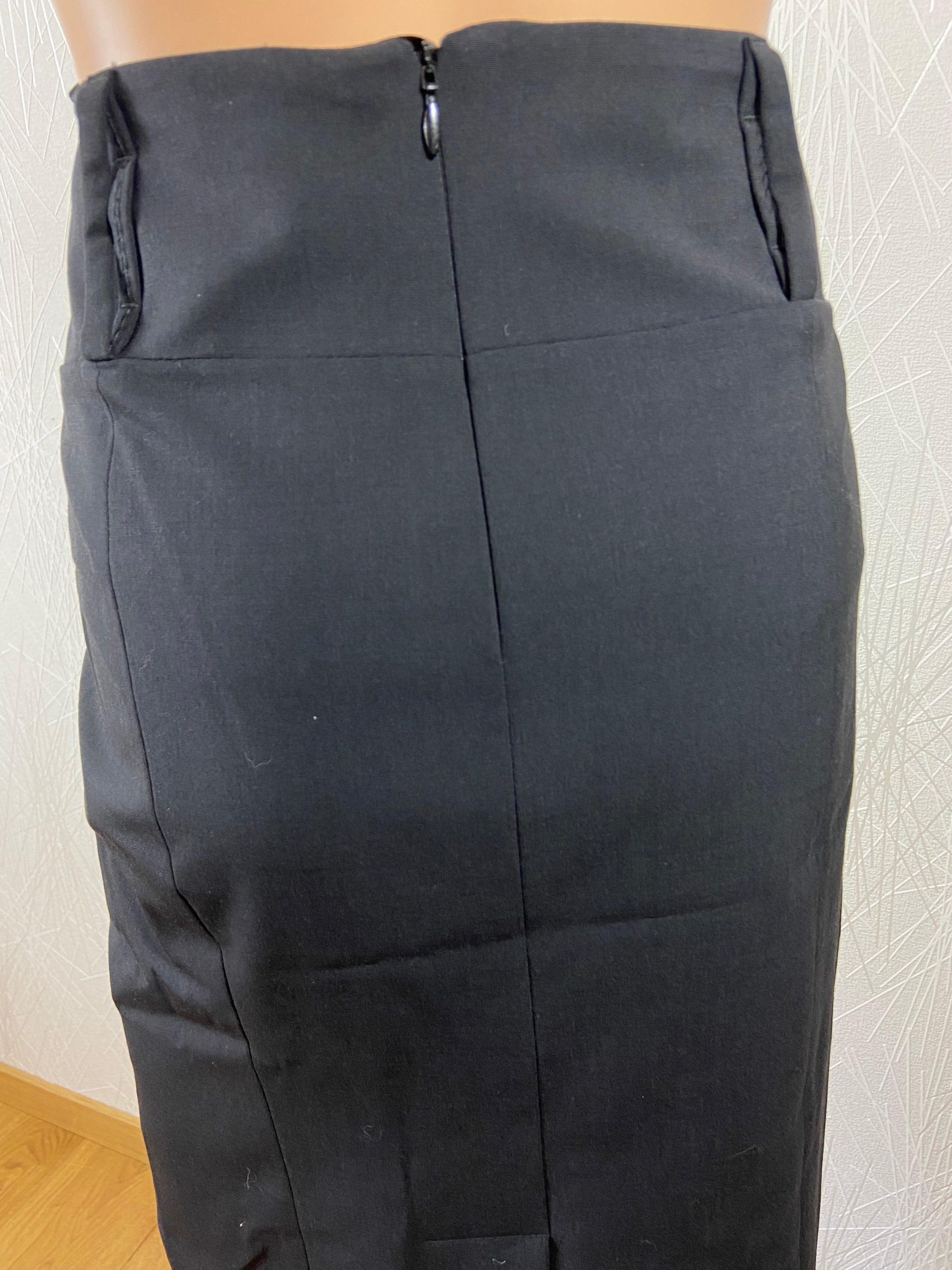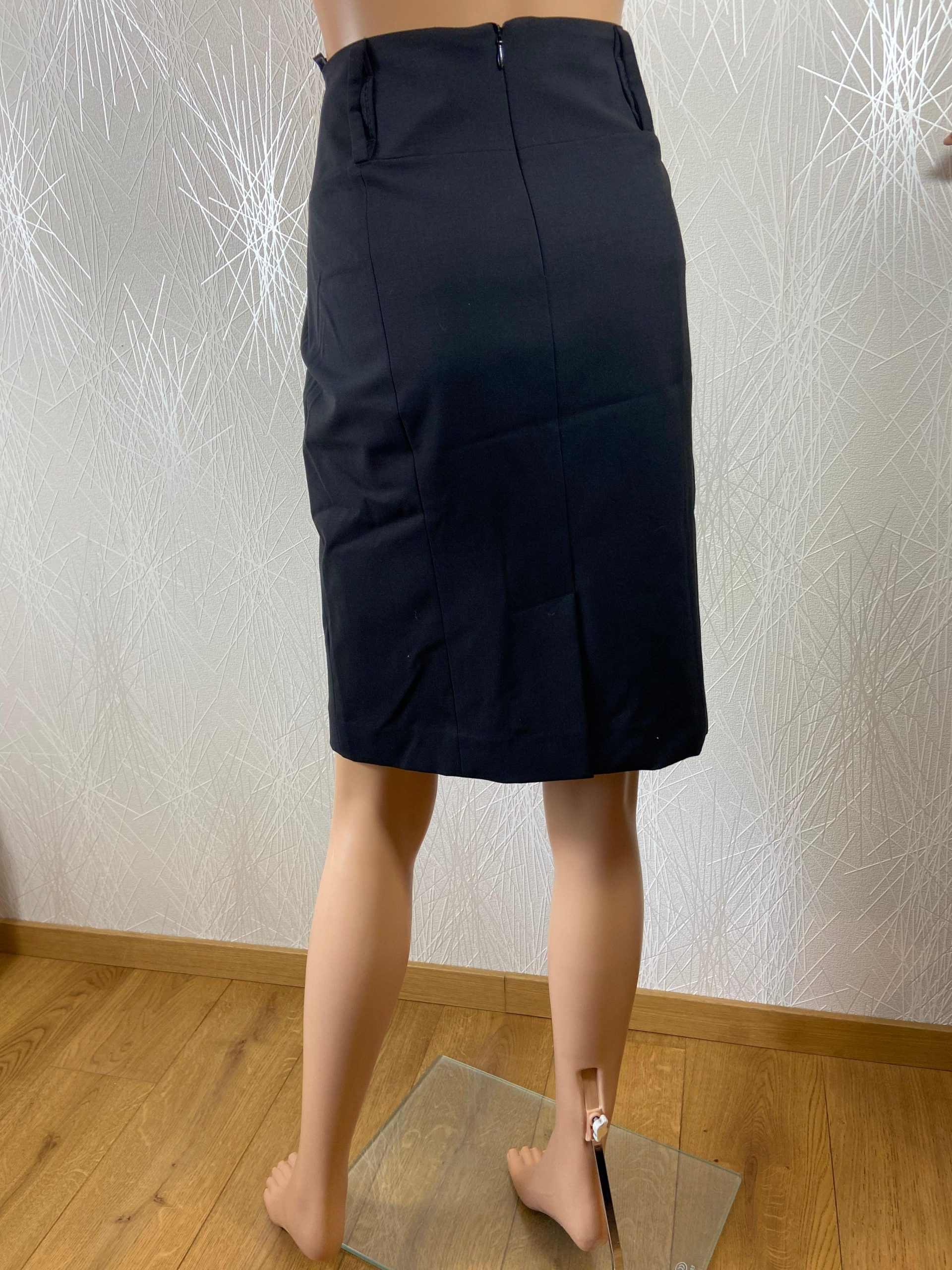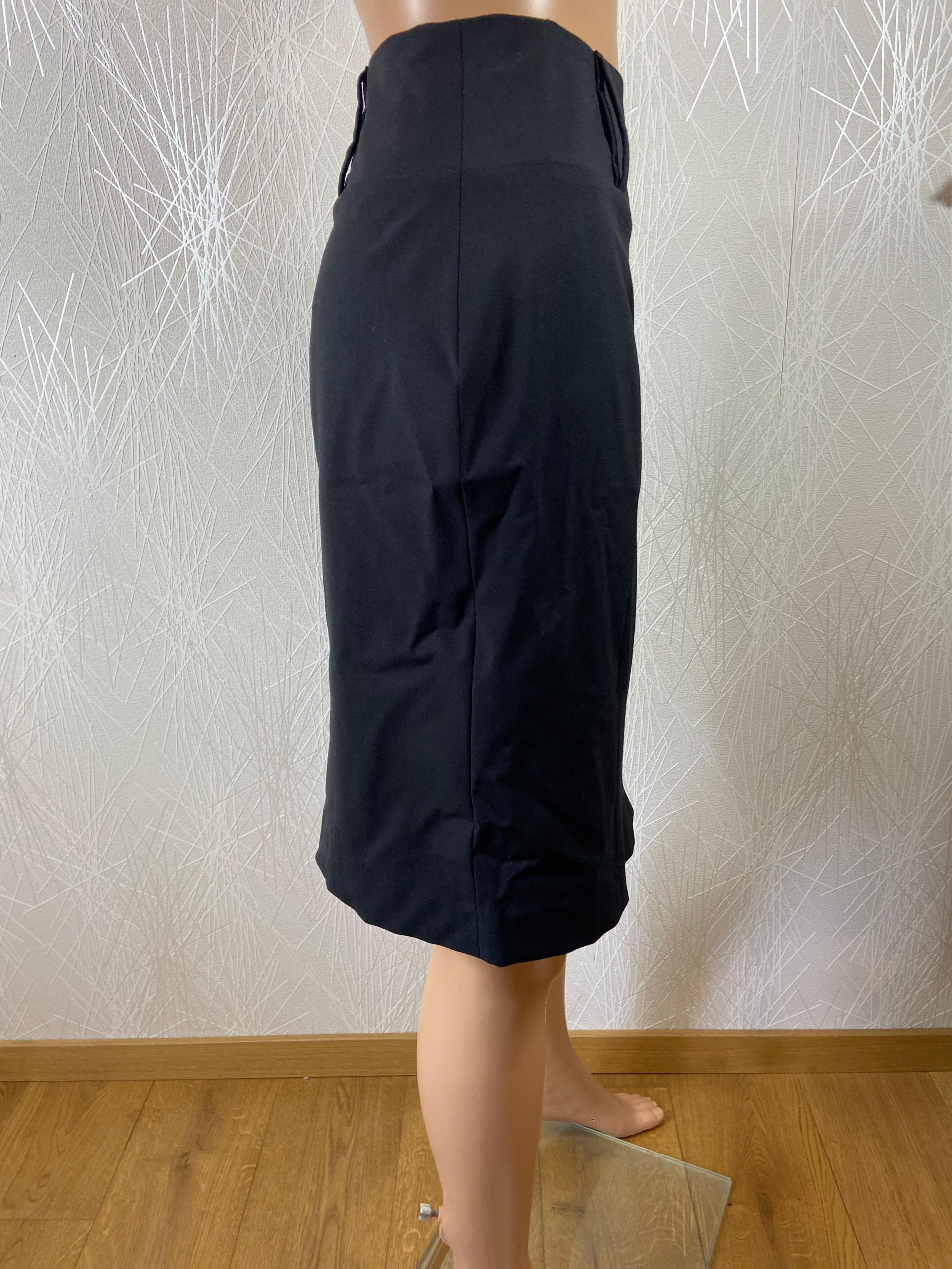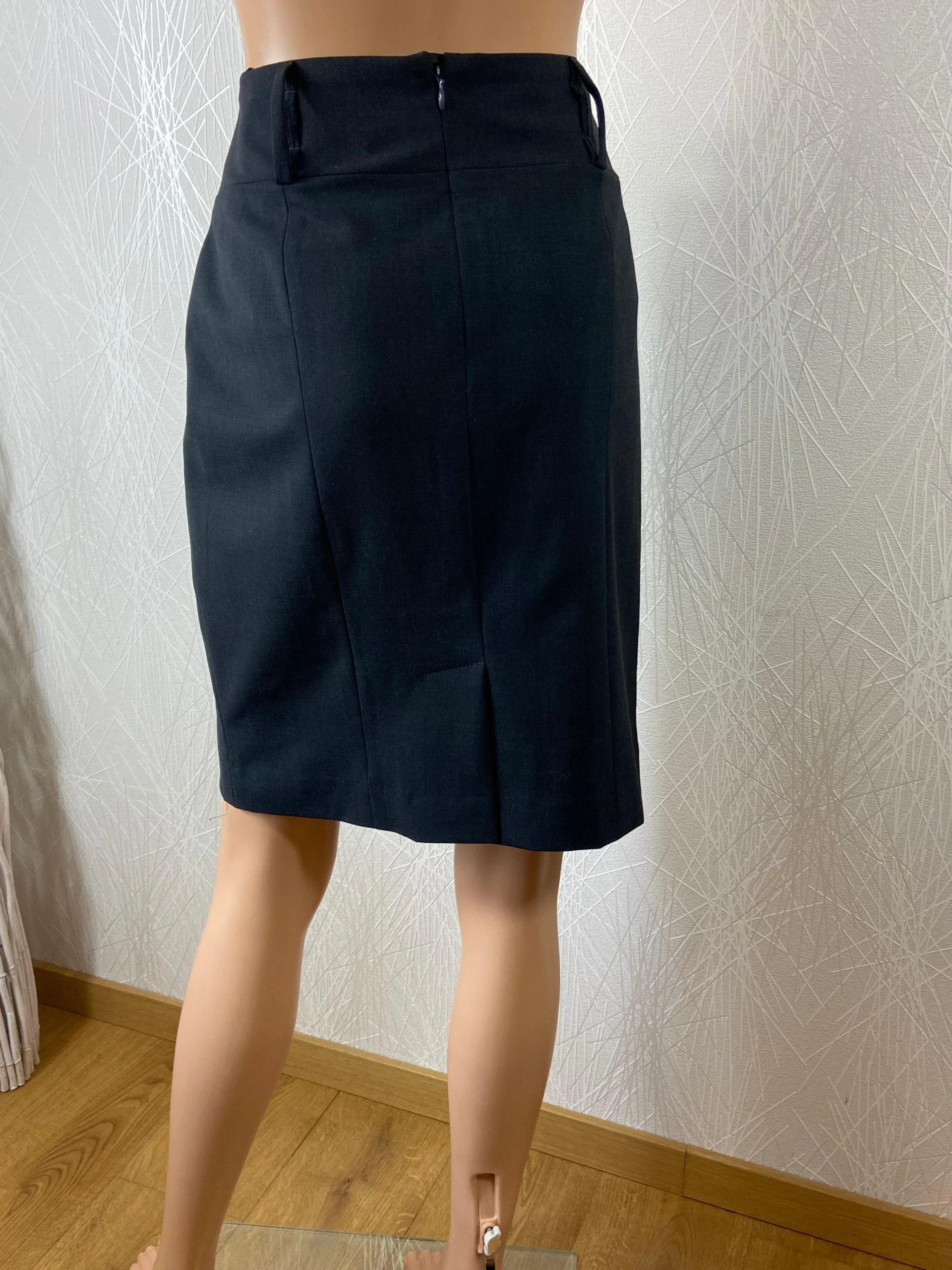 Jupe doublée, large ceinture à la taille, fente d’aisance à l’arrière masquée, fermeture avec zip et bouton caché.