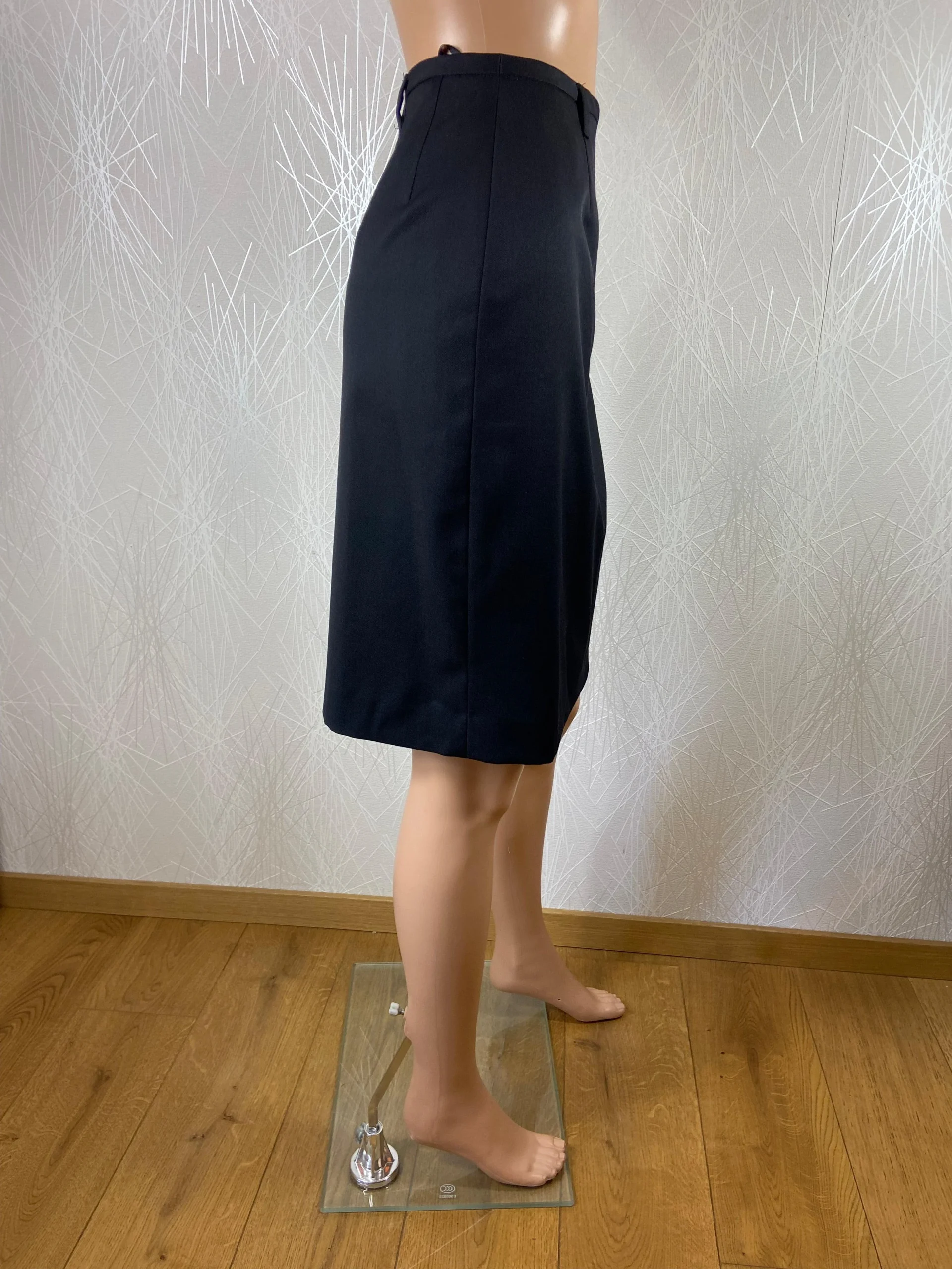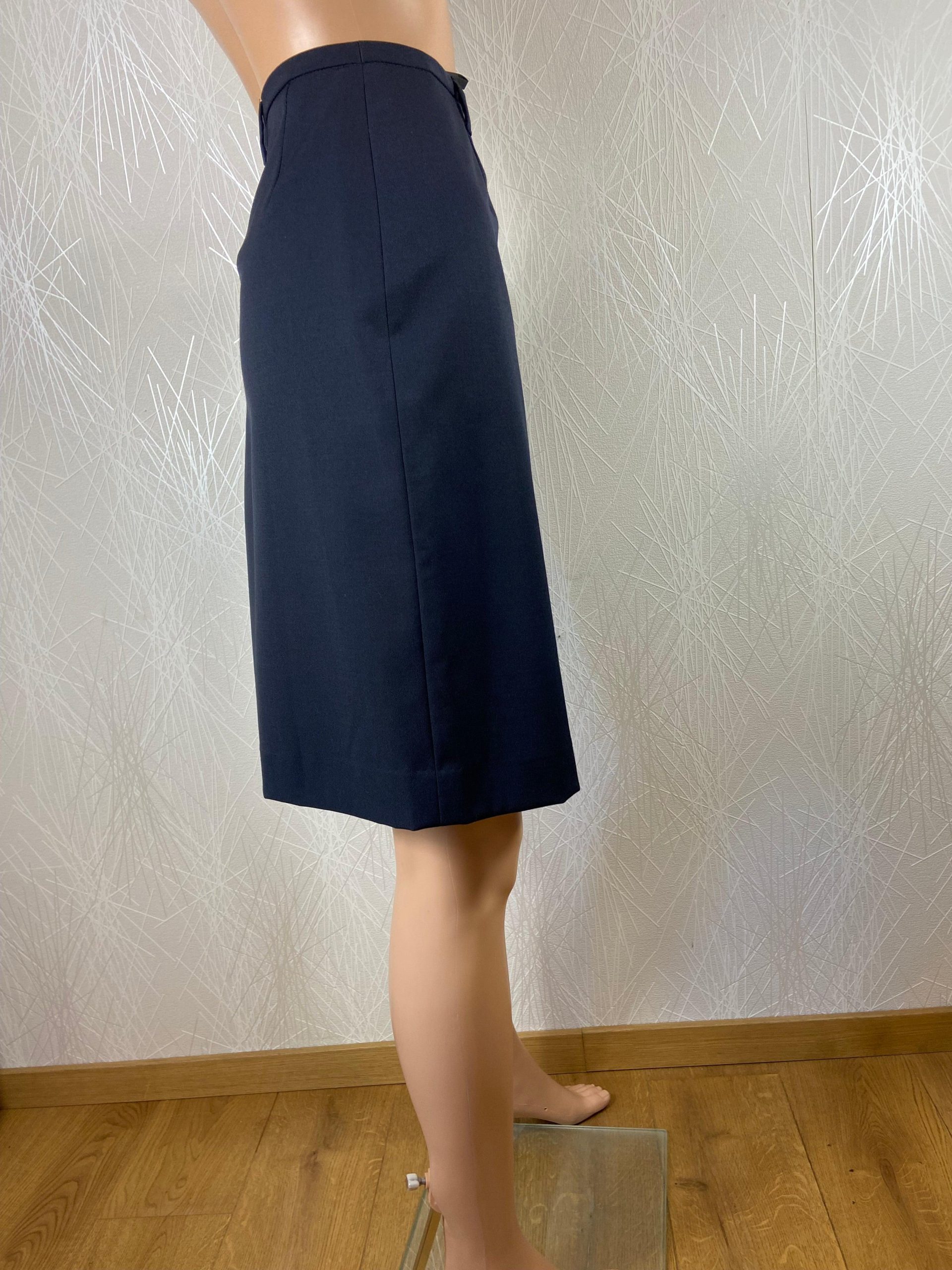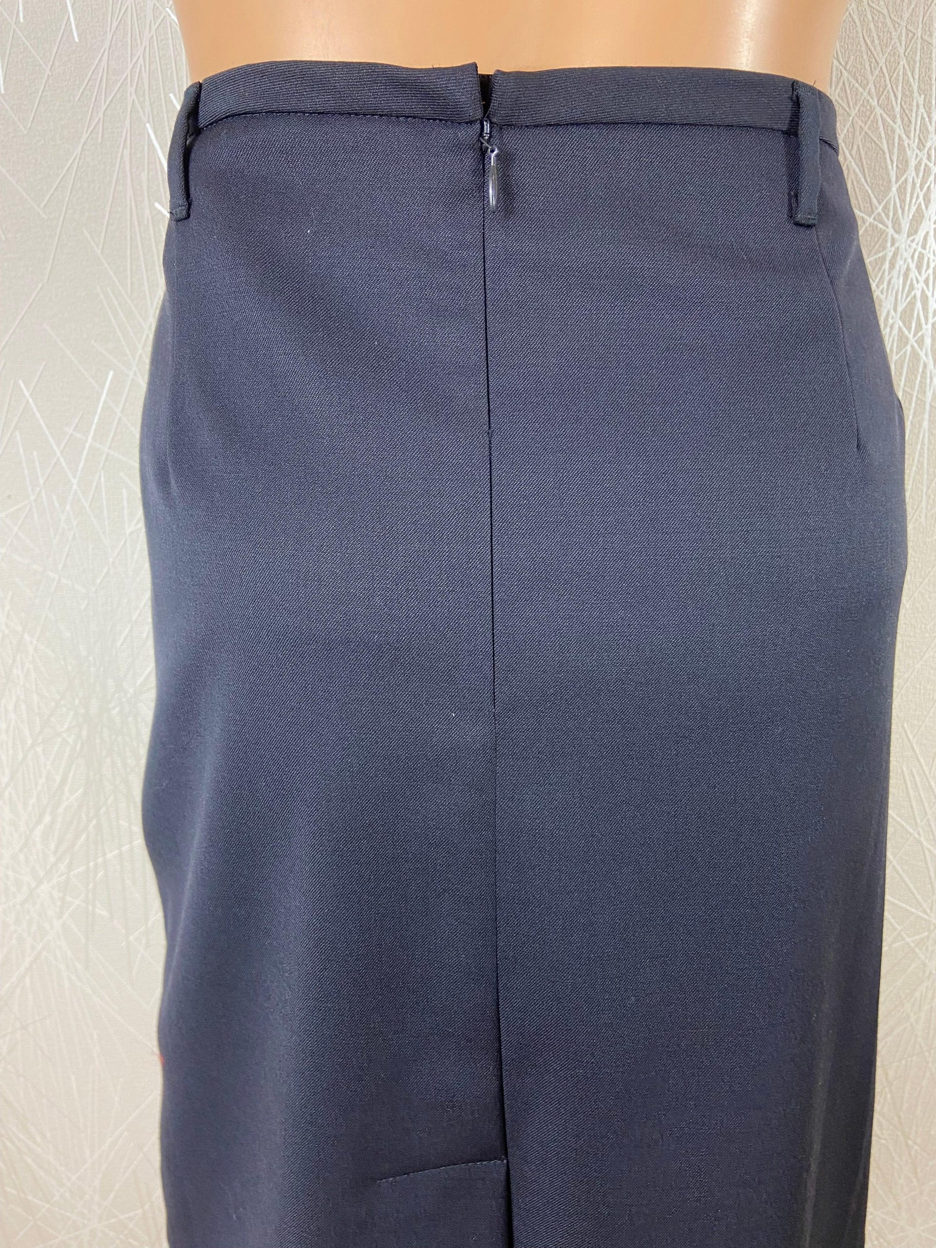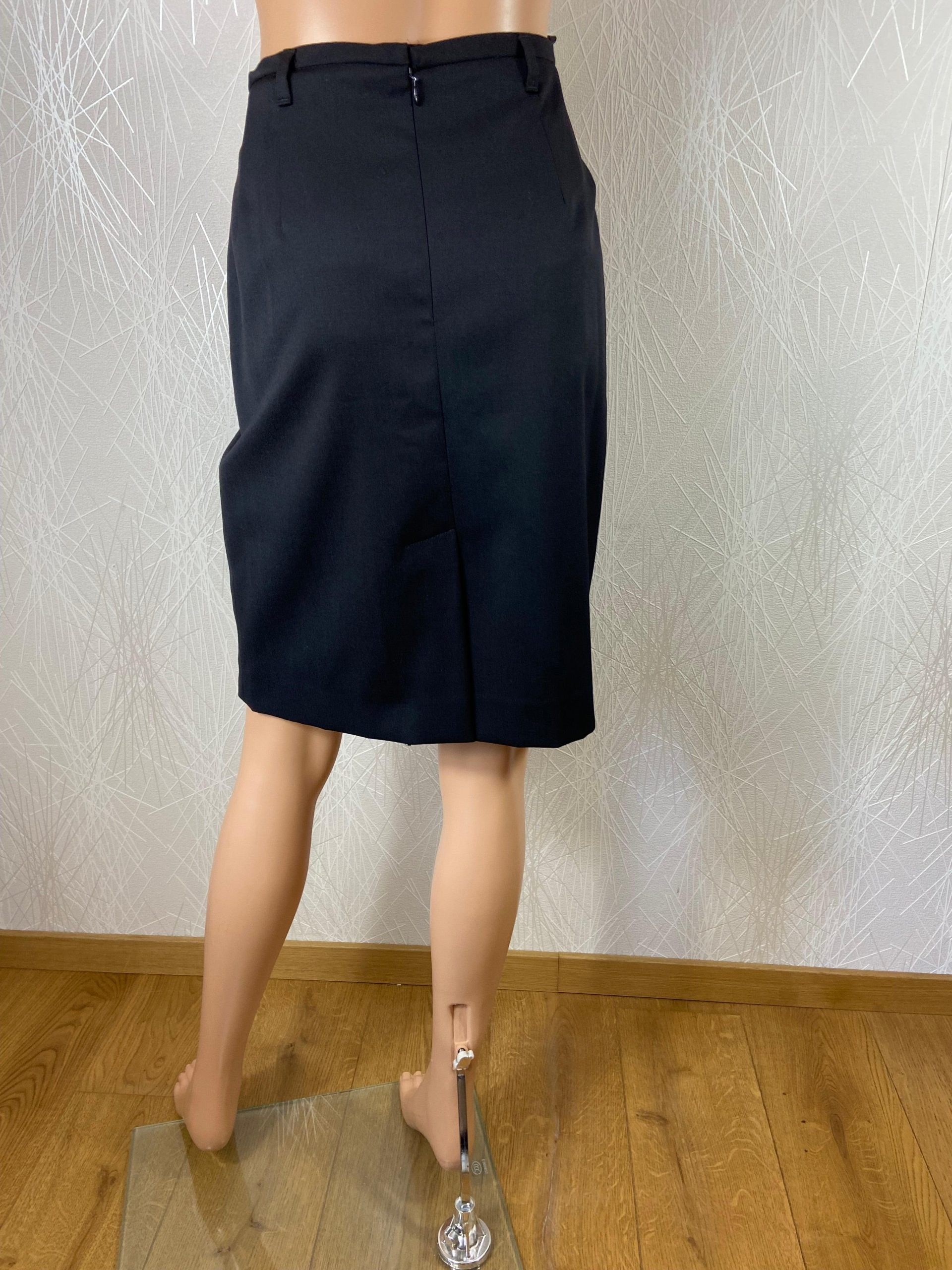 Jupe doublée, taille normale, coupe droite, fente d’aisance à l’arrière, passants pour ceinture, fermeture zip et bouton à l’arrière.