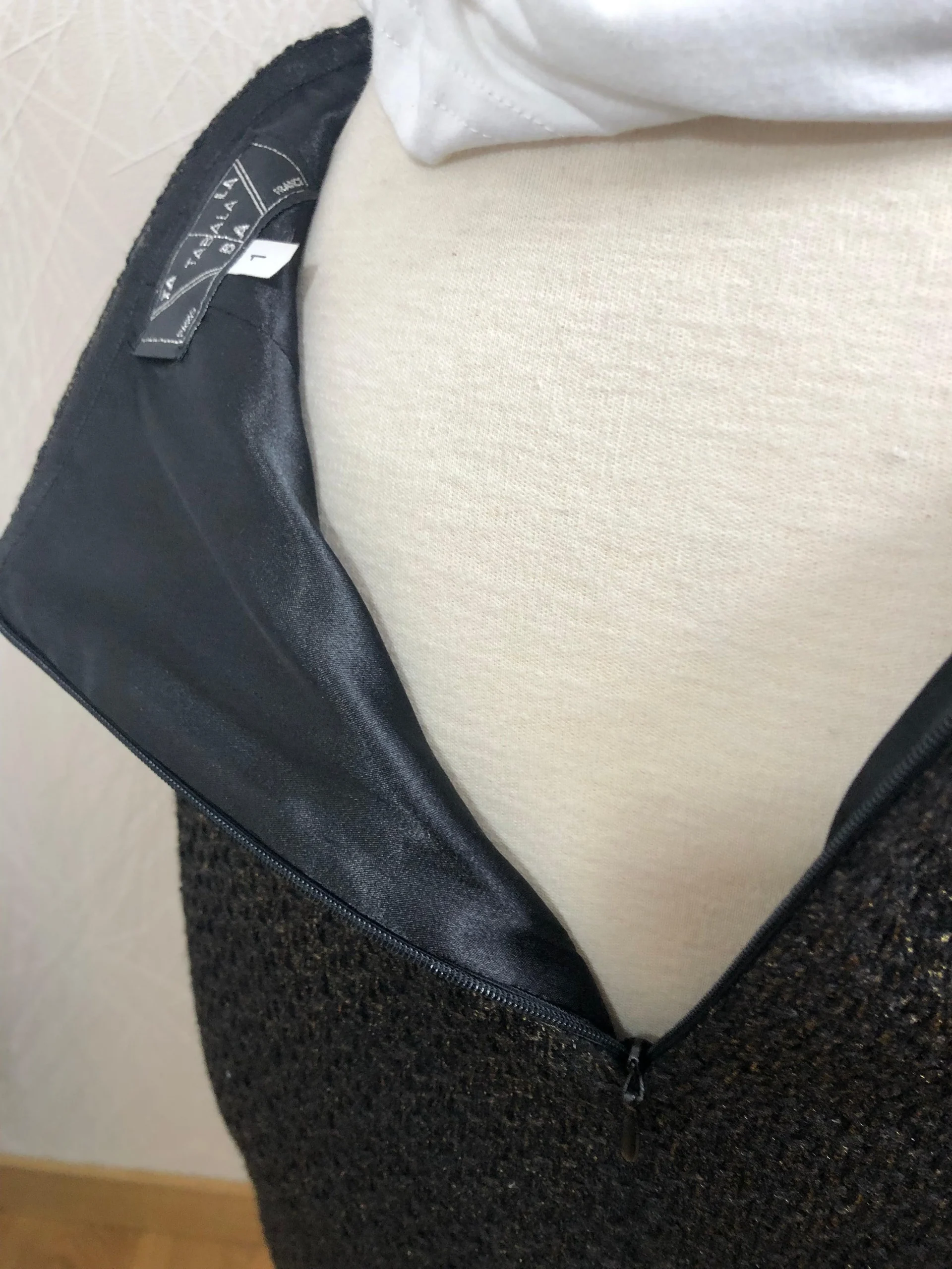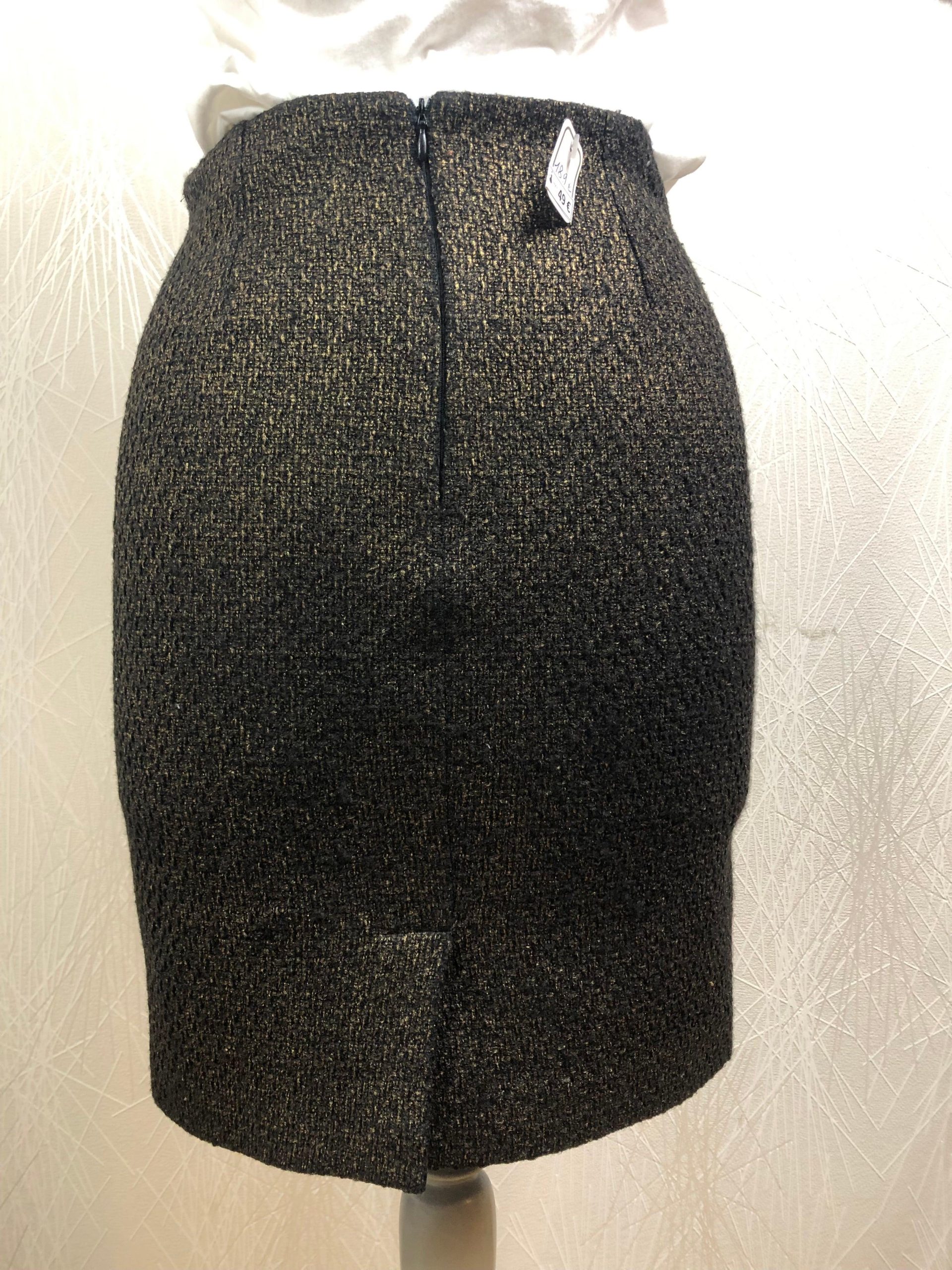 Cette jupe noire est confectionnée dans un magnifique tissu en laine de couleur noire et dorée, La coupe est droite, avec une fente à l’arrière, se ferme avec un zip dans le dos.