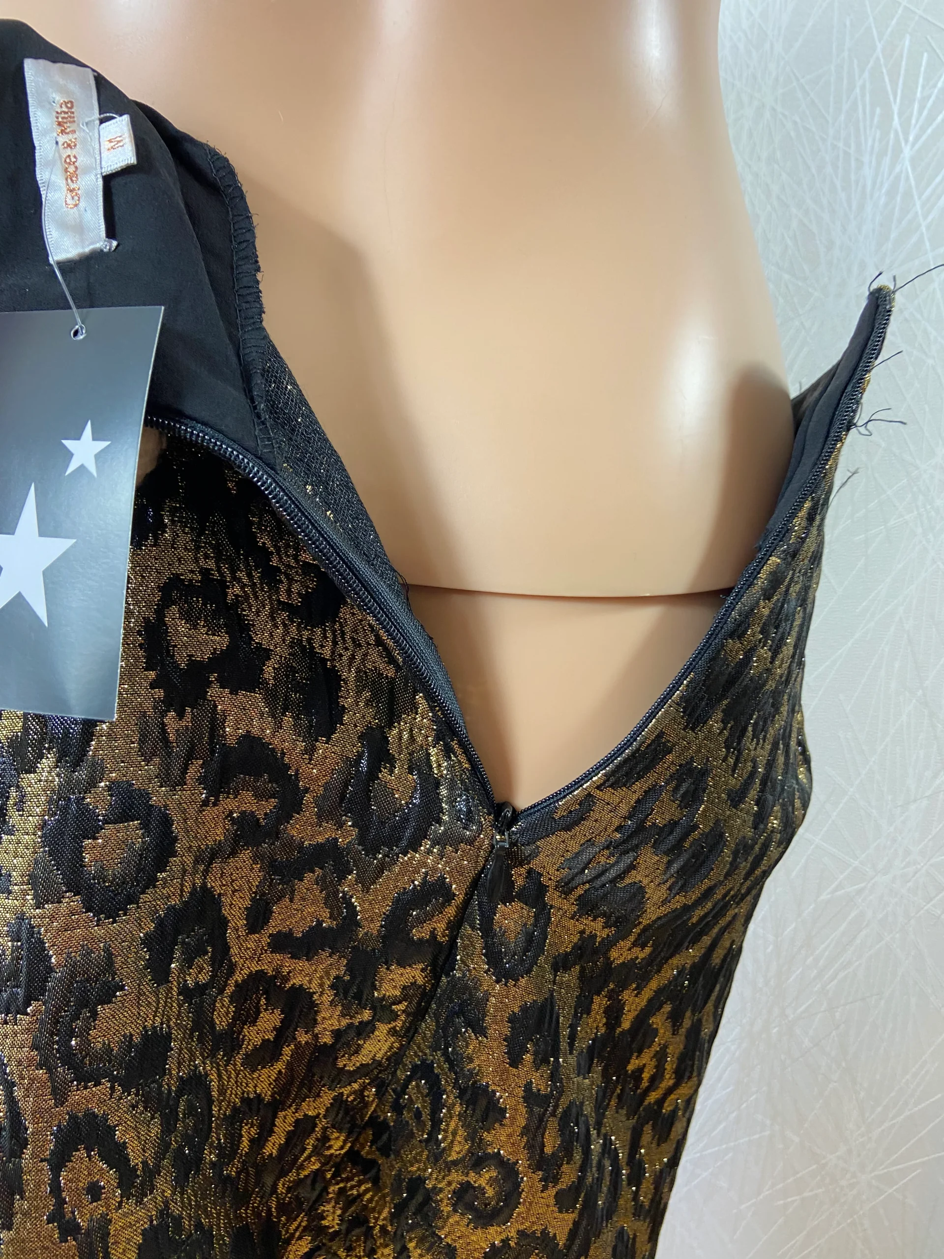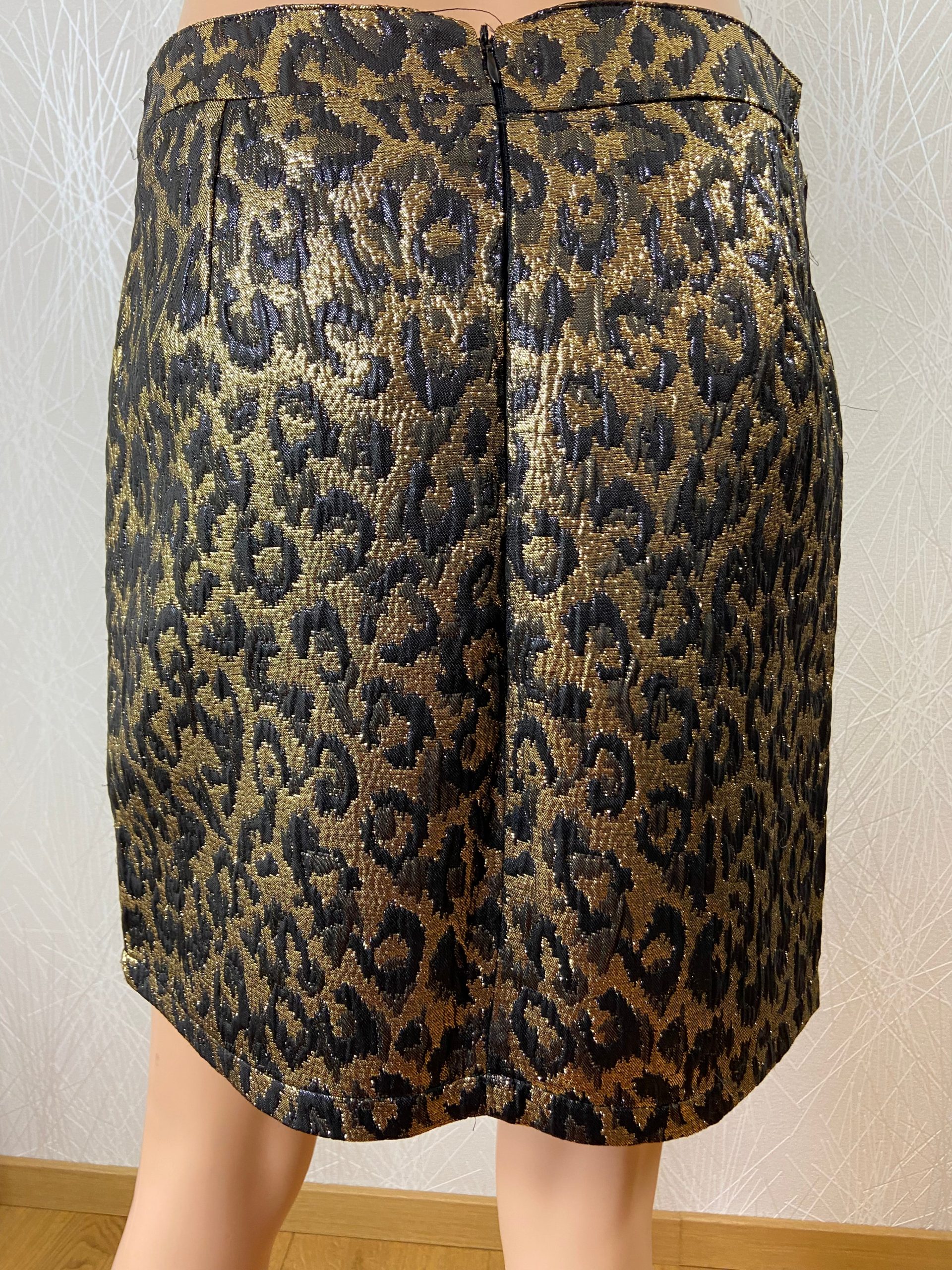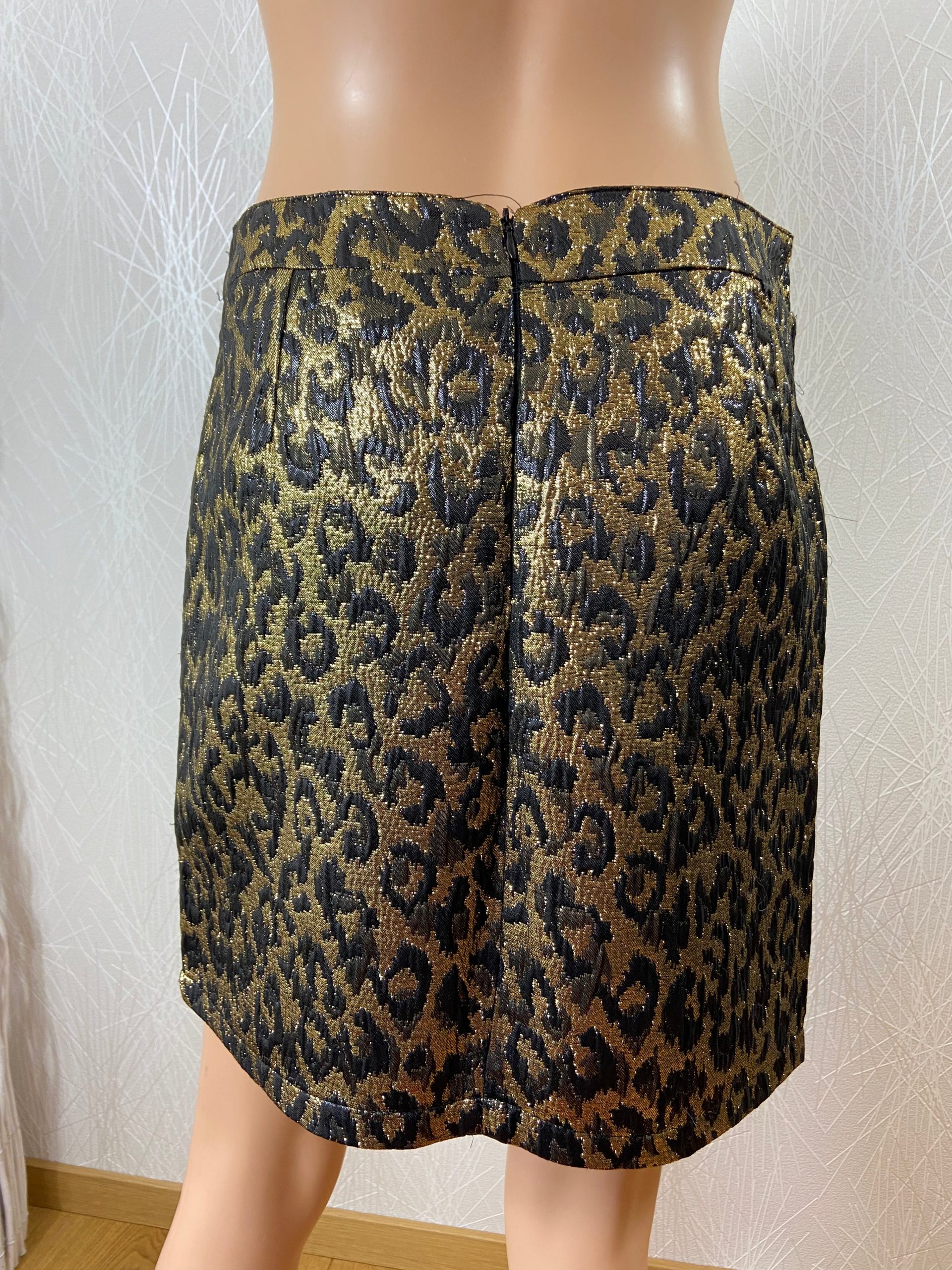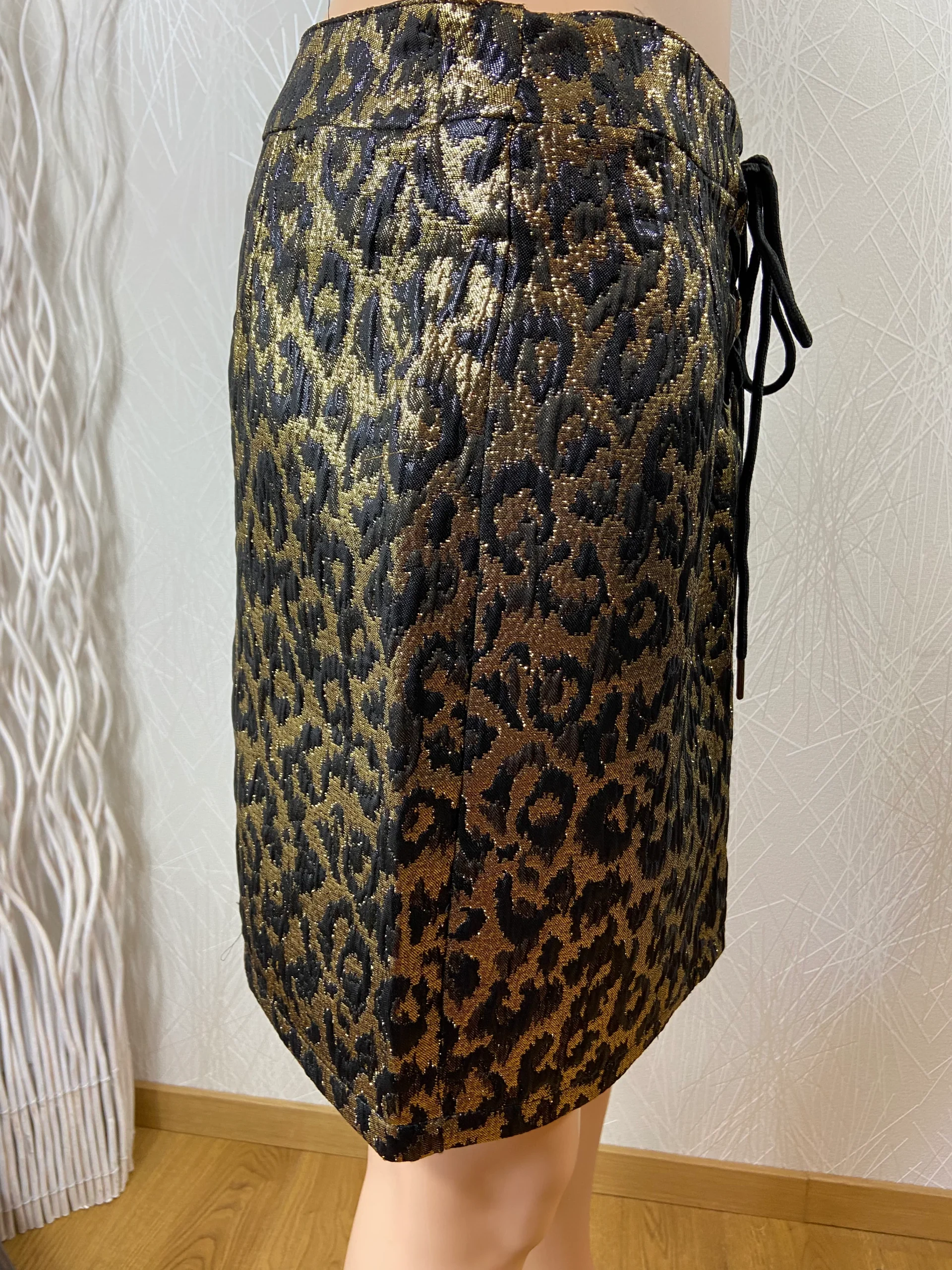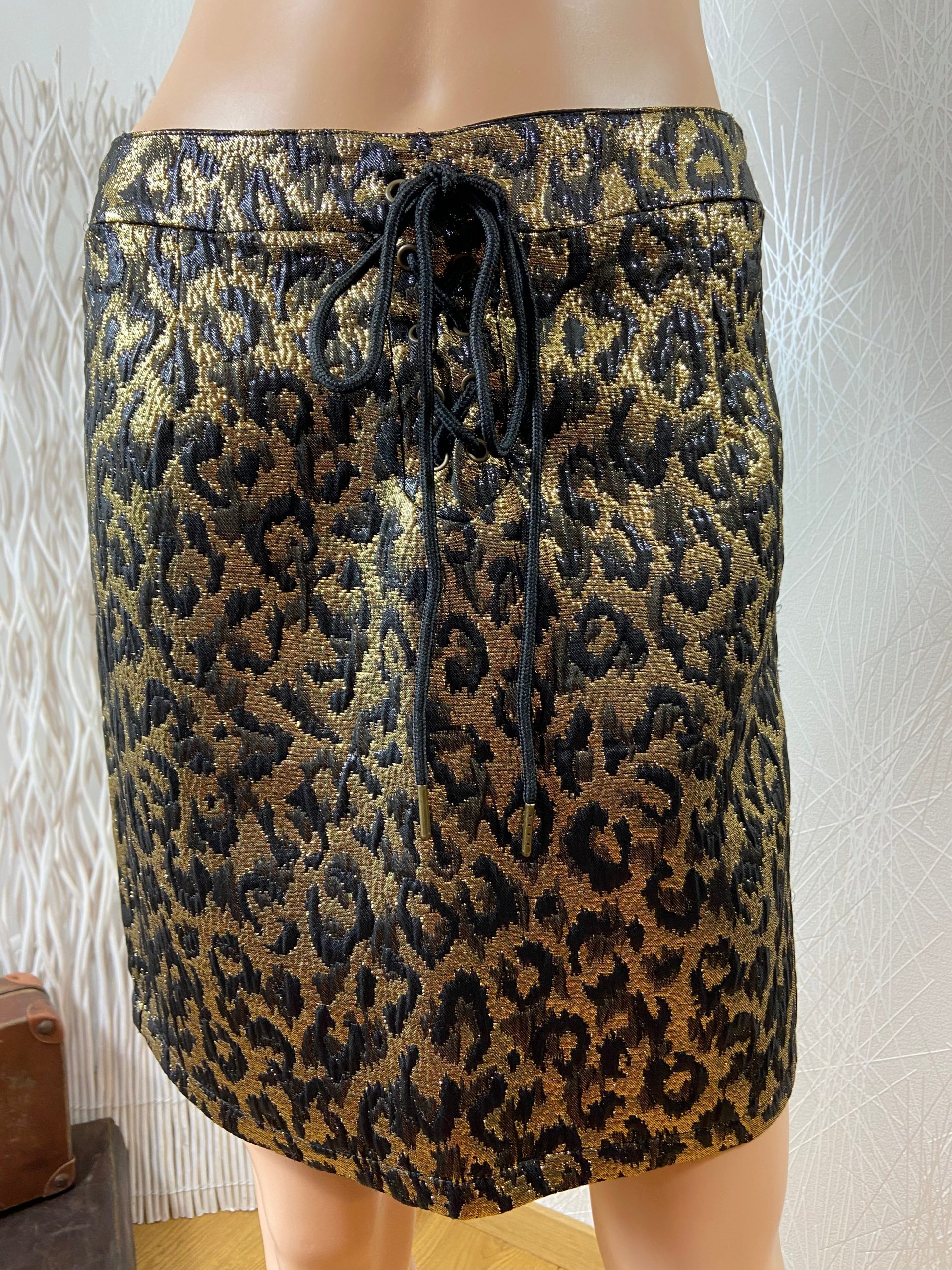 Jupe doré et noire de la marque Grâce et Mila. Coupe droite, taille haute, lacet sur l’avant et fermeture zip dans le dos. Matière : 50% coton – 50% polyester Couleur : Doré Marque : Grâce et Mila Dimensions Taille 36 : Tour de taille : 68 cm ; longueur : 41 cm.