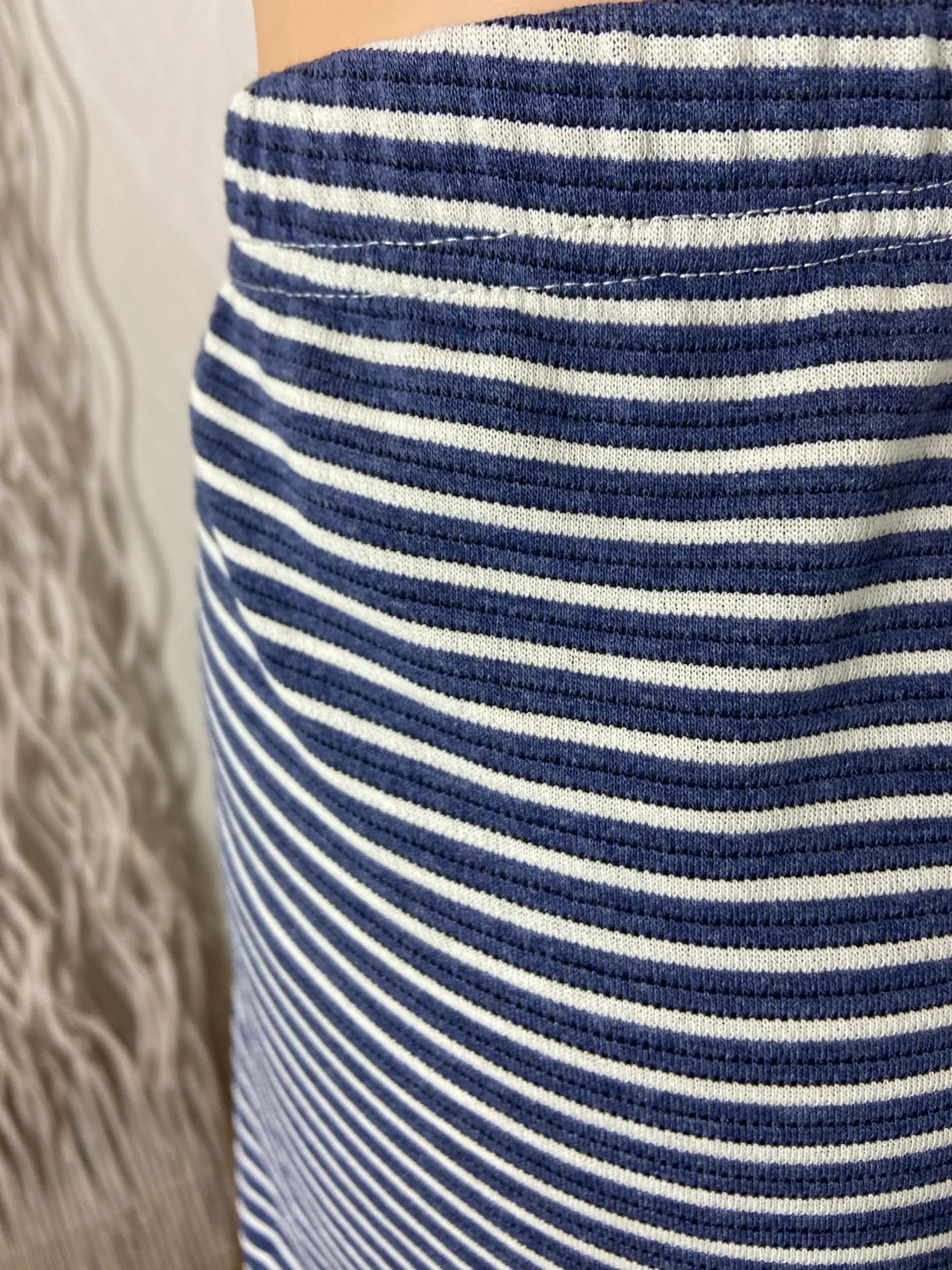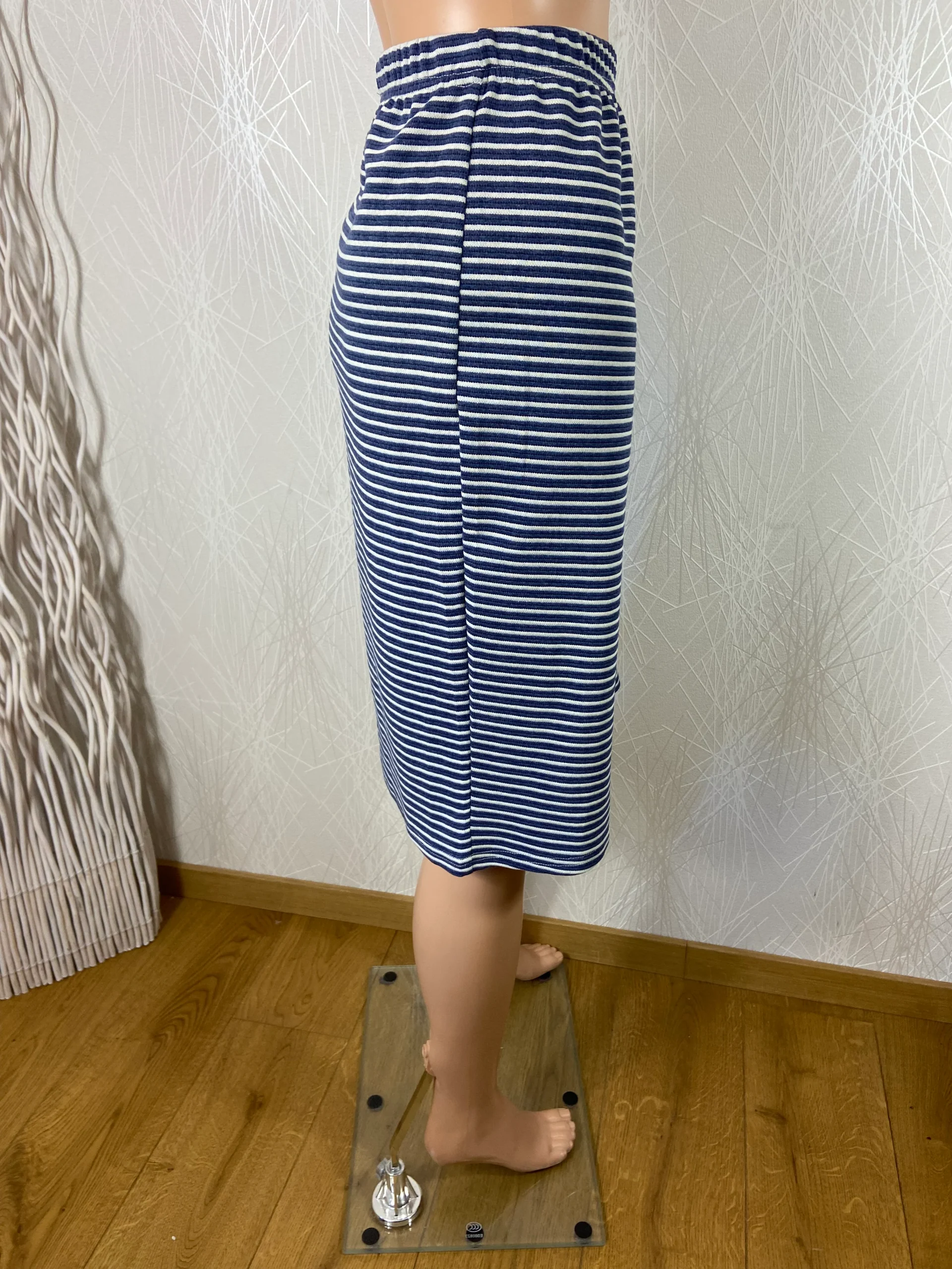 Taille haute élastique, tissu rayé bleu et blanc coupe droite et longueur midi.