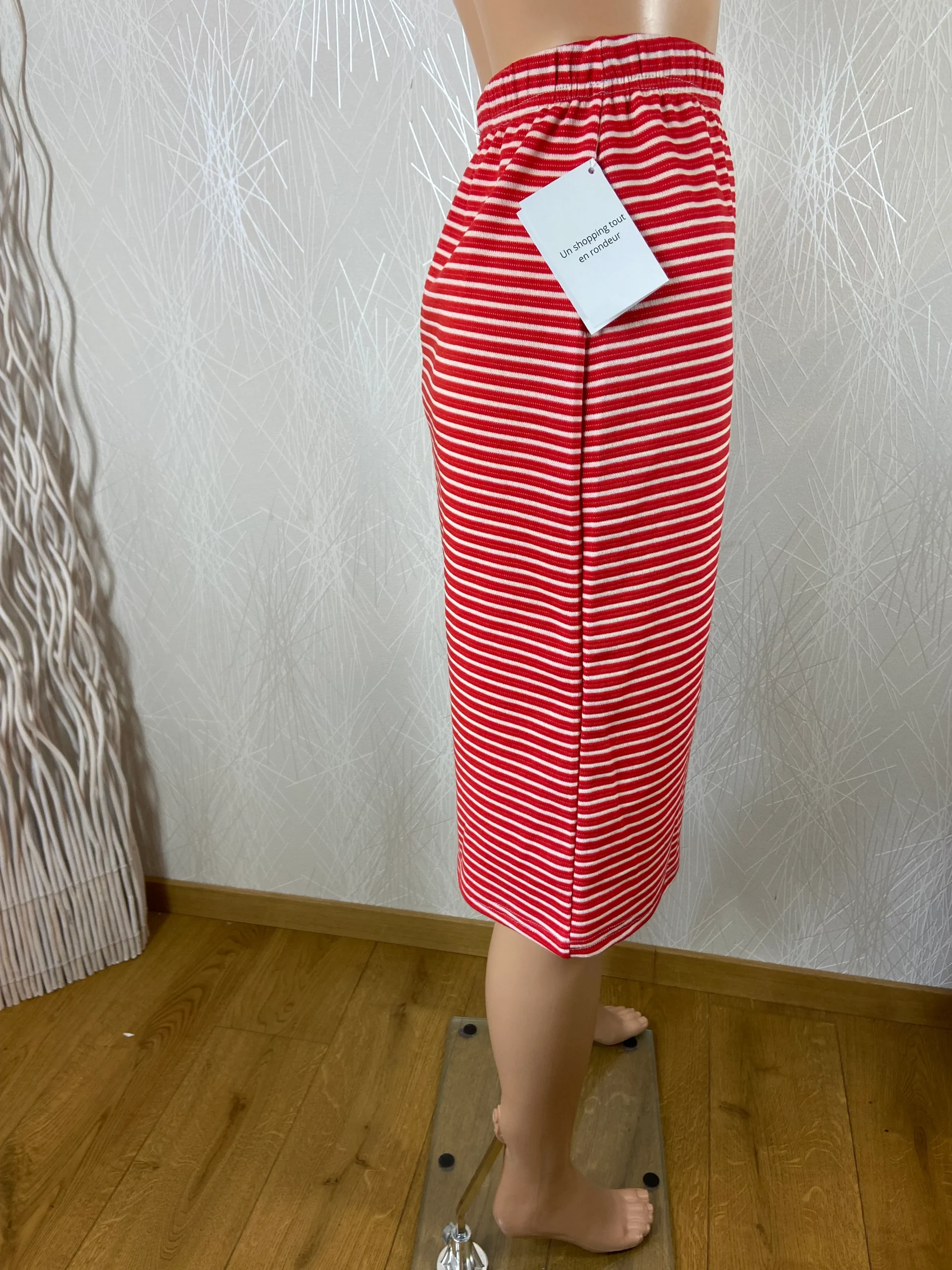 Taille haute élastique, tissu coton rayé rouge et blanc, coupe droite et longueur midi.