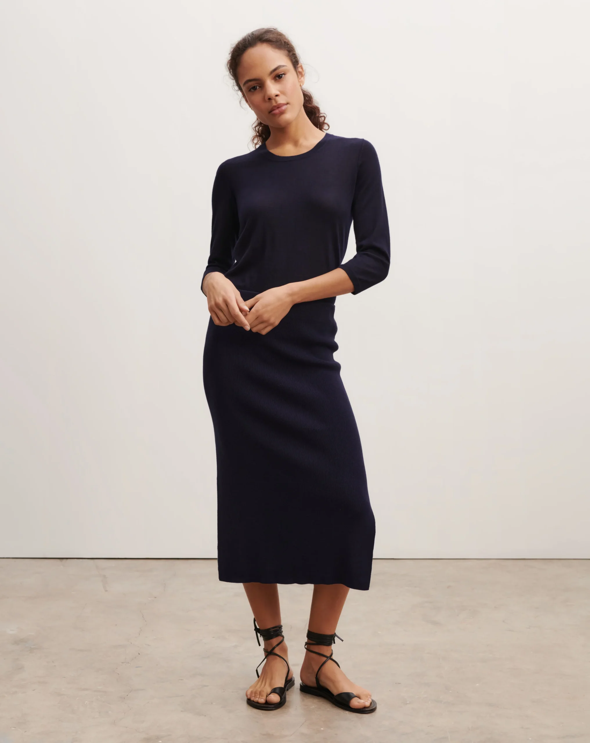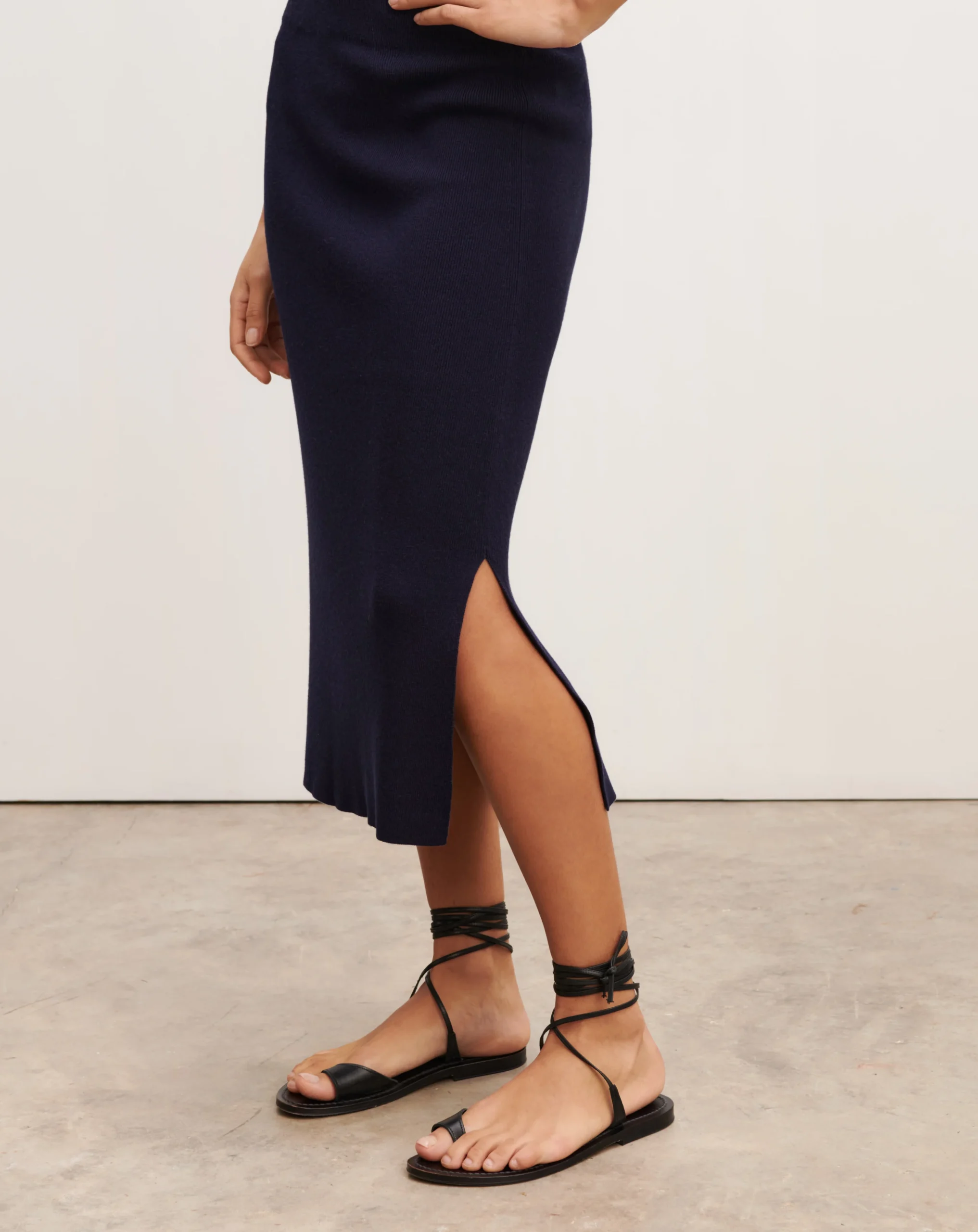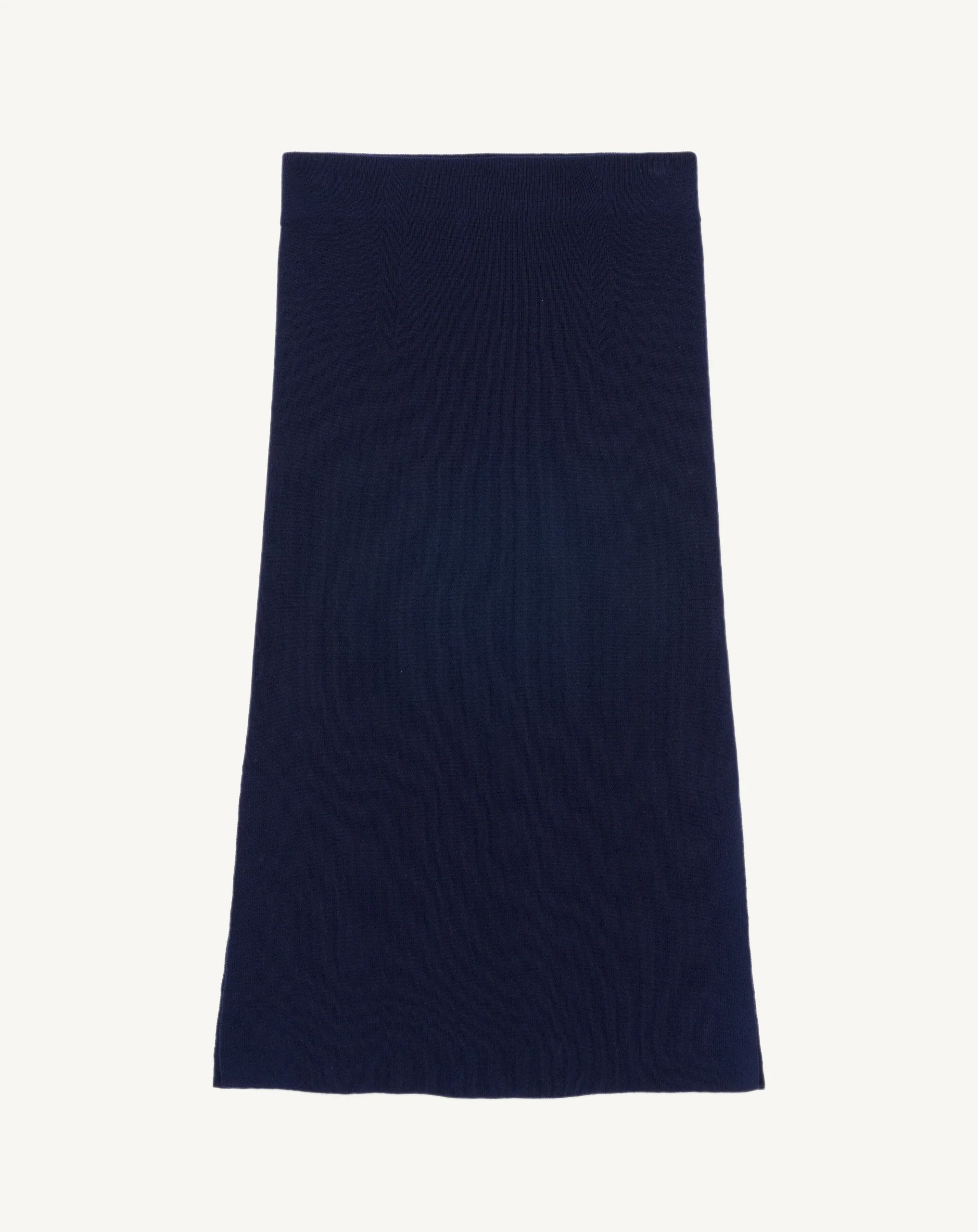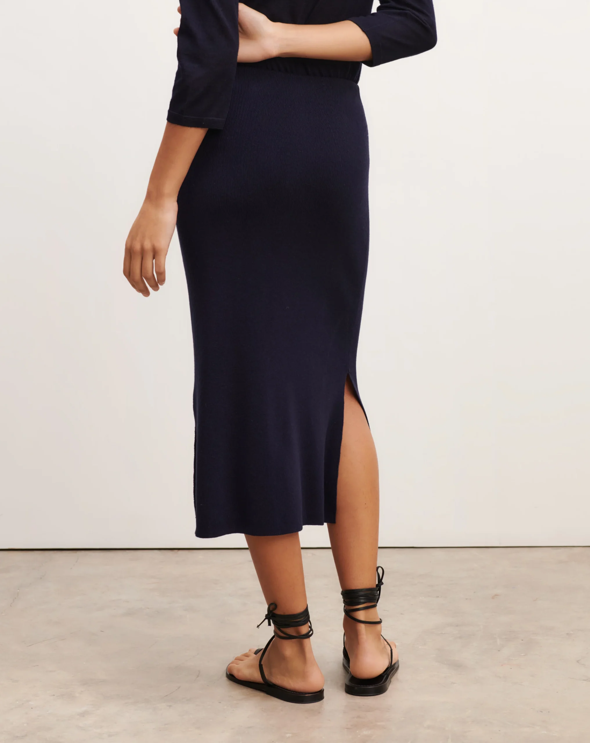 Jupe en maille douce de soie et de cachemire. Coupe ajustée, longueur midi munie d’une fente latérale.