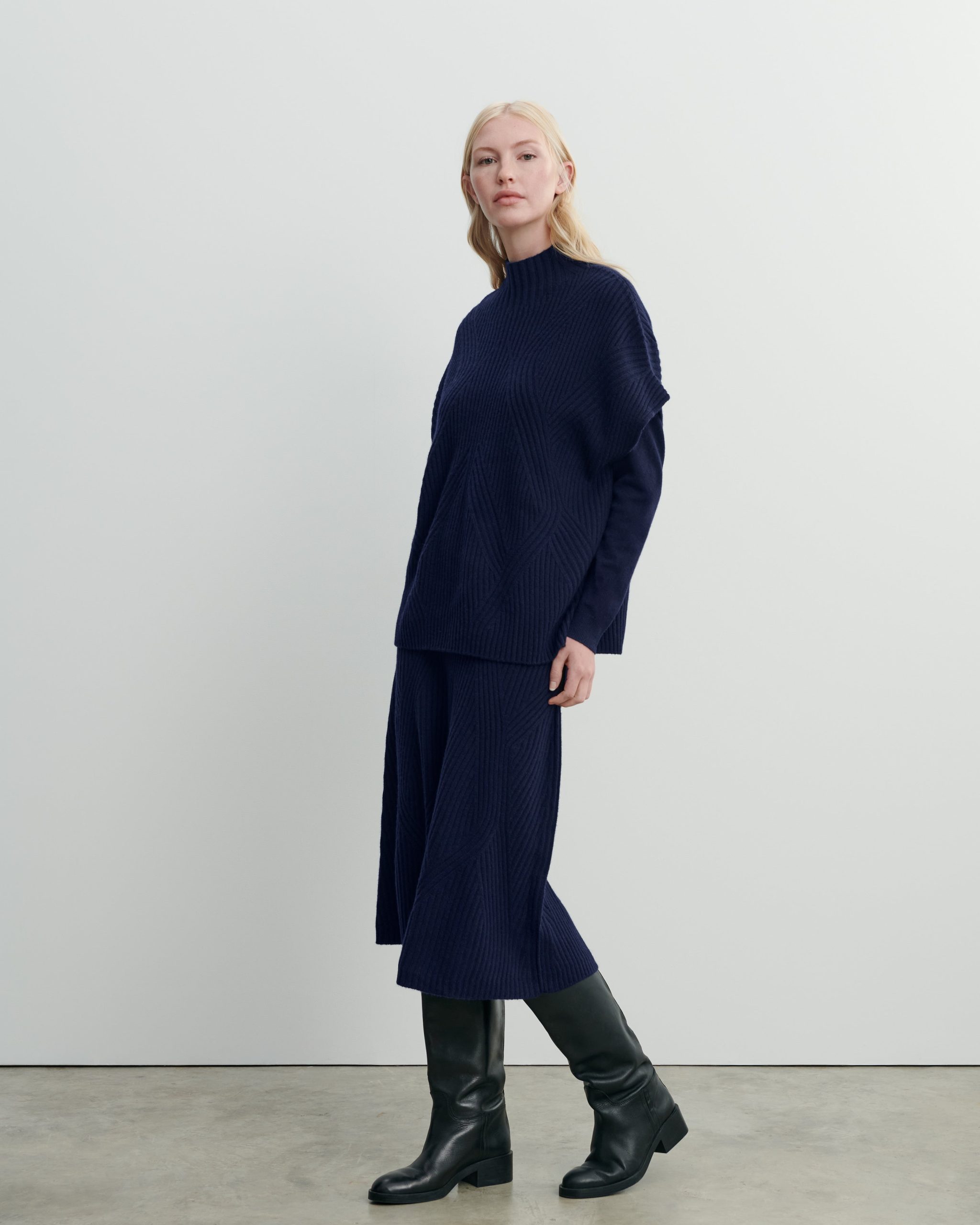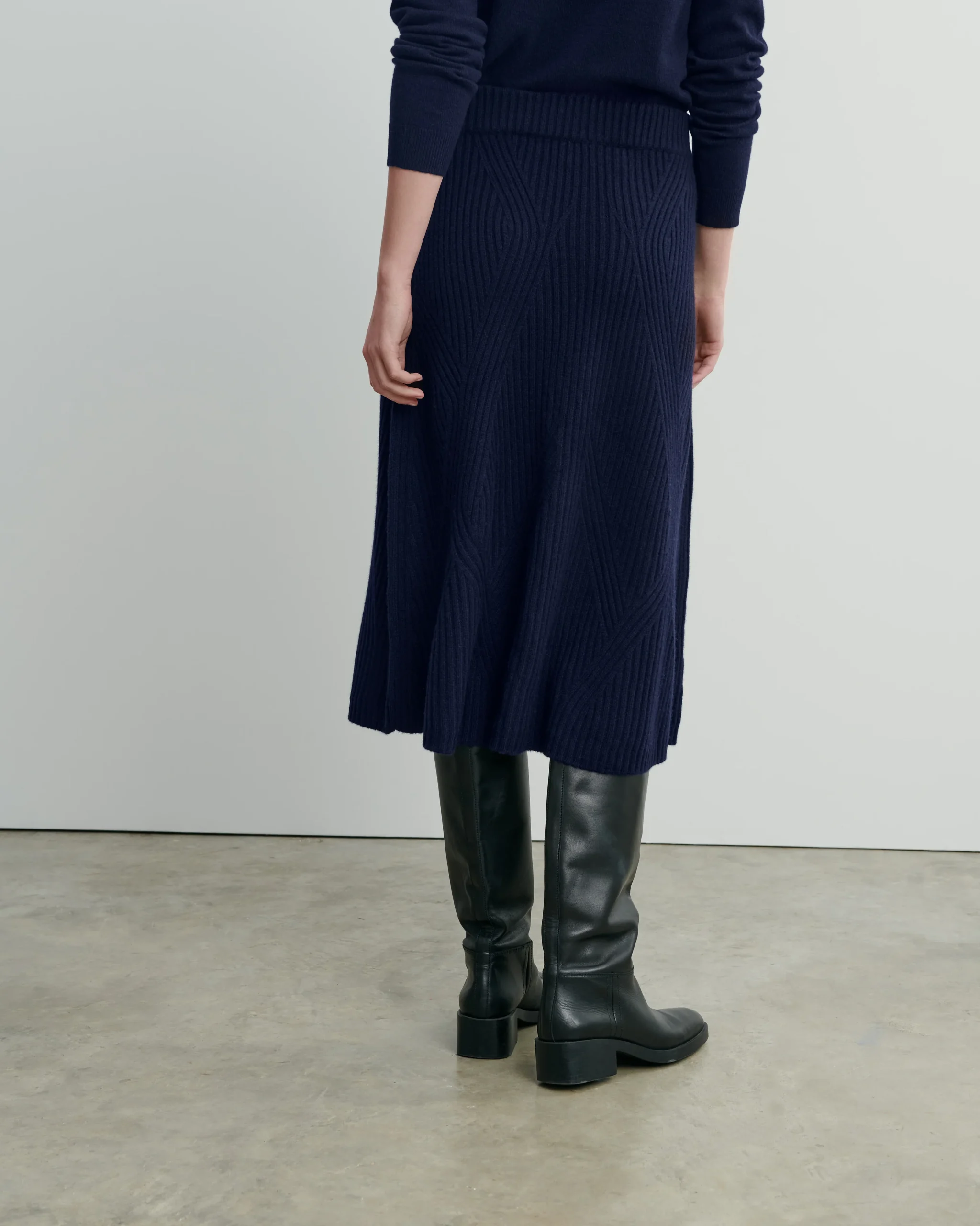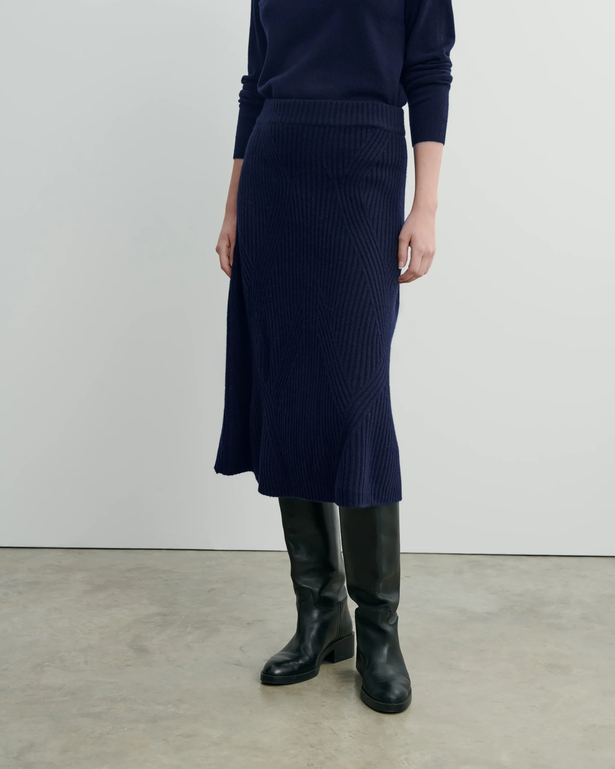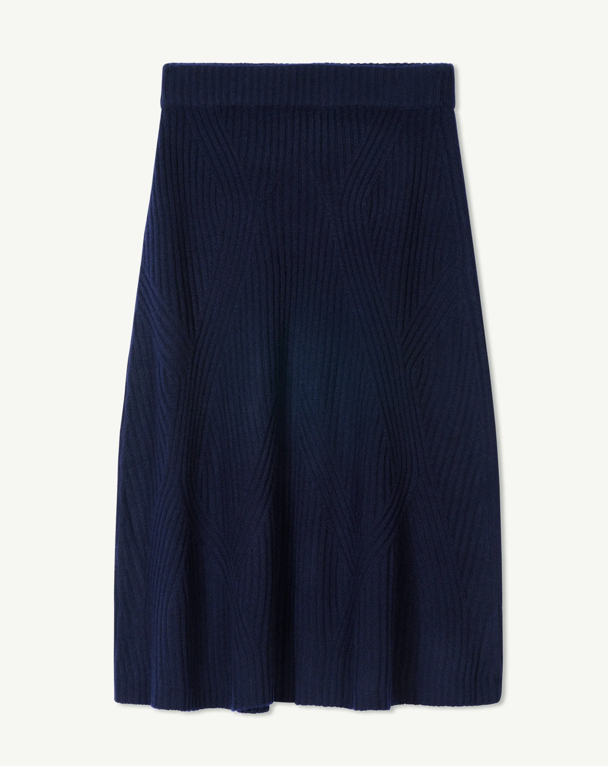 Jupe longueur midi en cachemire côtelé. Modèle taille haute, avec ouverture latérale boutonnée.