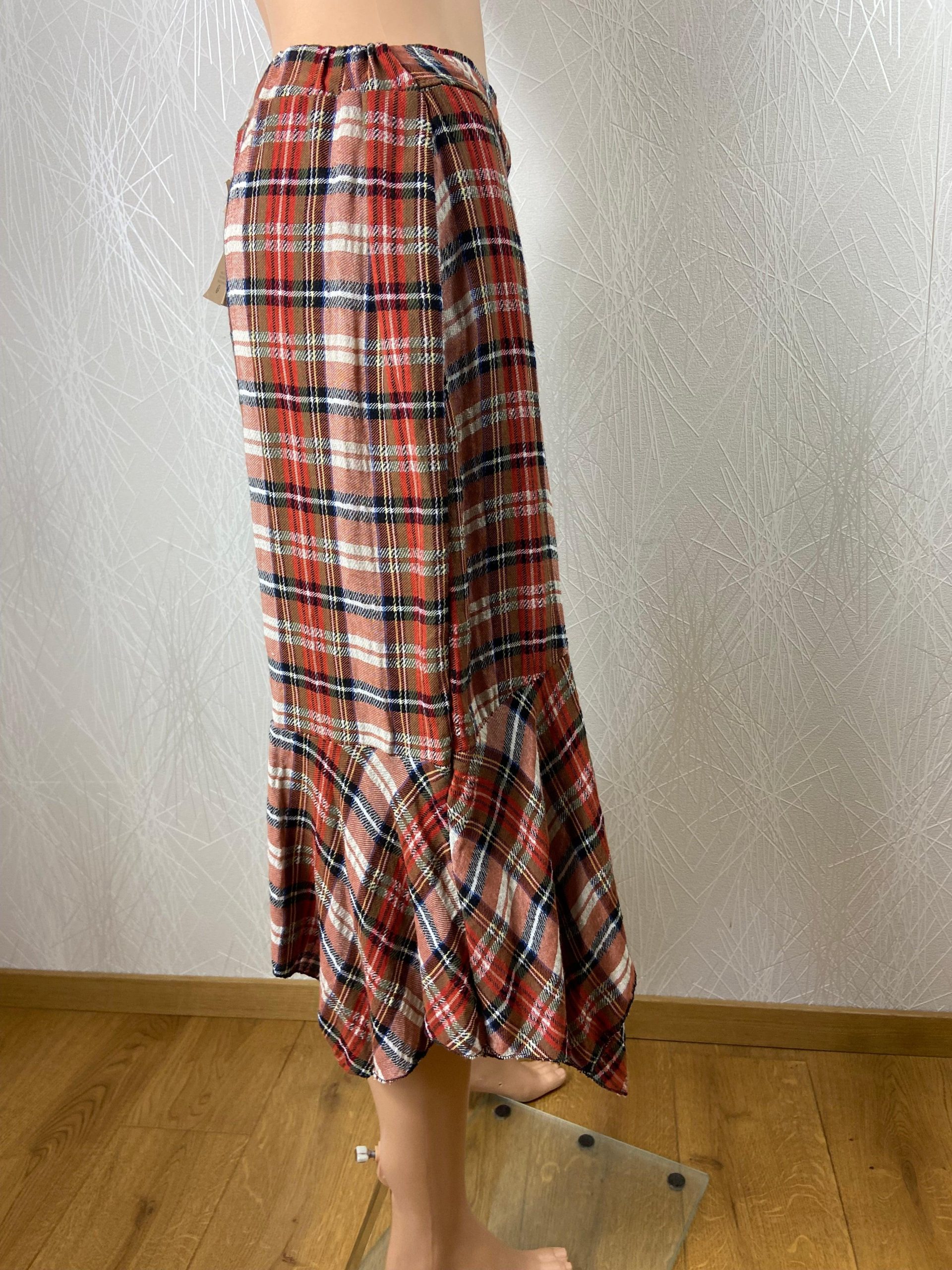 Jupe midi légère à carreaux de la marque Garçonne. Taille élastique avec tissu à nouer, de style portefeuille, volants sur le bas et coupe fluide. Matière : 50% coton – 35% viscose – 15% polyester Couleur : Marron Marque : Garçonne Taille Unique – Réf : TUNJ5163 Dimensions : Tour de taille : de 70 […]