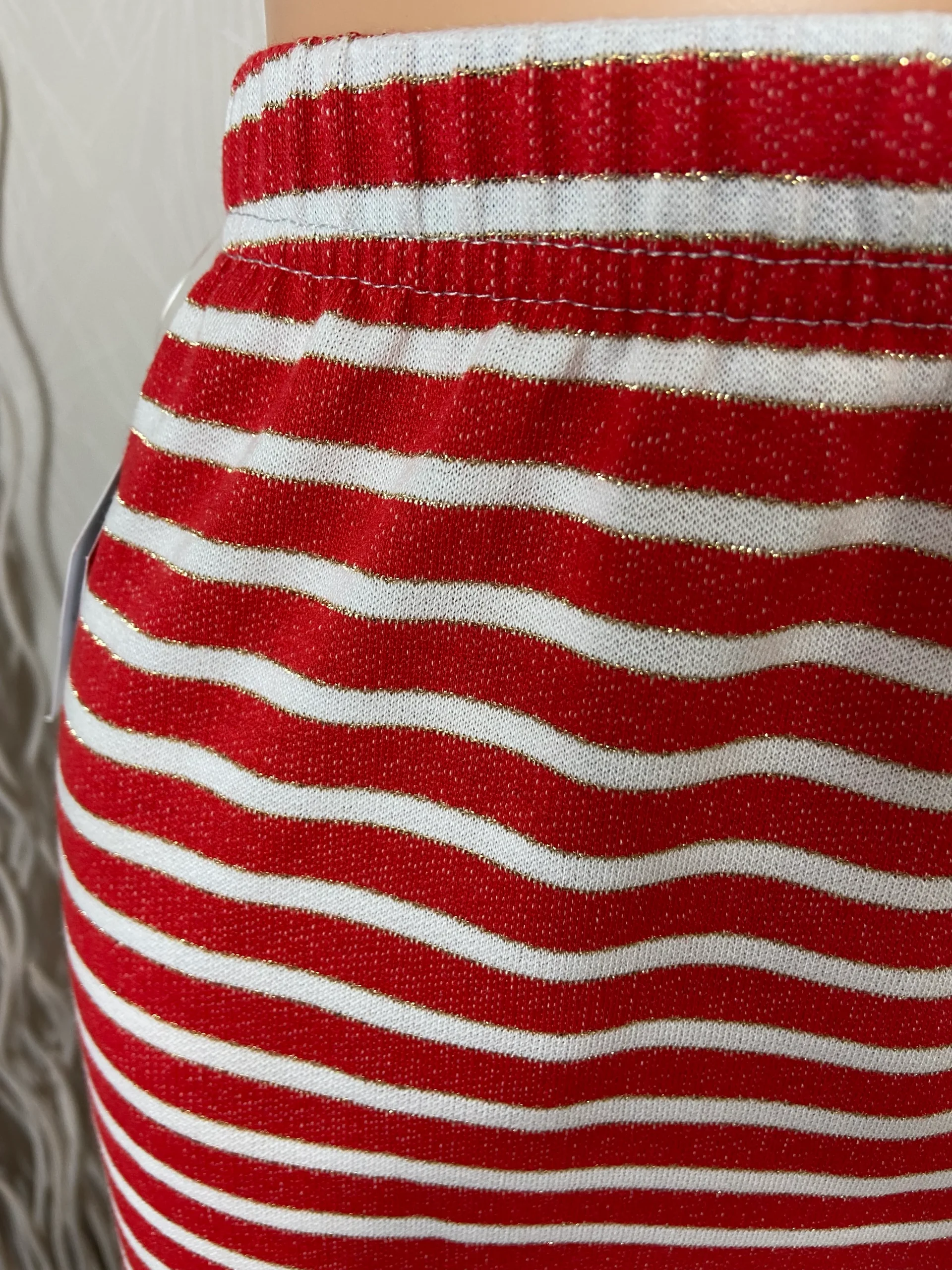 Taille haute élastique, tissu à motif rayé rouge blanc doré, coupe droite et taille midi.