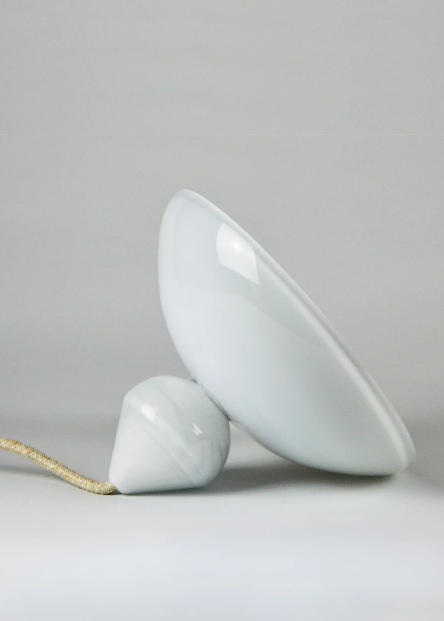 Sculpturale et apaisante, la Lampe Ellipse explore la rencontre entre la forme et la lumière. Sa base en verre soufflé, parcourue de fines marbrures, soutient un réflecteur de verre blanc en forme d’ellipse qui diffuse une clarté douce et enveloppante. Par le jeu des transparences et des reflets, la lumière devient matière, révélant la poésie du geste artisanal et la délicatesse du verre travaillé à la main.