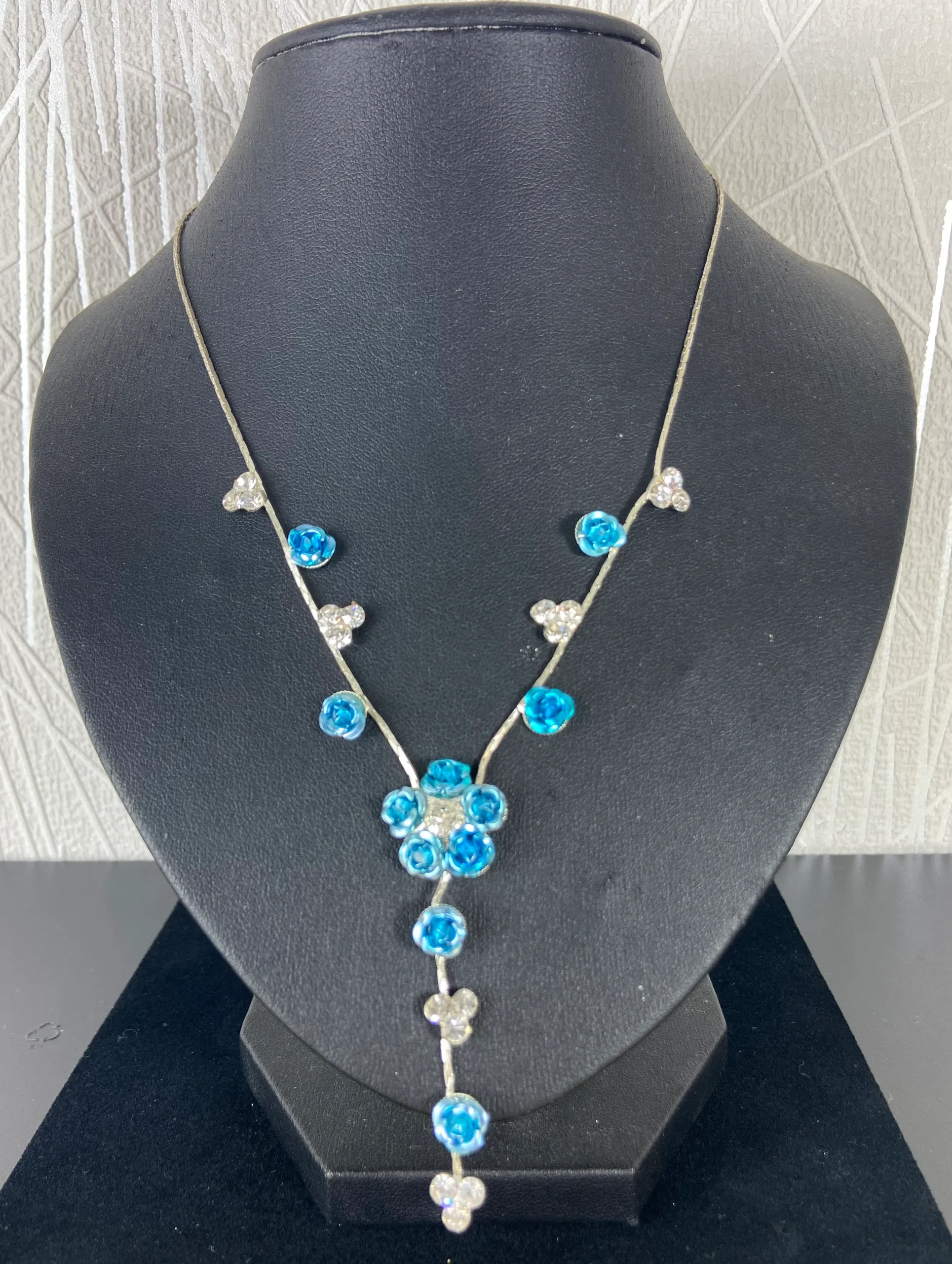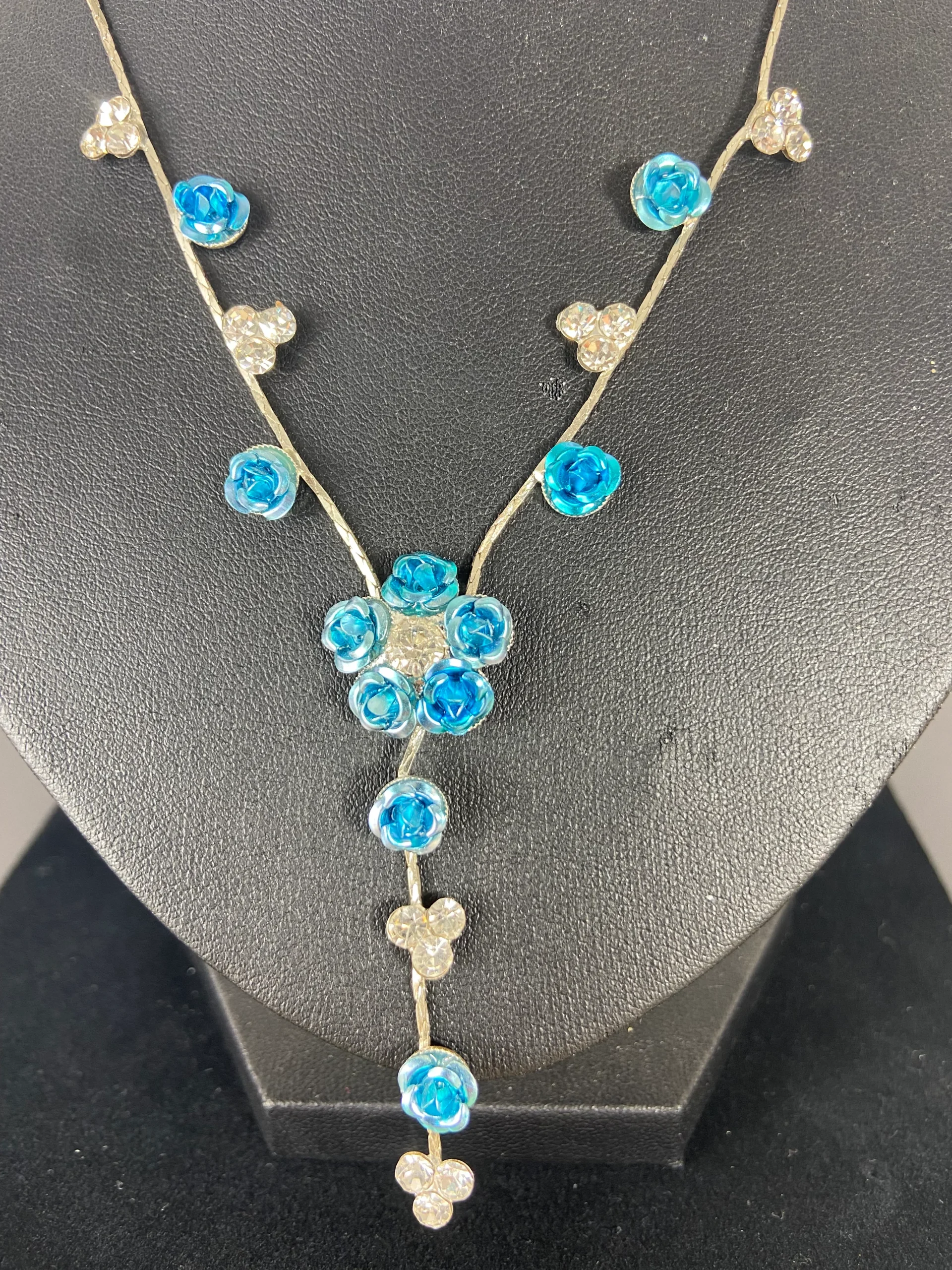 Long collier réglables avec fleurs bleues et brillants sur chaine plate argentée.