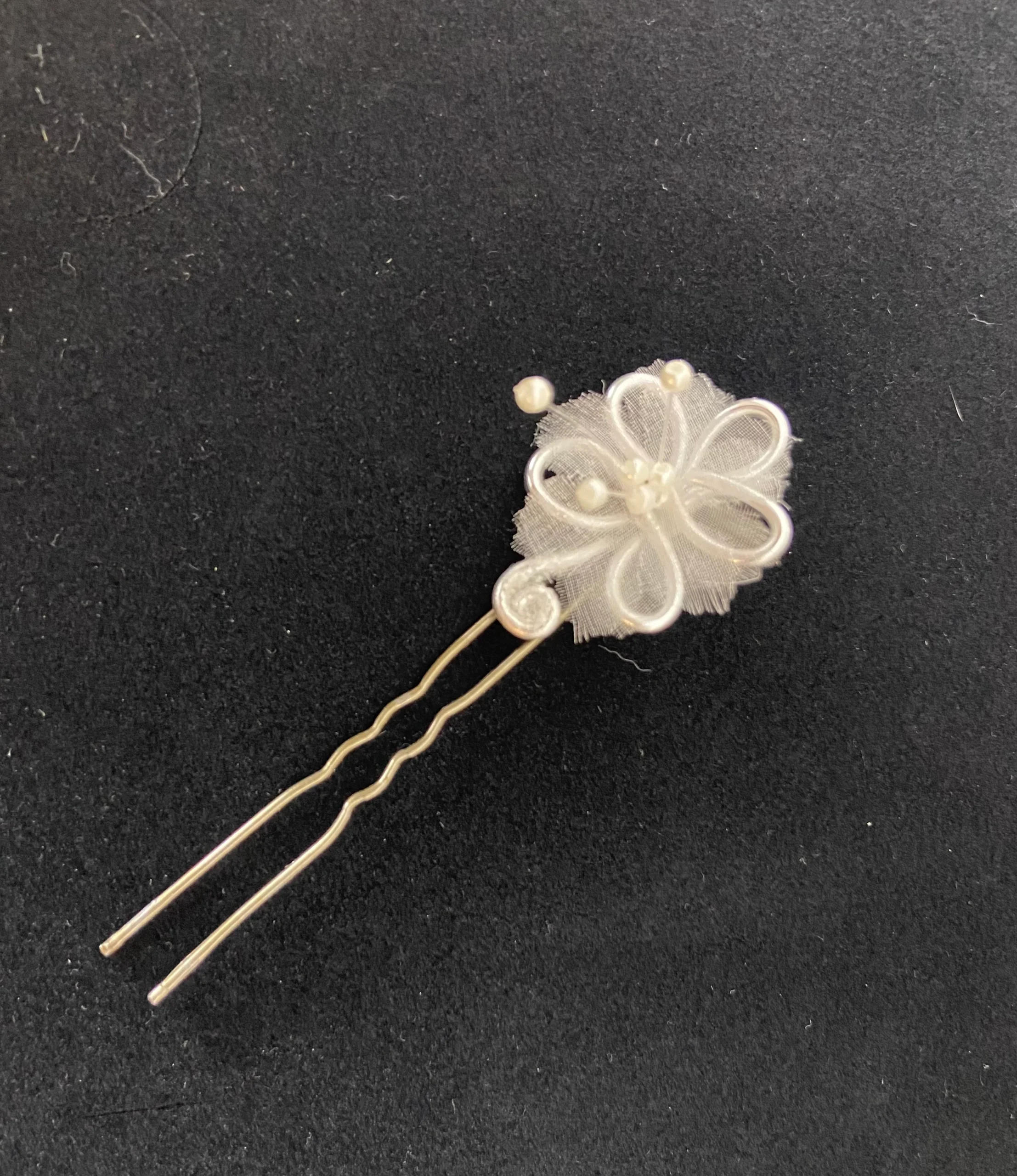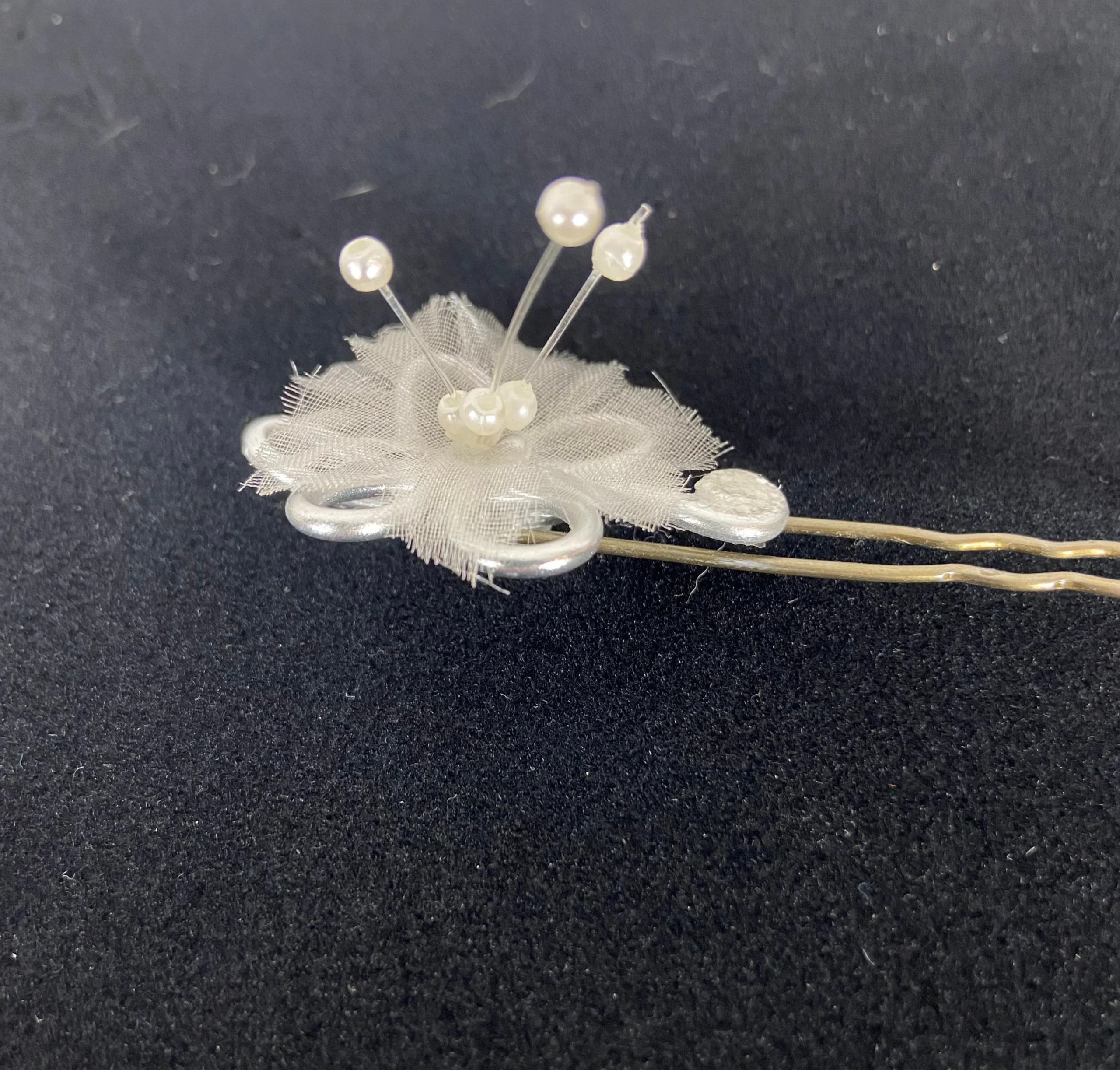 Lot de 3 épingles à cheveux, en forme de fleur en tulle et perles blanches.