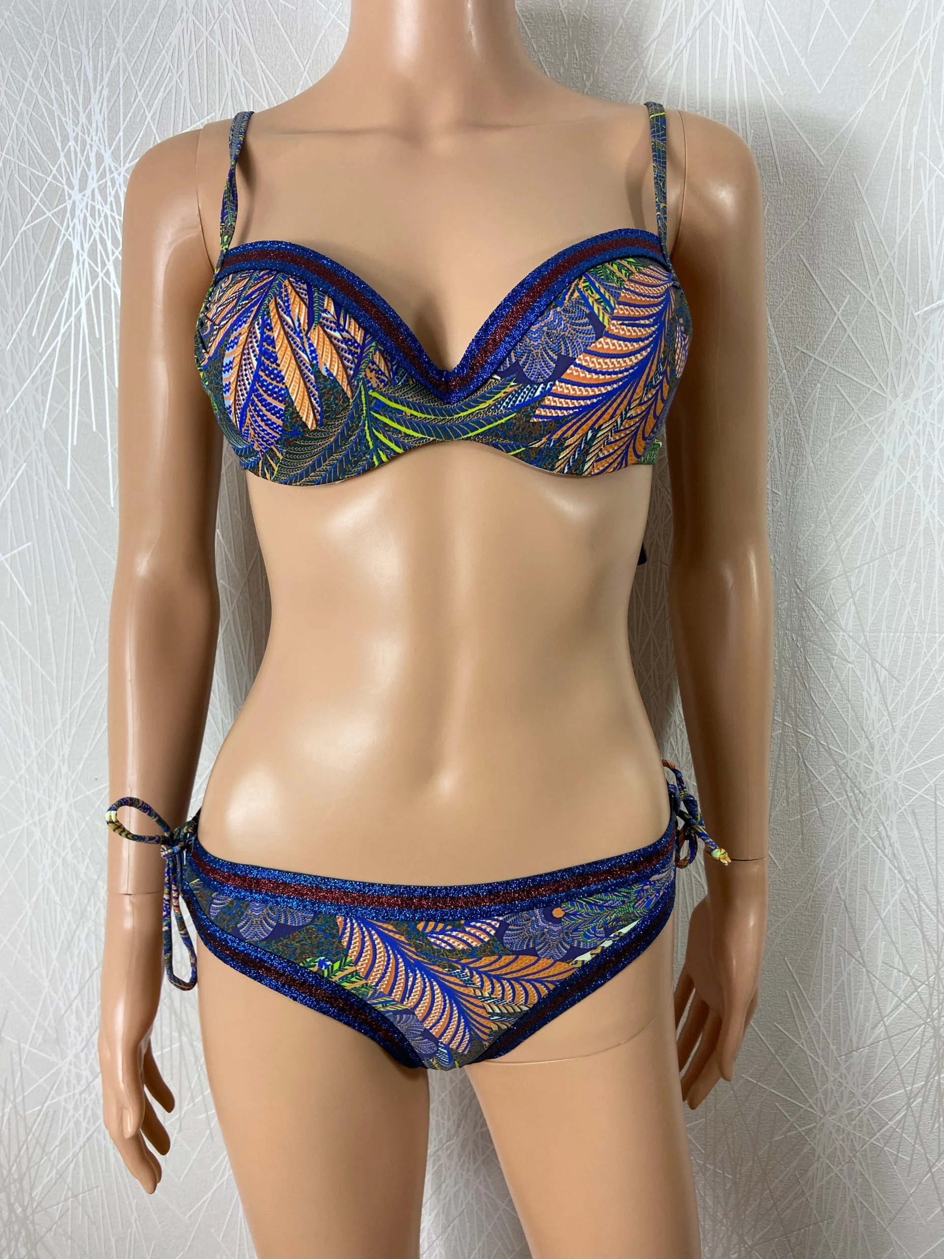 Fines bretelles réglables, bonnet rembourré avec armatures, flot à nouer au dos, bas du bikini avec noeuds décoratifs sur les hanches.