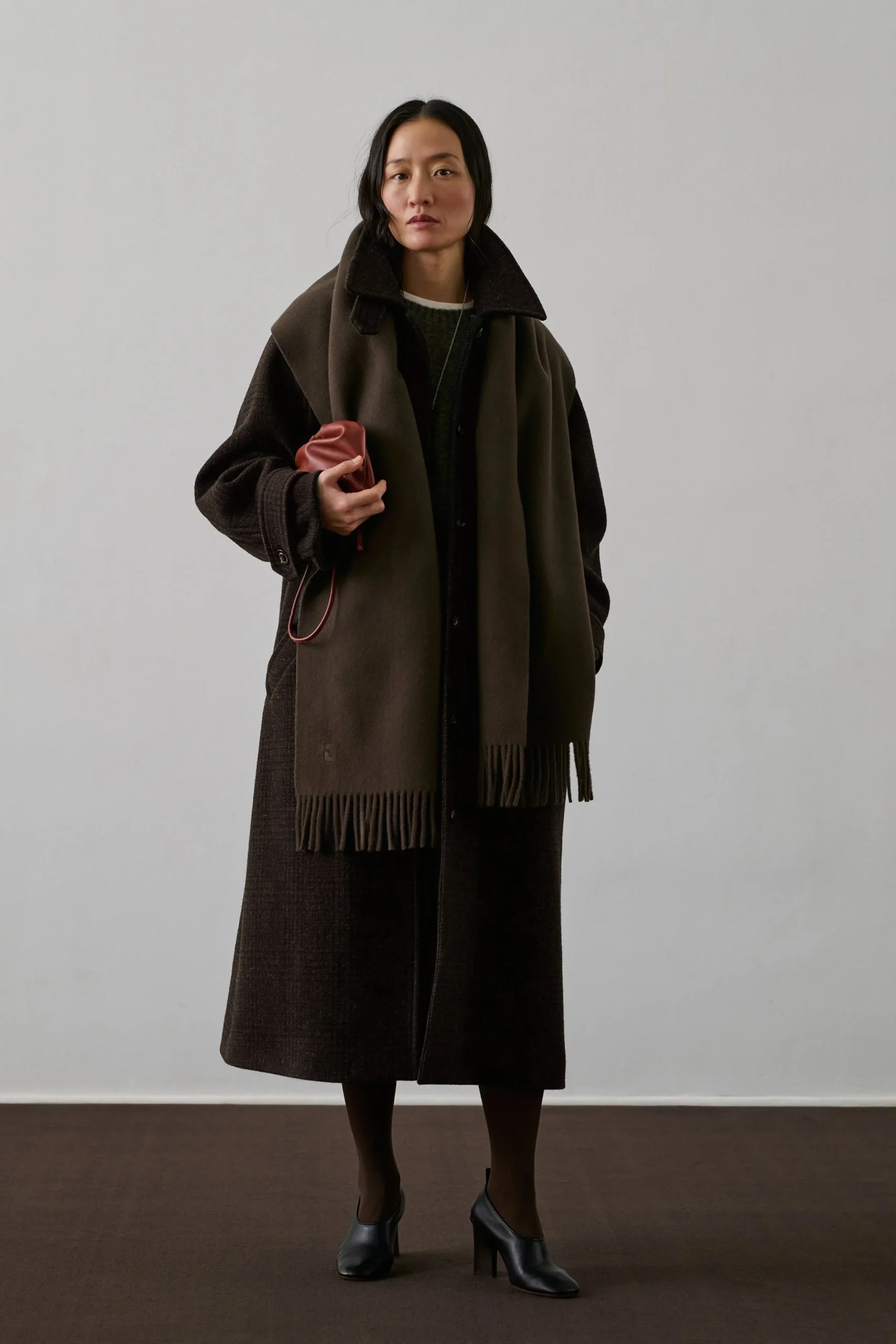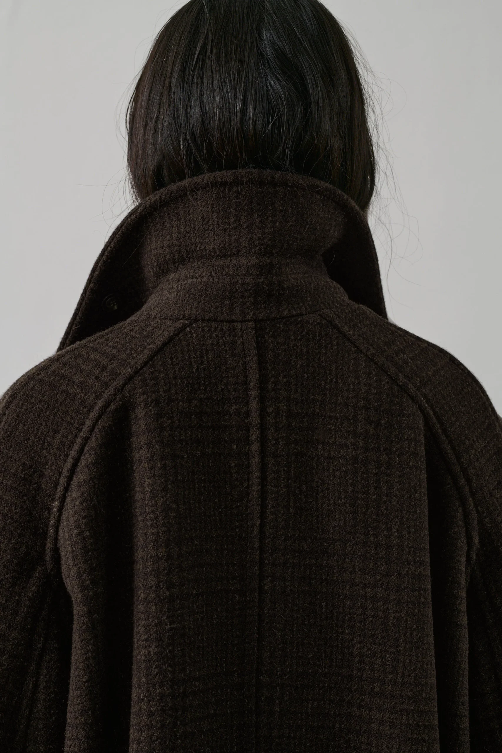 BERLIN est un manteau long en laine à carreaux « Prince de Galles » noir et marron. Sa coupe droite et oversize, ses manches raglan et sa longueur mi-mollet en font une pièce masculine idéale pour l’hiver. L’ouverture à patte cachée et les poches passepoilées ajoutent une élégance discrète.