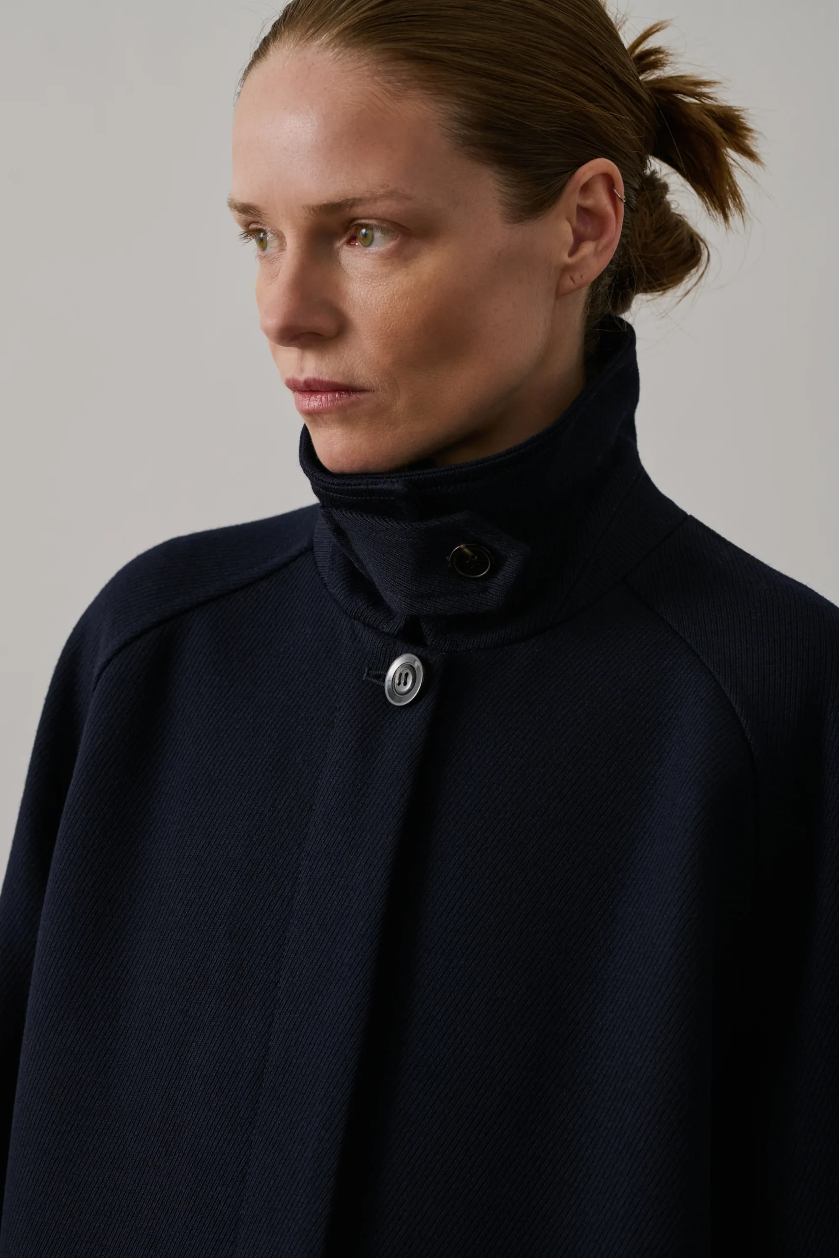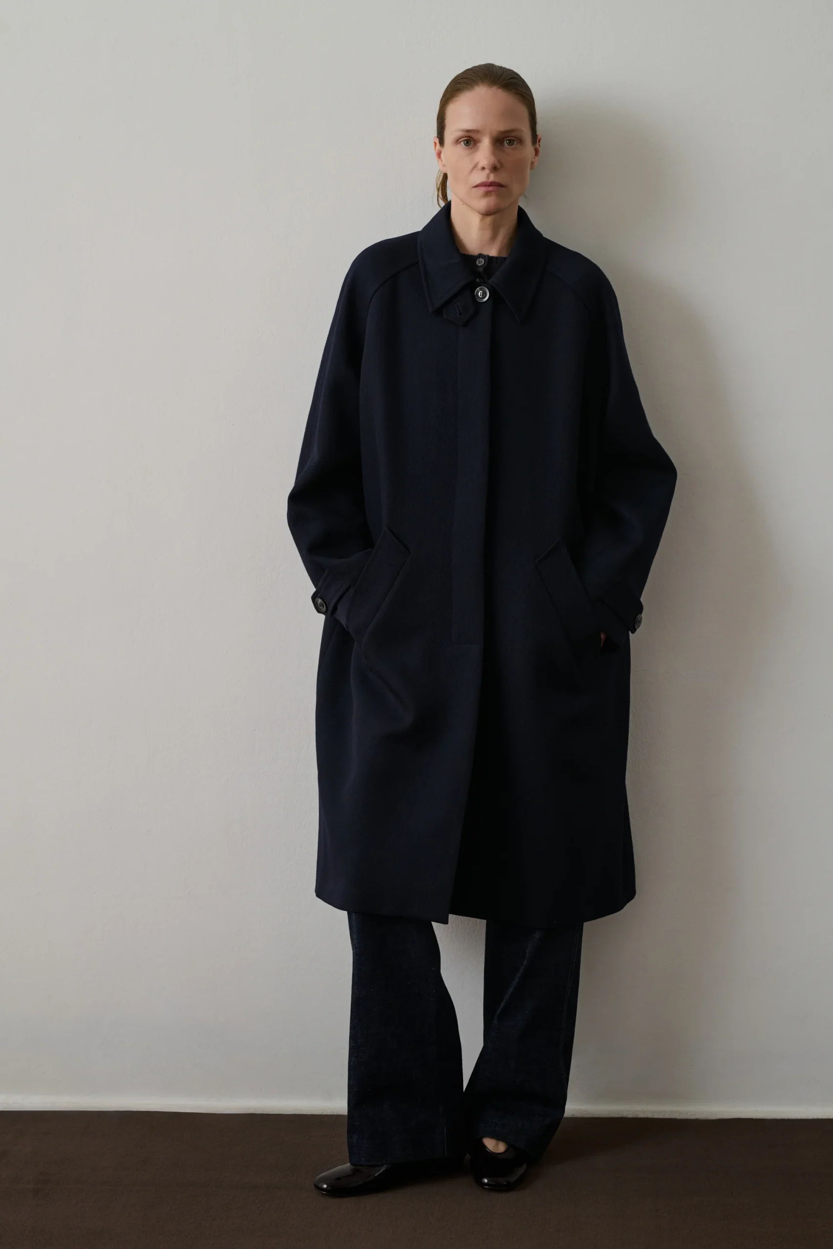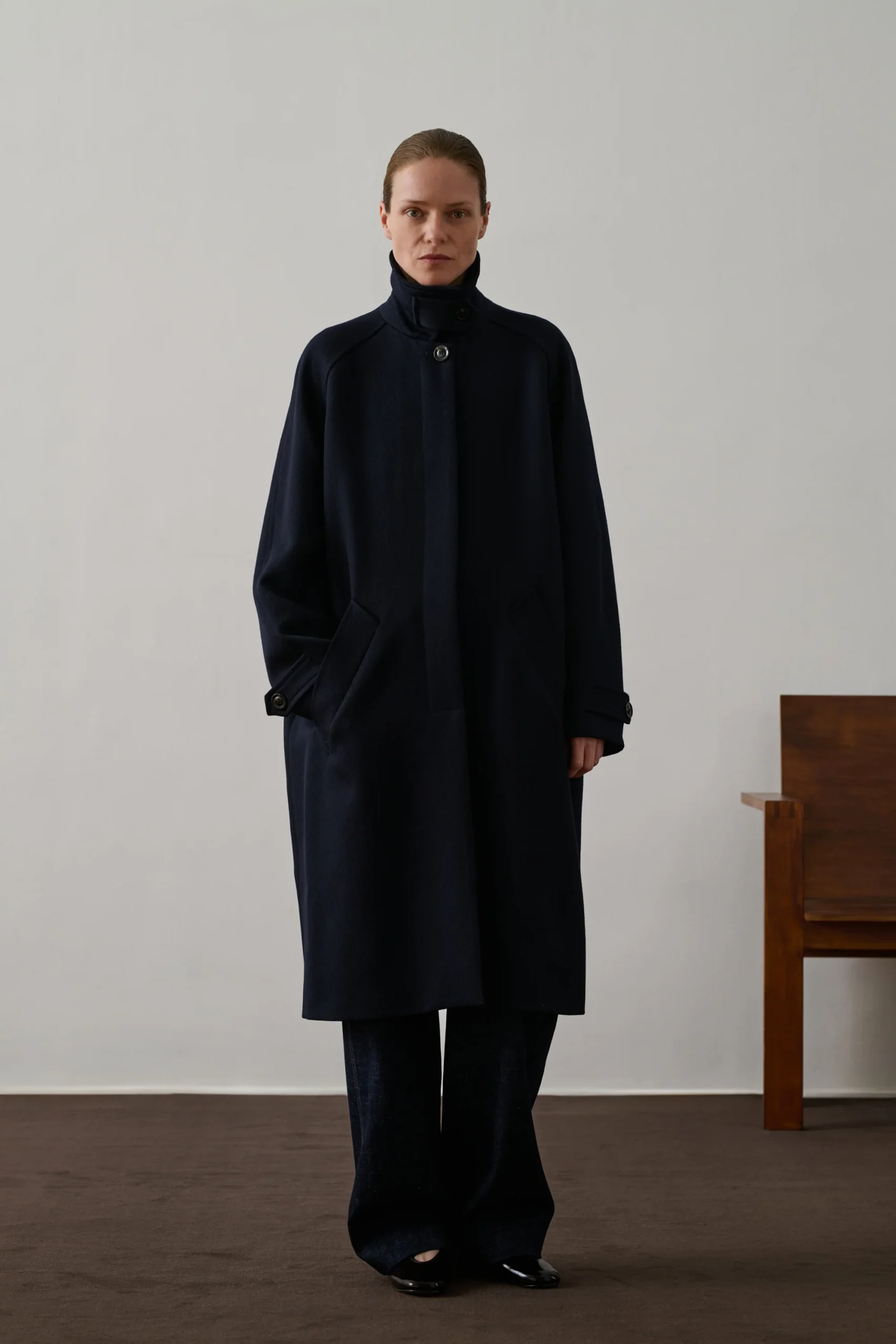 FRANKLIN est un manteau en whipcord de laine, offrant une silhouette droite et une carrure large. Sa longueur genoux et son grand col classique avec patte déportée assurent une allure élégante. Les manches larges ajustables et la fermeture boutonnée cachée ajoutent une touche de sophistication.