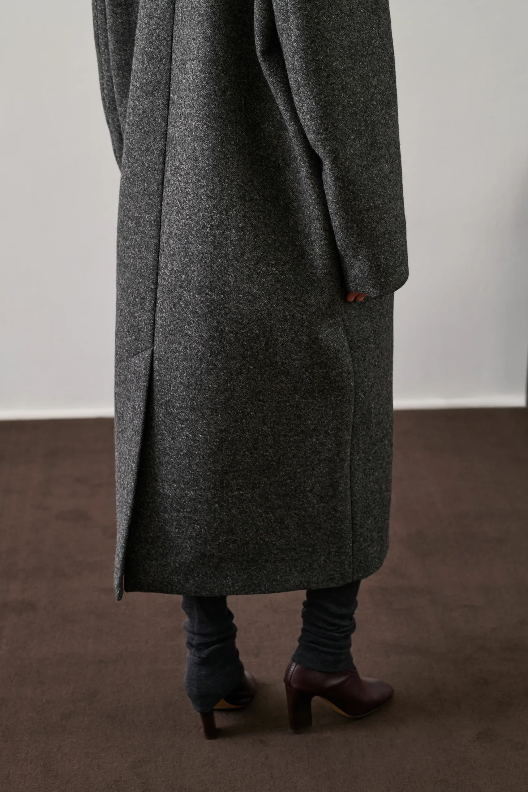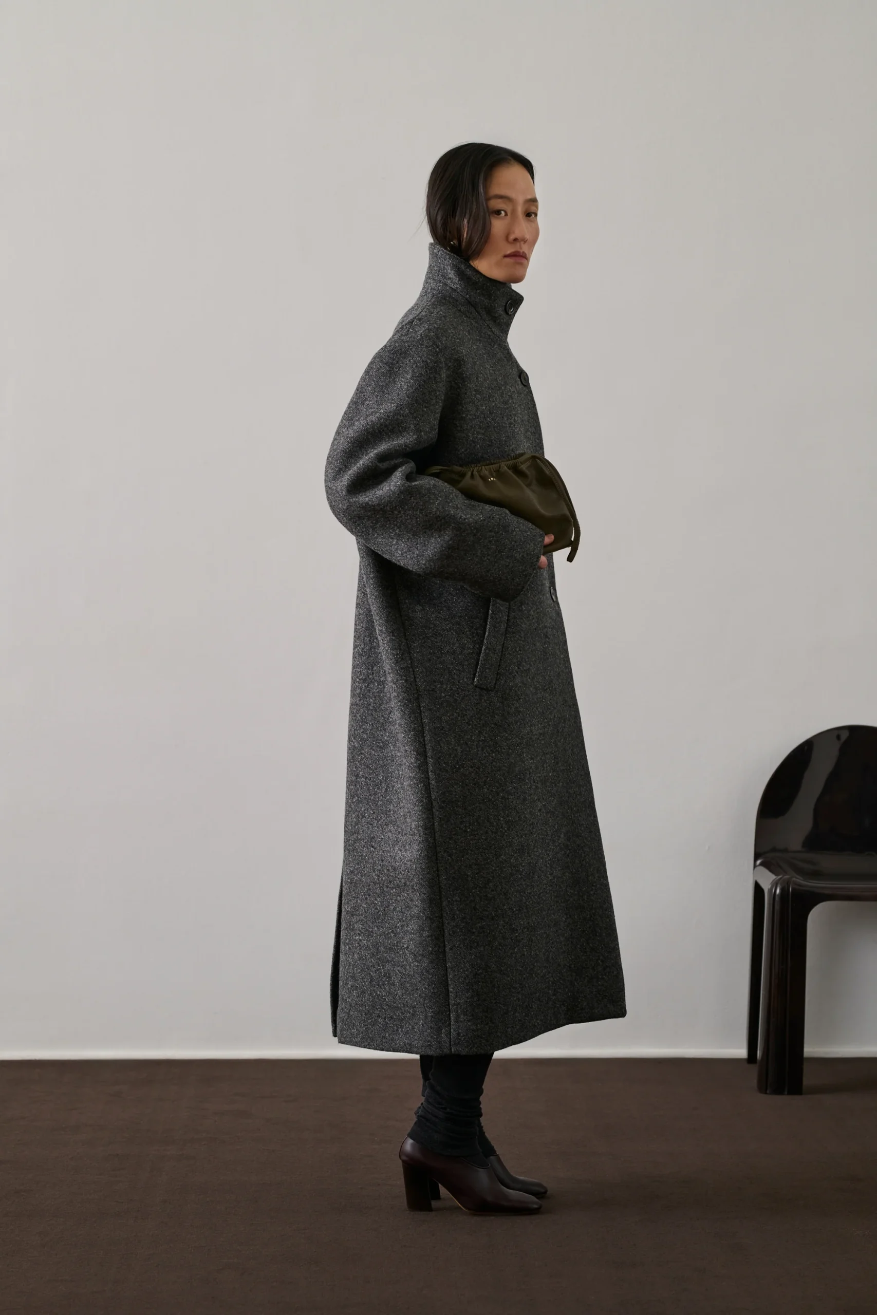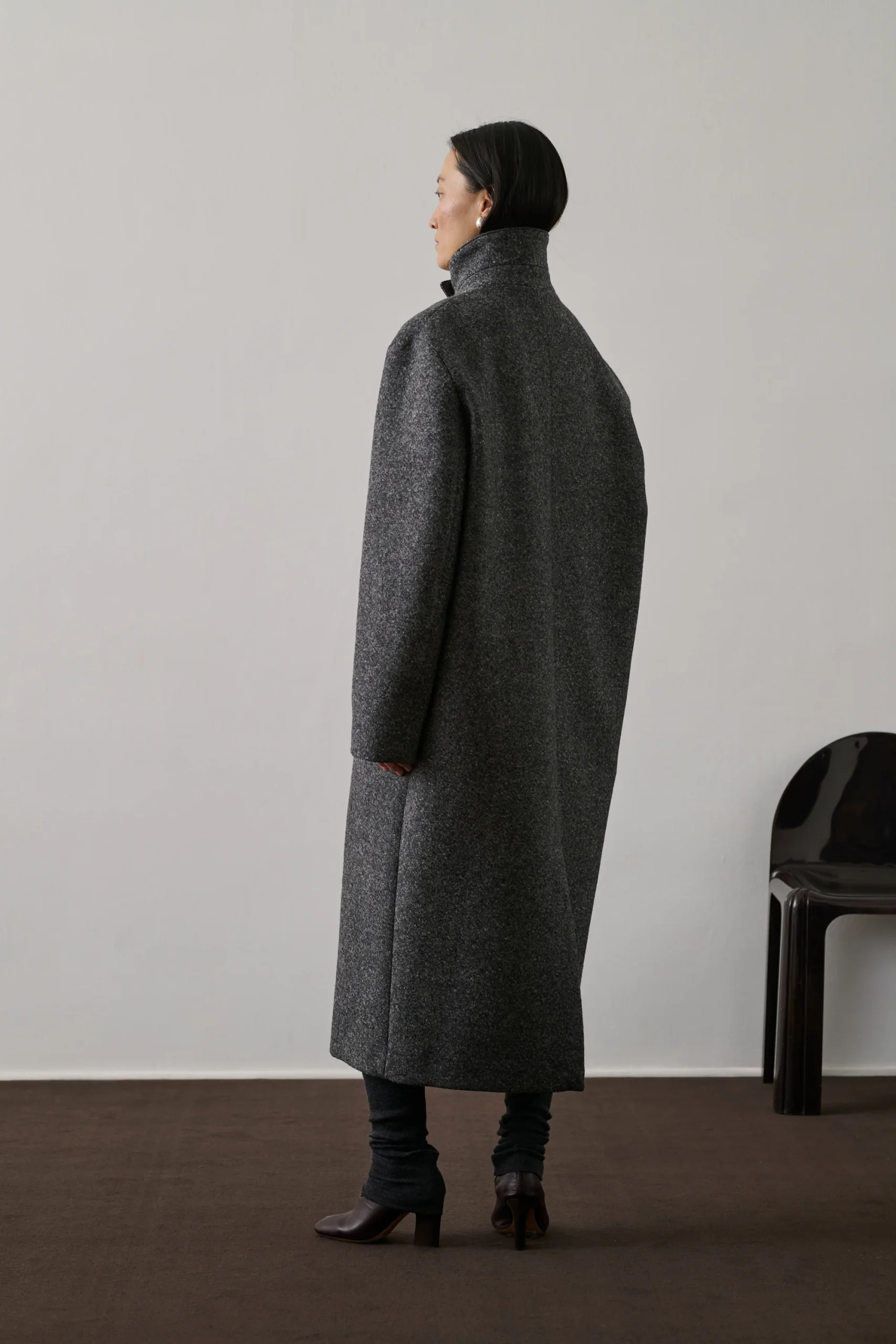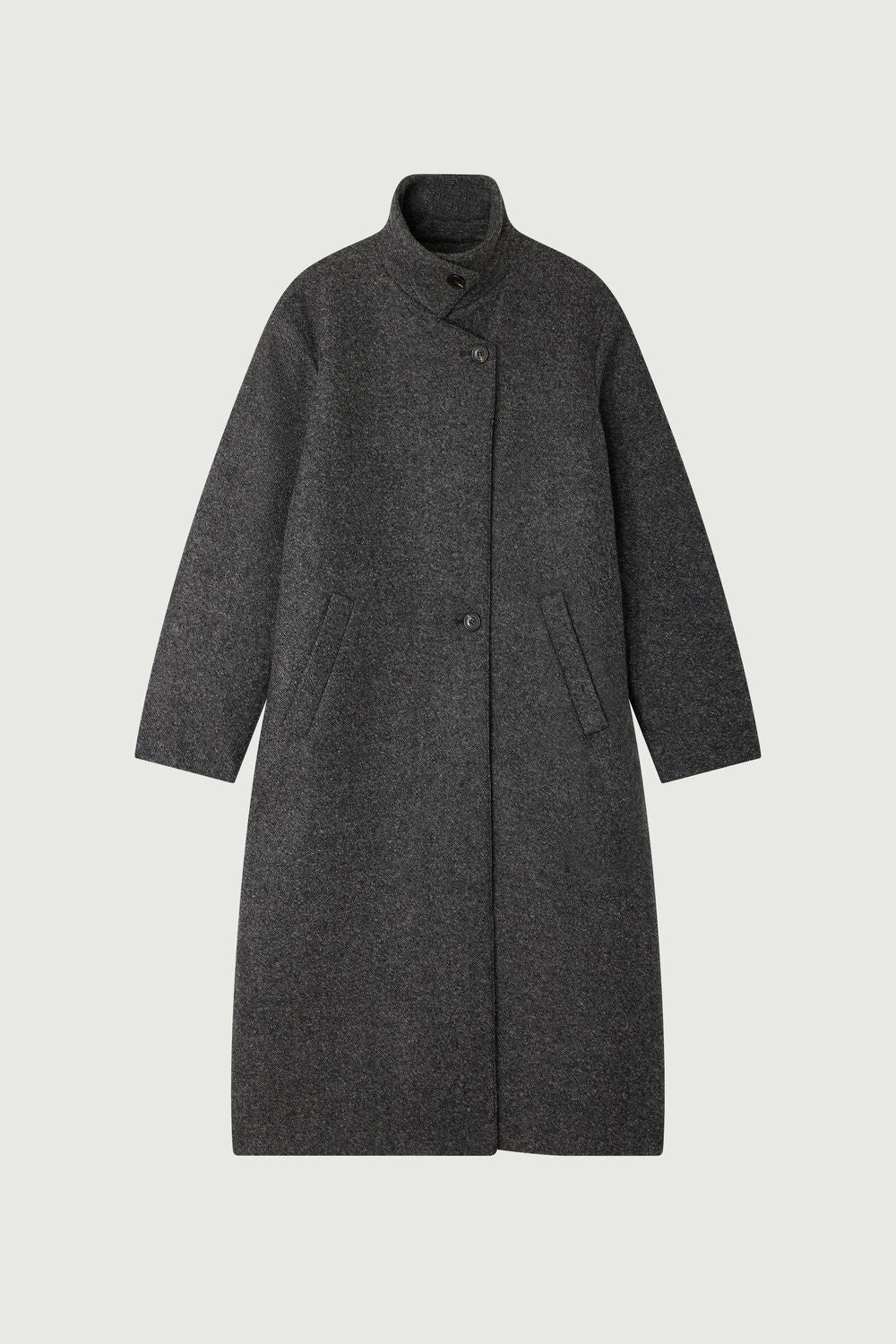 GERMAIN est un manteau long en laine gris chiné, à la coupe droite et au col montant. Sa fermeture à deux boutons et ses poches passepoilées accentuent son allure masculine. La laine double chinée et la doublure assurent chaleur, parfait pour l’hiver. Le bouton déporté ajoute une touche couture.