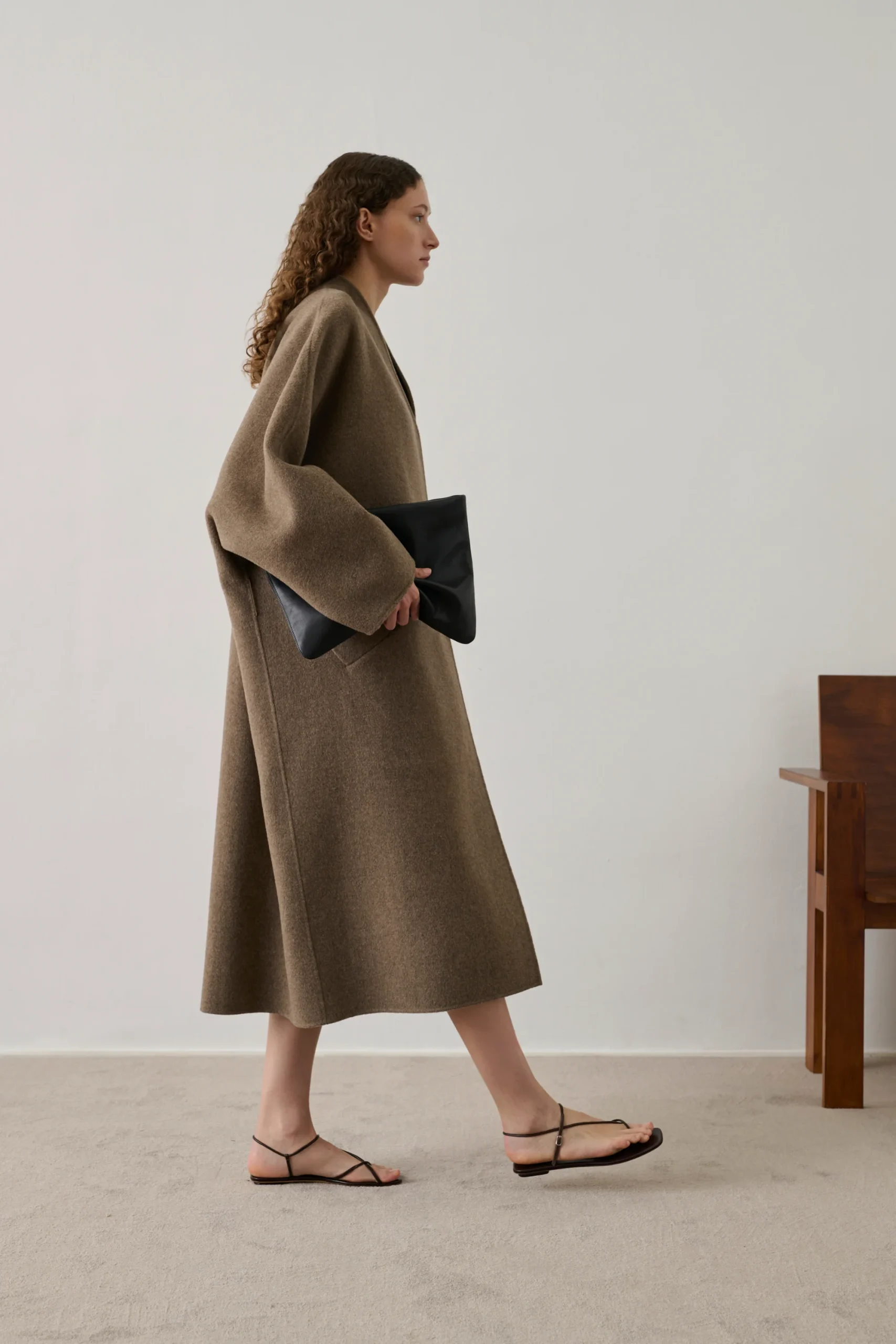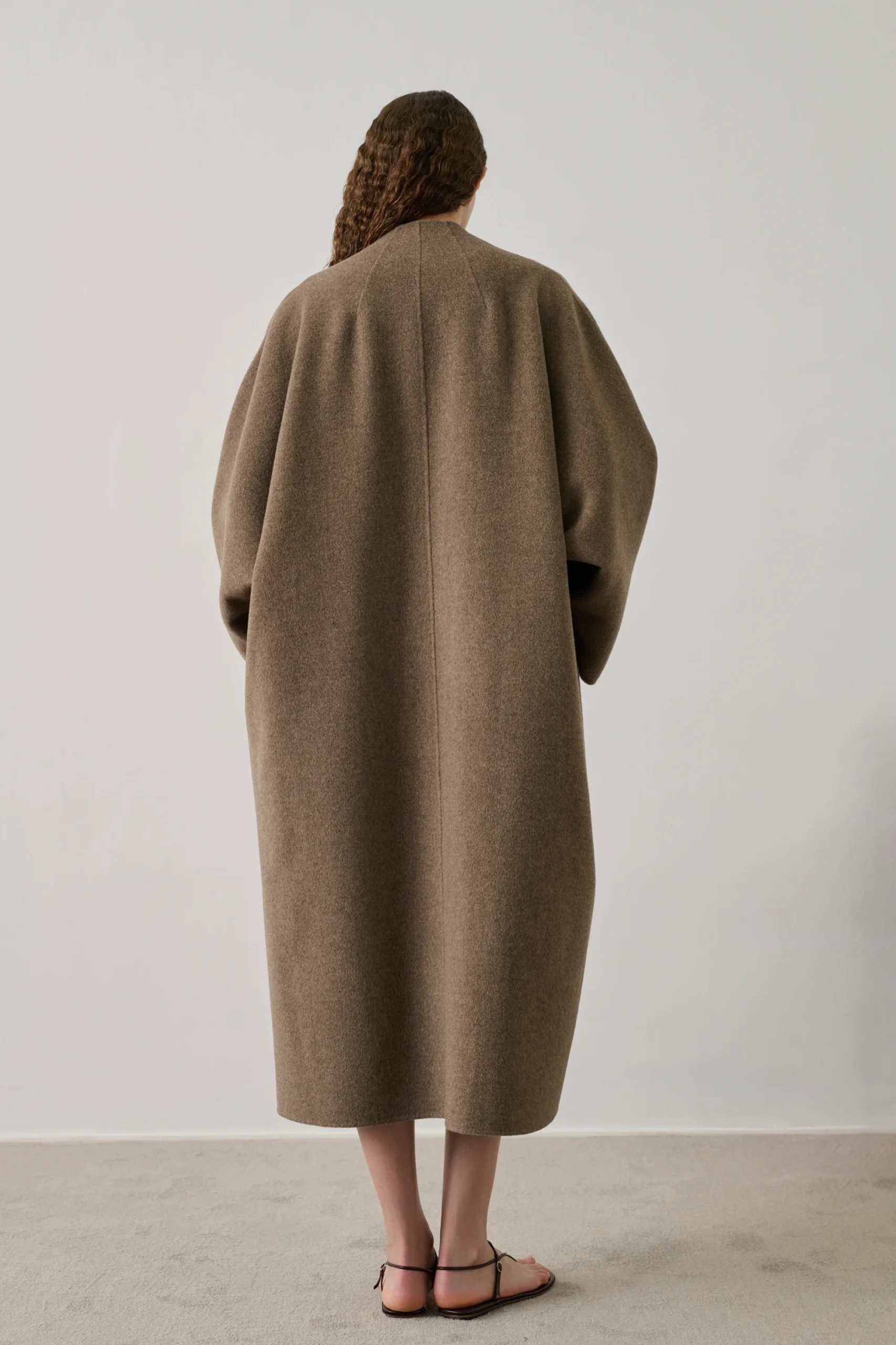 – Coupe ample – Manches longues et rondes – Fermeture avec bouton caché – Deux poches devant – Laine double face RWS (Responsible Wool Standard) et polyamide