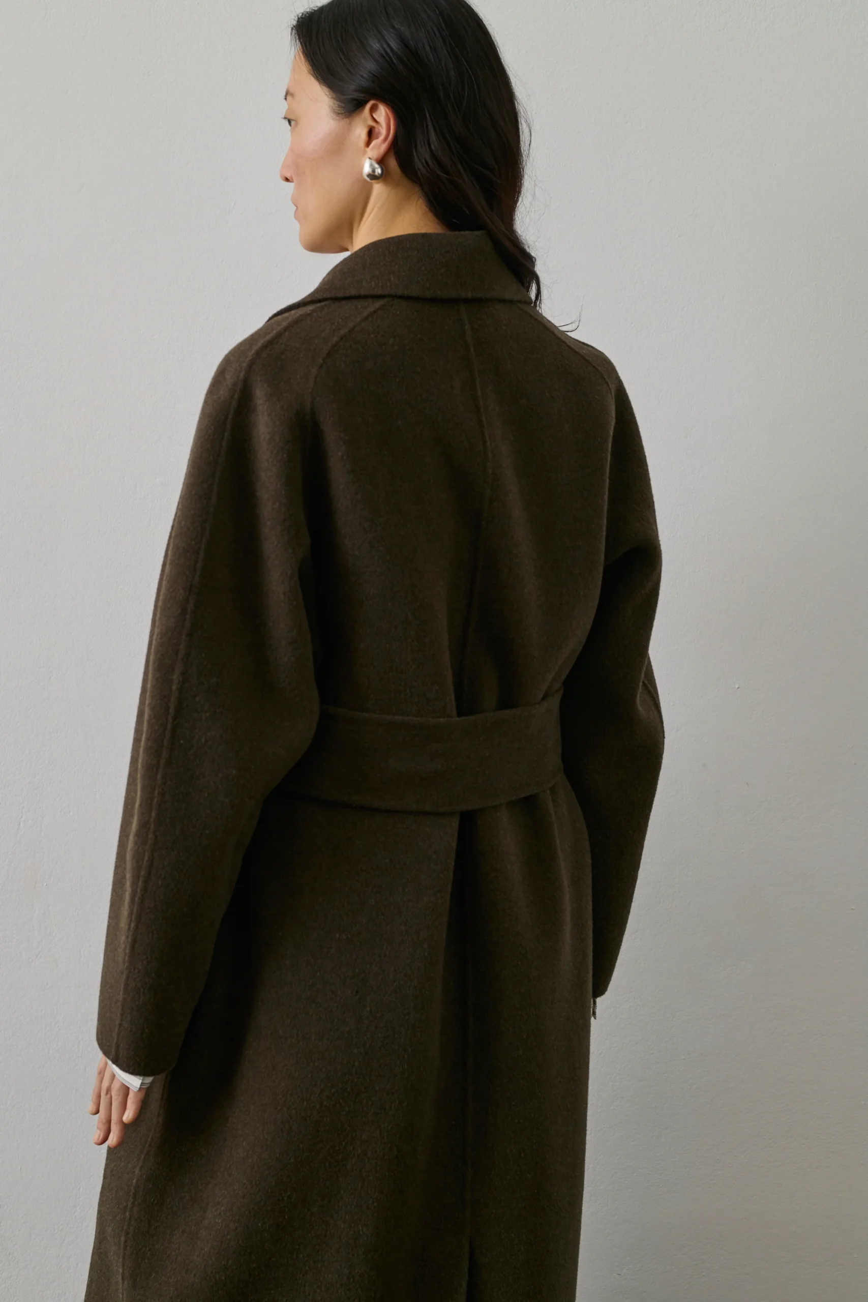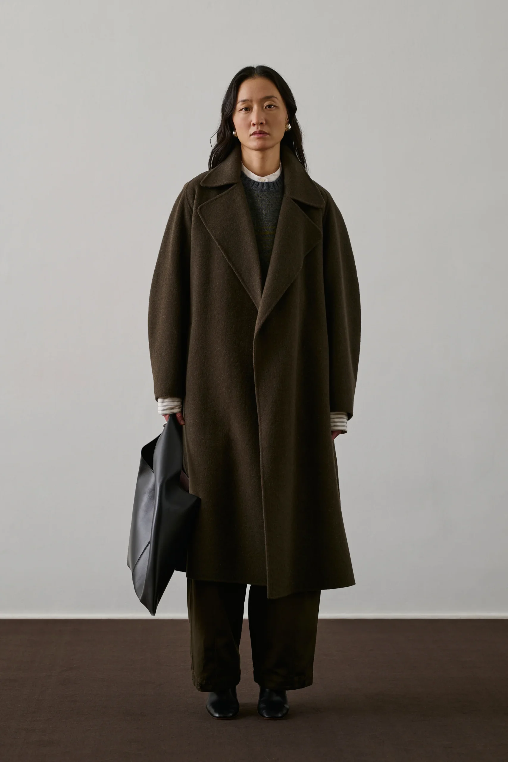 HARVARD est un manteau long en laine double face kaki brun. Sa forme ample et son col montant lui confèrent une allure élégante. La ceinture amovible et les poches passepoilées ajoutent fonctionnalité. Parfait pour l’hiver, il combine chaleur et douceur avec un style intemporel.