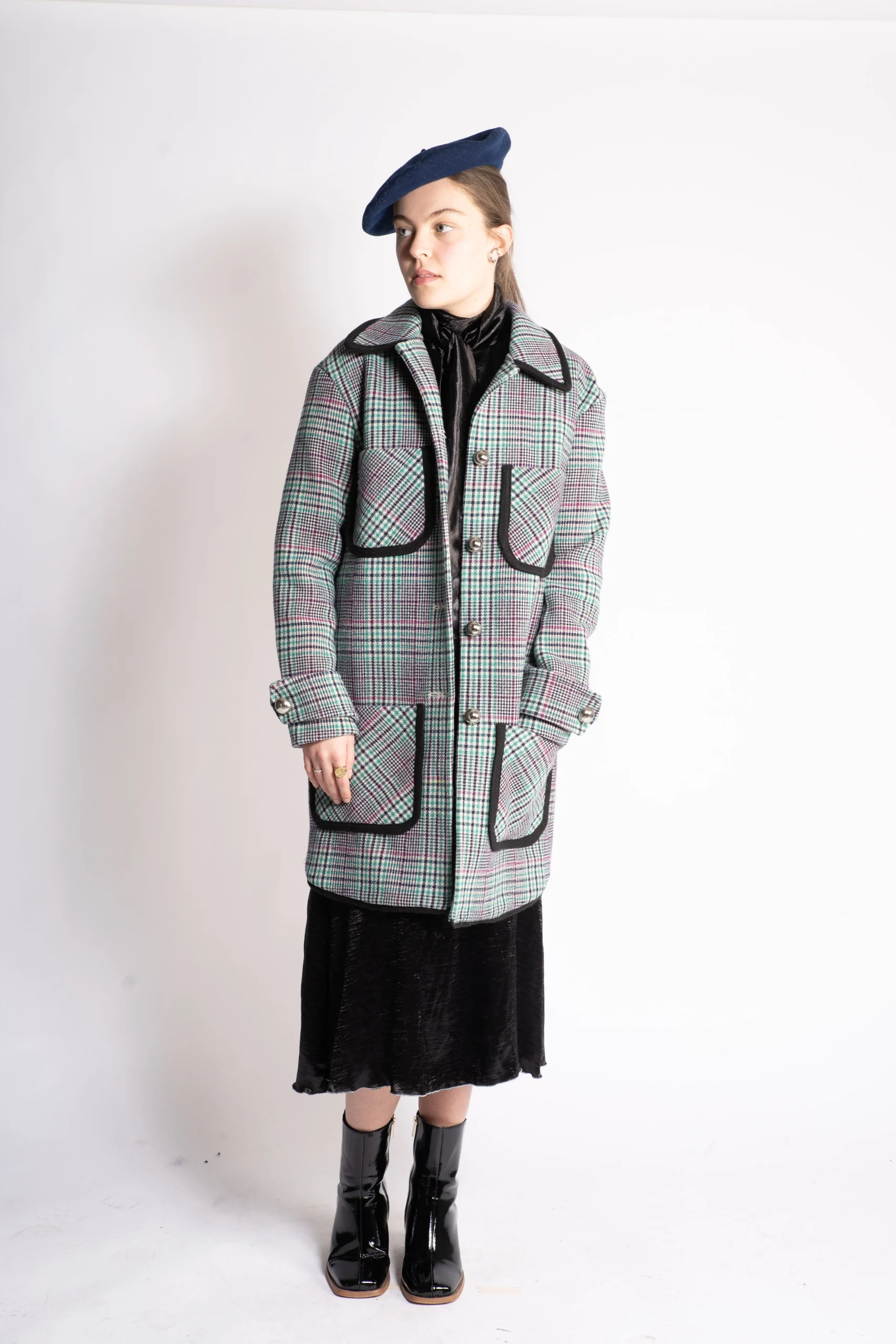 Manteau en laine prince de Galles premium. Coupe structurée, silhouette intemporelle. Détails raffinés, finitions couture. Fabriqué en France.