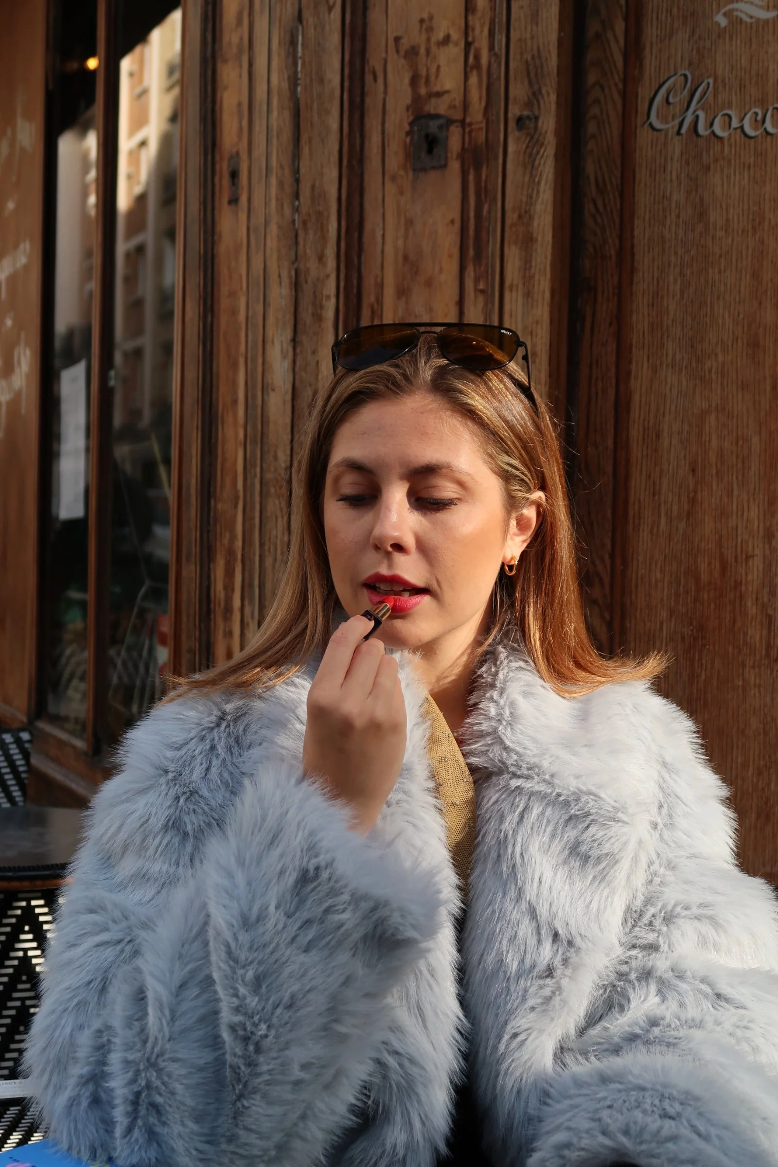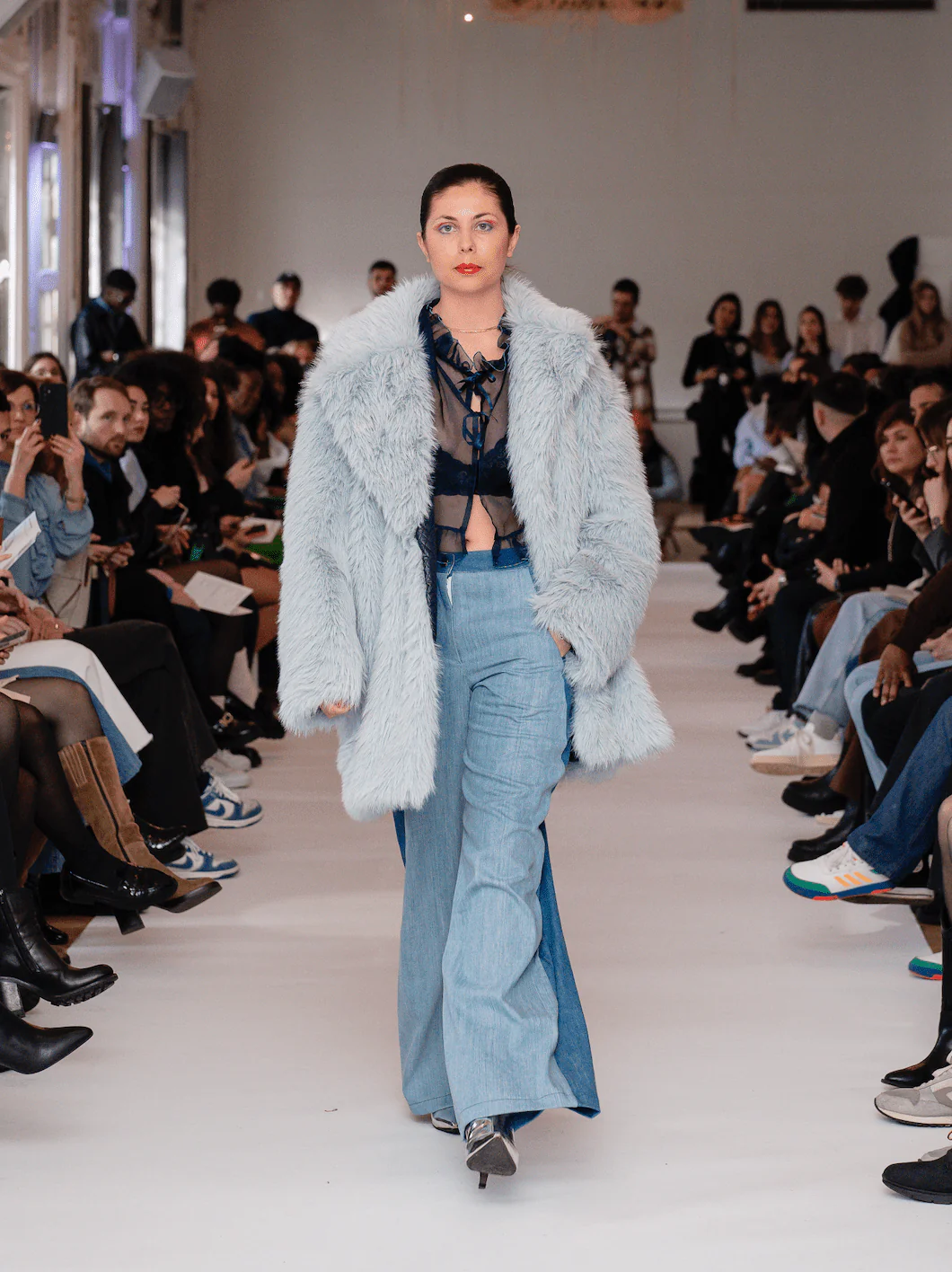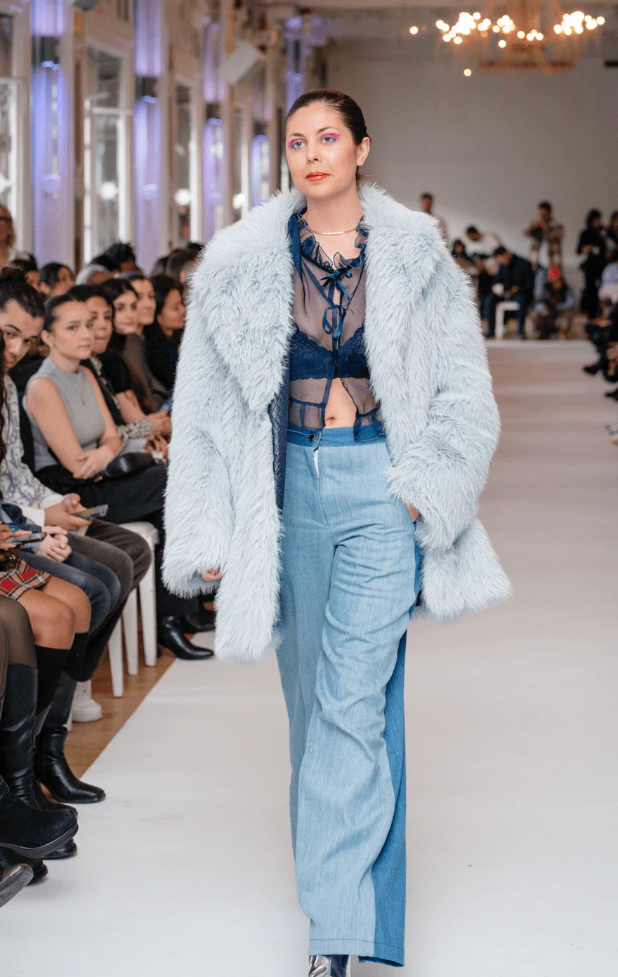 Manteau en fausse fourrure bleu ciel d’exception. Margaux fait une taille 38/M et porte une taille S