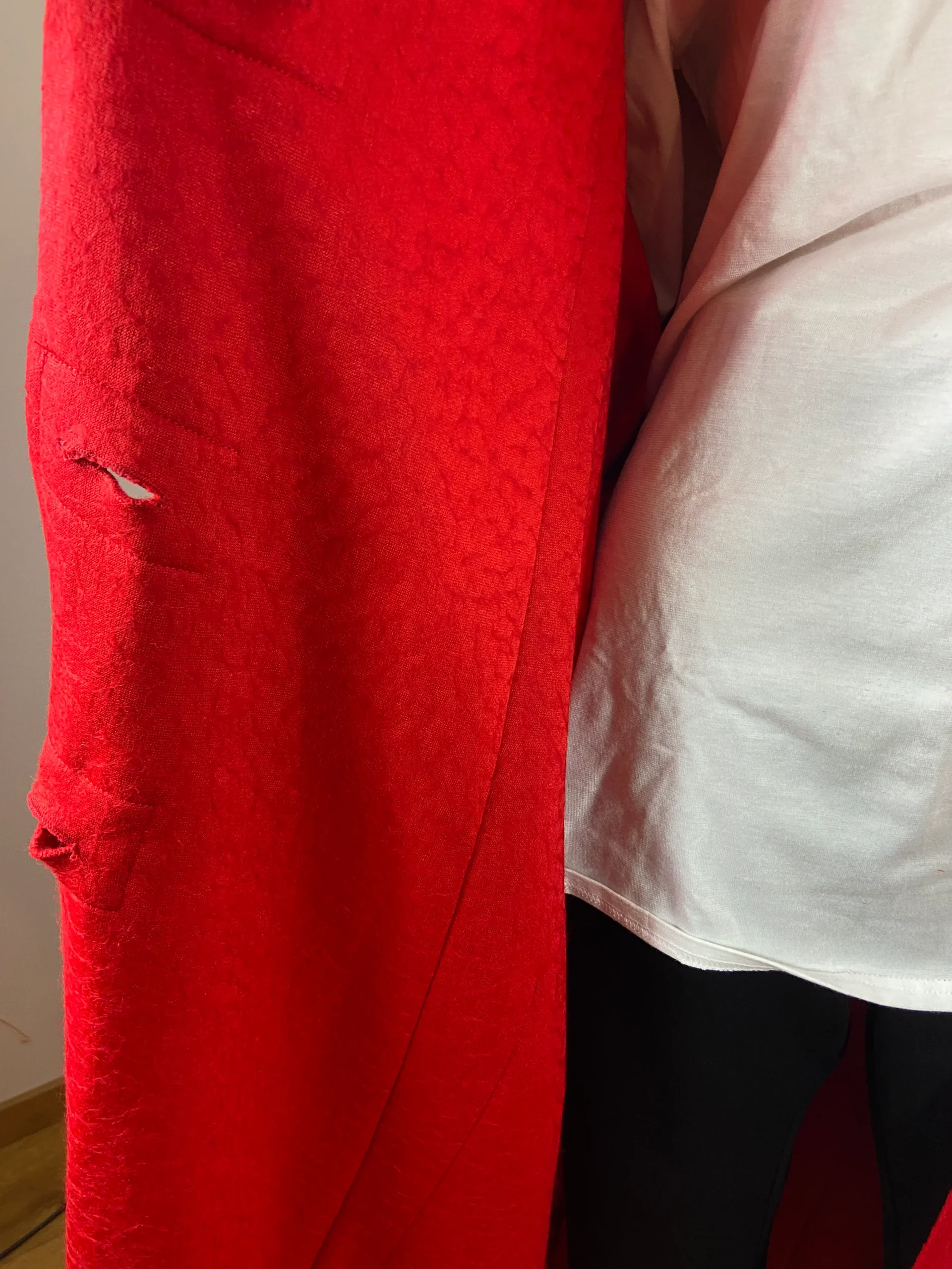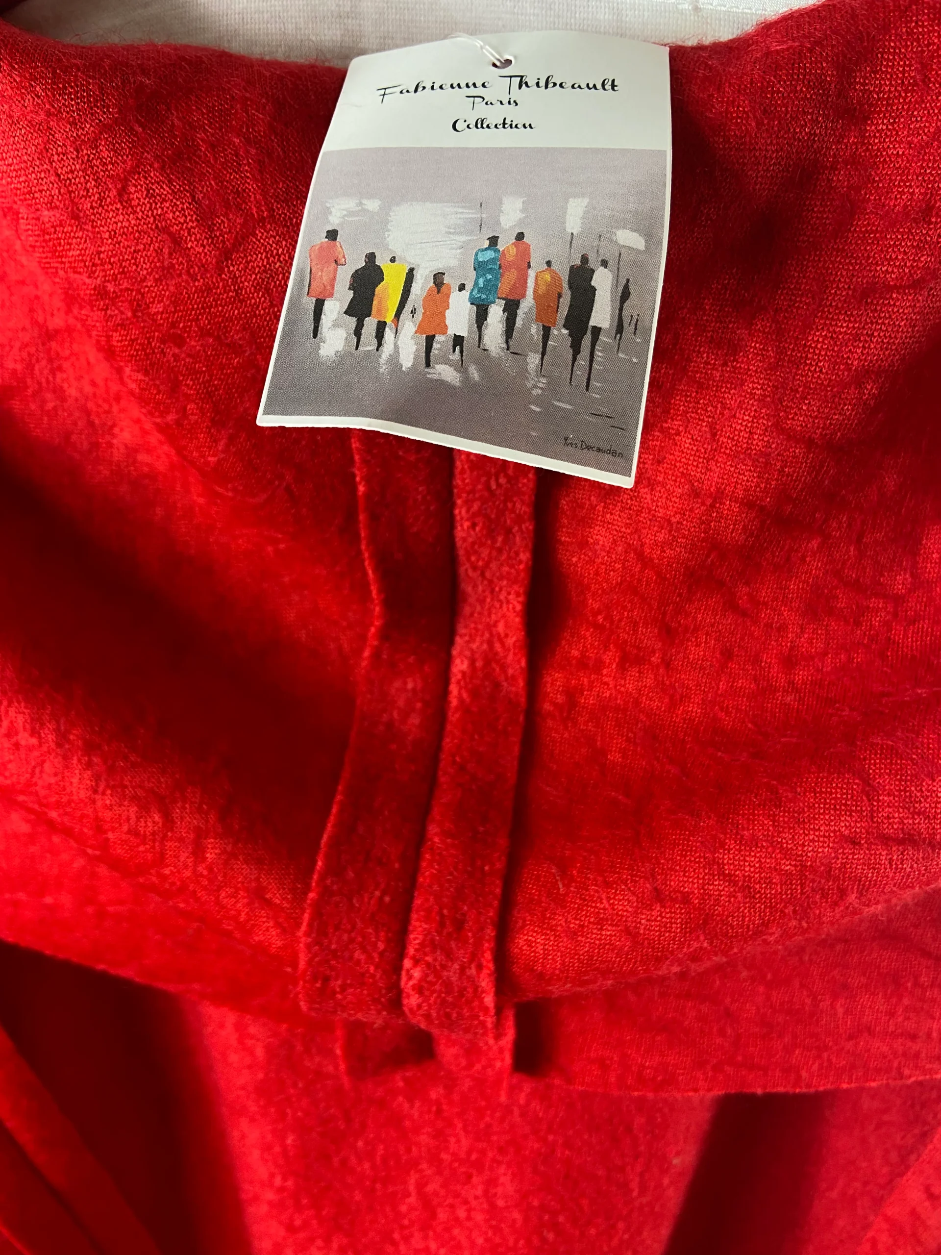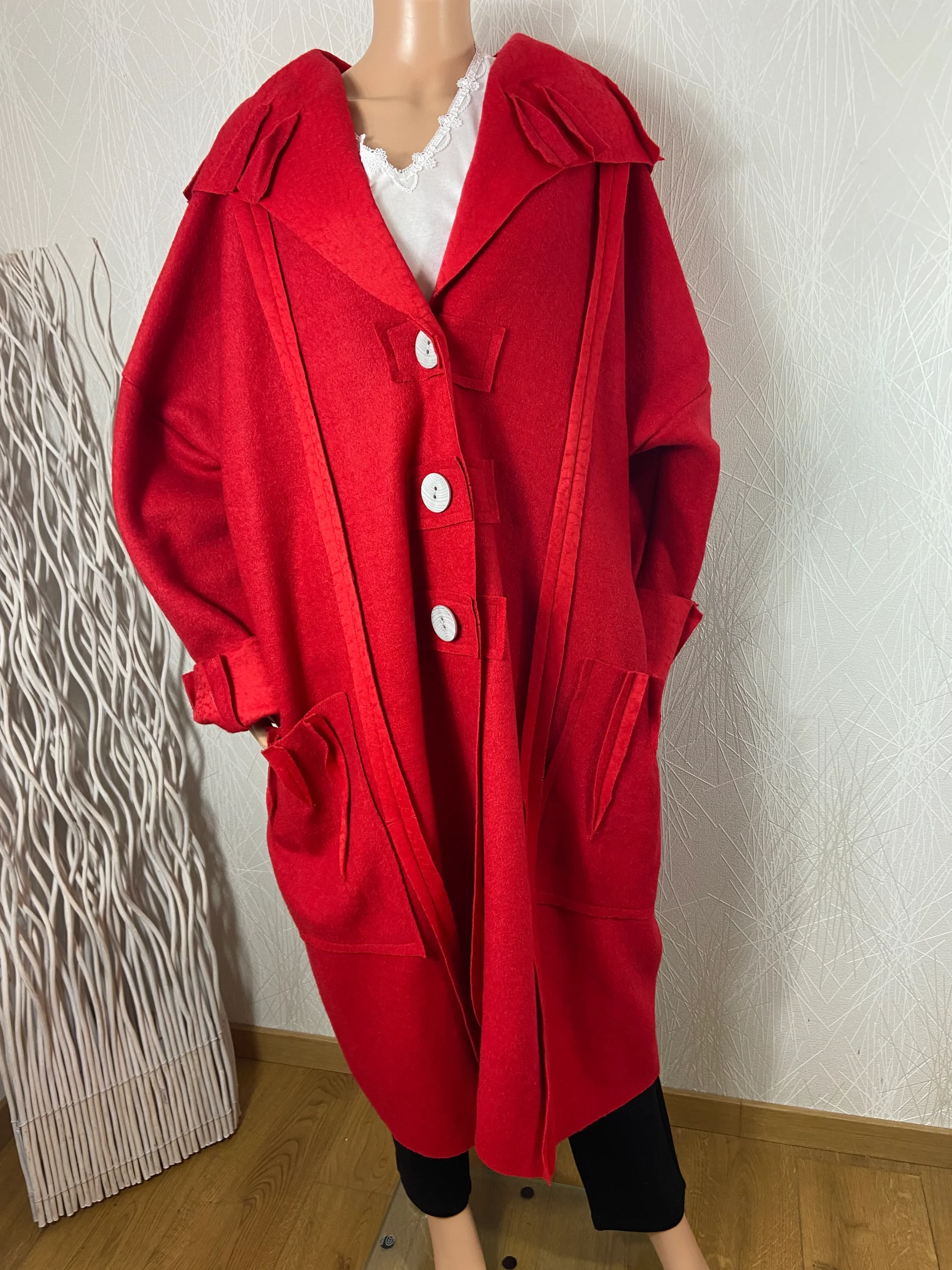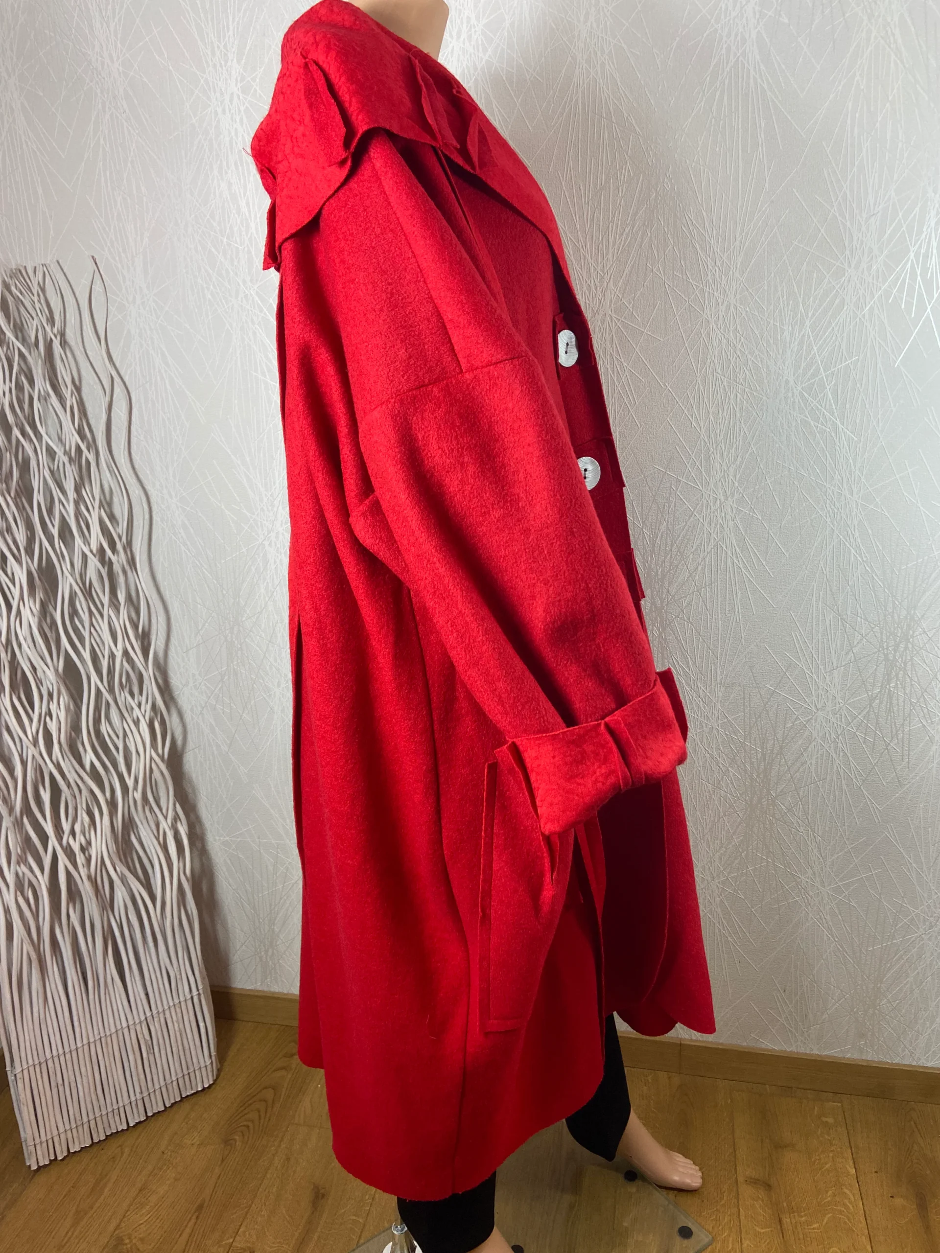 Manteau rouge ample 100% laine grande taille de la styliste Fabienne Thibeault