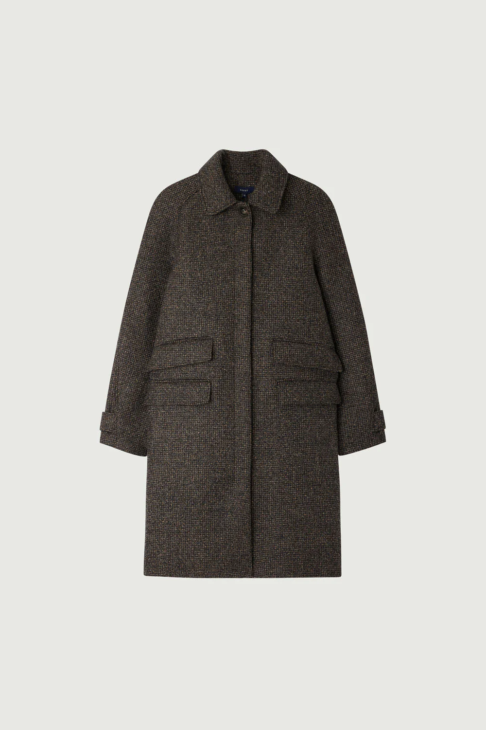 SIMBA est un manteau en drap de laine vierge au tombé impeccable. Sa coupe droite et ses manches raglan longues apportent une élégance intemporelle. La patte de boutonnage cachée et les quatre poches à rabat ajoutent une touche de sophistication. Le drap de laine moucheté assure chaleur et confort.