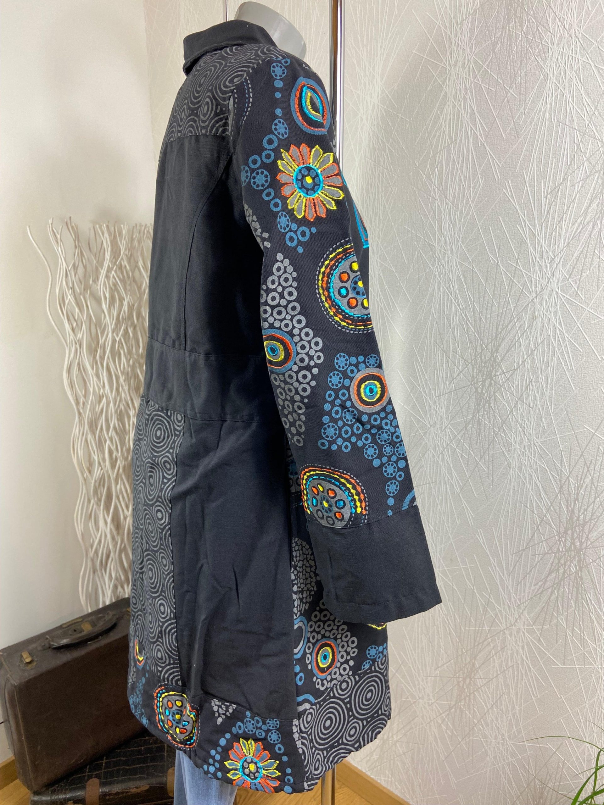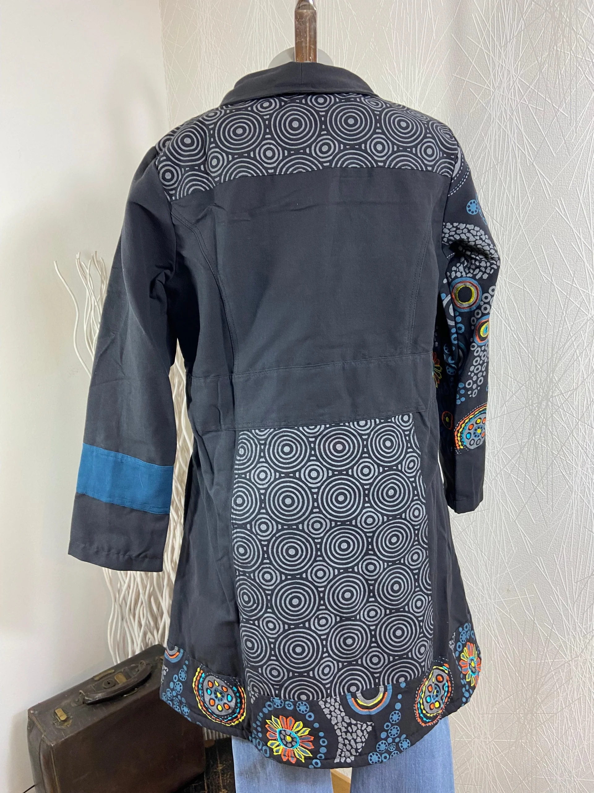 Différents motifs brodés en forme de cercles font le charme de ce joli manteau de tendance Hippie Chic.