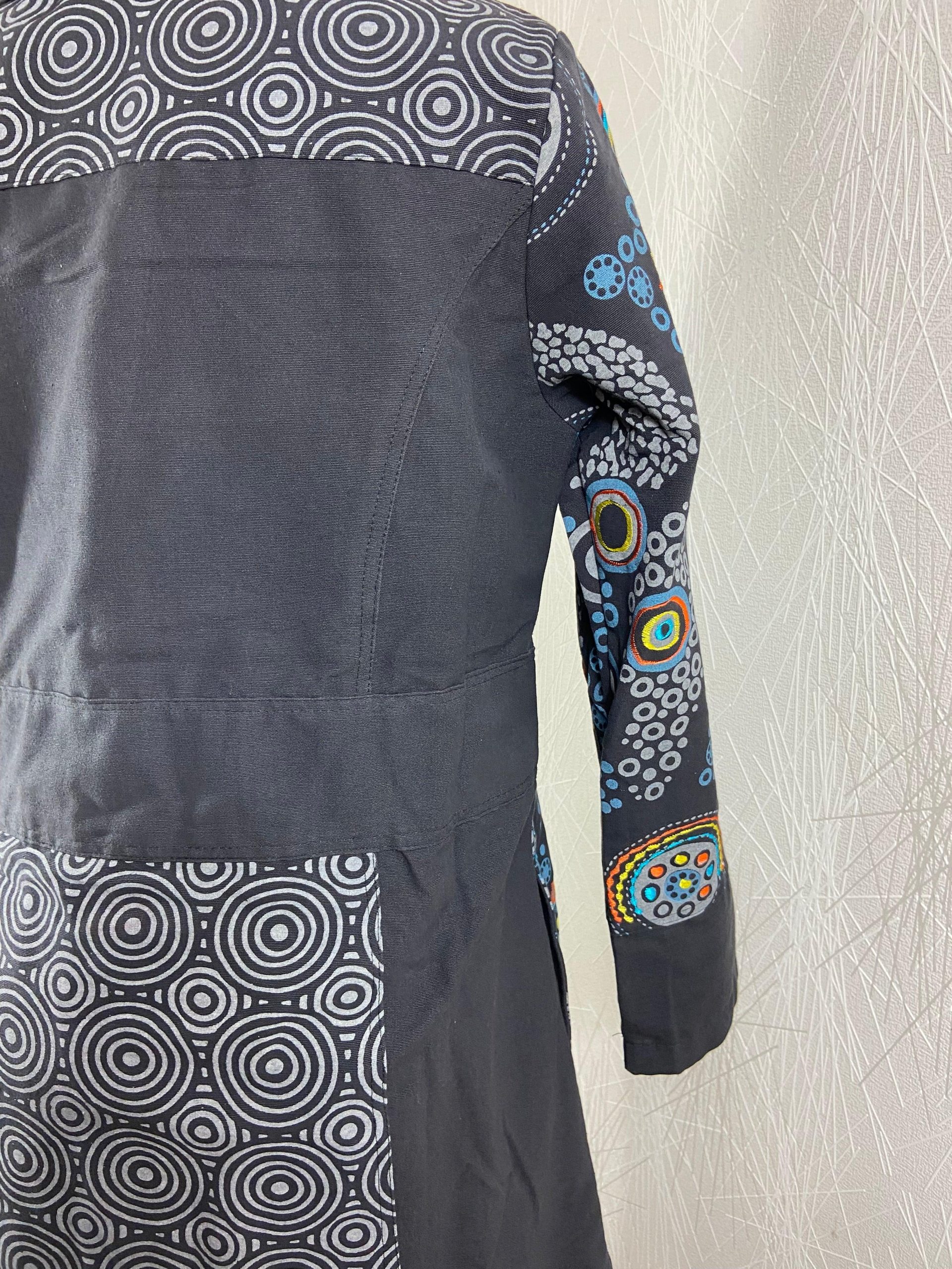 De style ethnique avec col chemise, légèrement évasé à partir de la taille, se ferme avec une fermeture éclair et il a 2 poches sur les côtés.