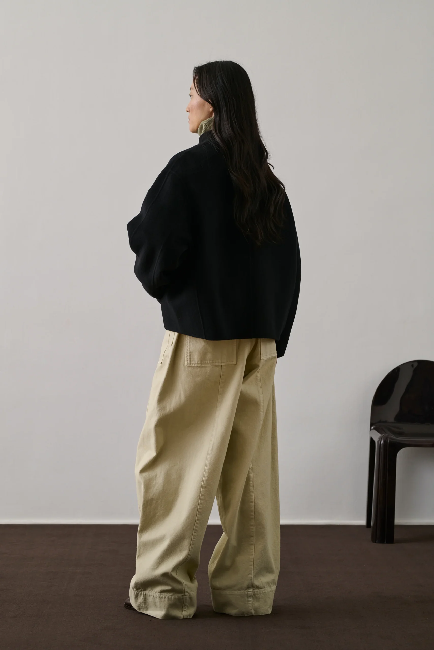 WINDSOR est une veste courte en laine et cachemire, idéale pour la mi-saison. Pensée comme un manteau léger ou une veste chaude, son design épuré en fait une pièce intemporelle iconique vestiaire Soeur. Son volume rond est accentué par des pinces au dos, des manches généreuses et deux poches plaquées au devant.