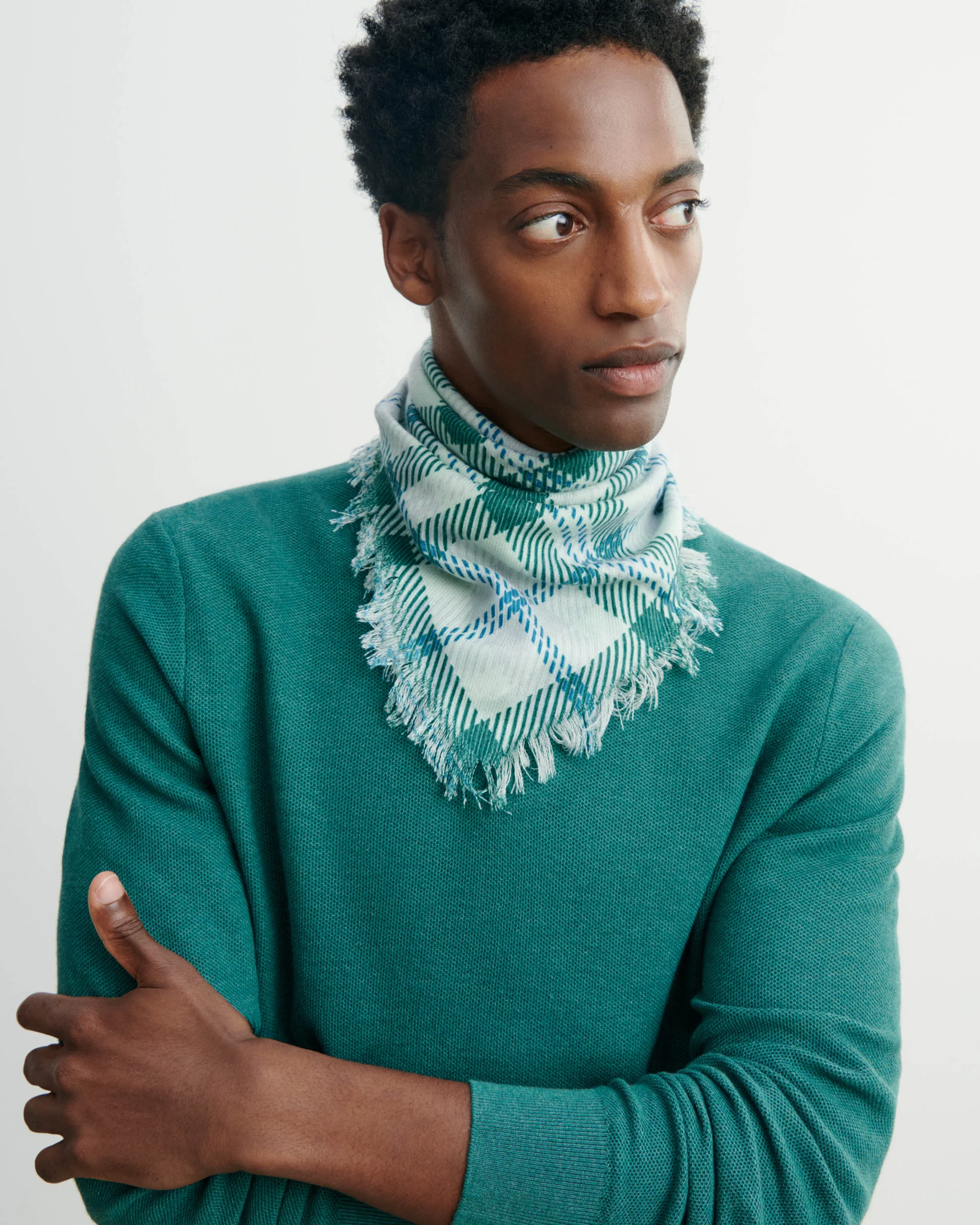 Foulard carré en voile de cachemire ultrafin. Modèle frangé, orné d’un motif à carreaux.