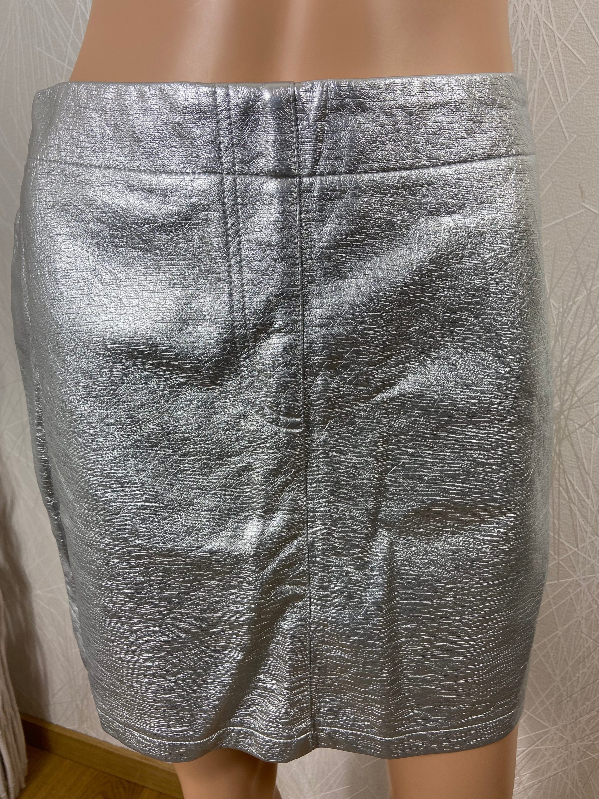 Mini jupe argentée de la marque In April 1986. Coupe droite et fermeture zip dans le dos. Matière : 55% polyester – 45% cuir polyuréthane Couleur : Argenté Marque : In April 1986 Taille S-M / 36-38 – Réf : 36PJ2940 Dimensions : Tour de taille : 71 cm ; longueur : 40 cm.