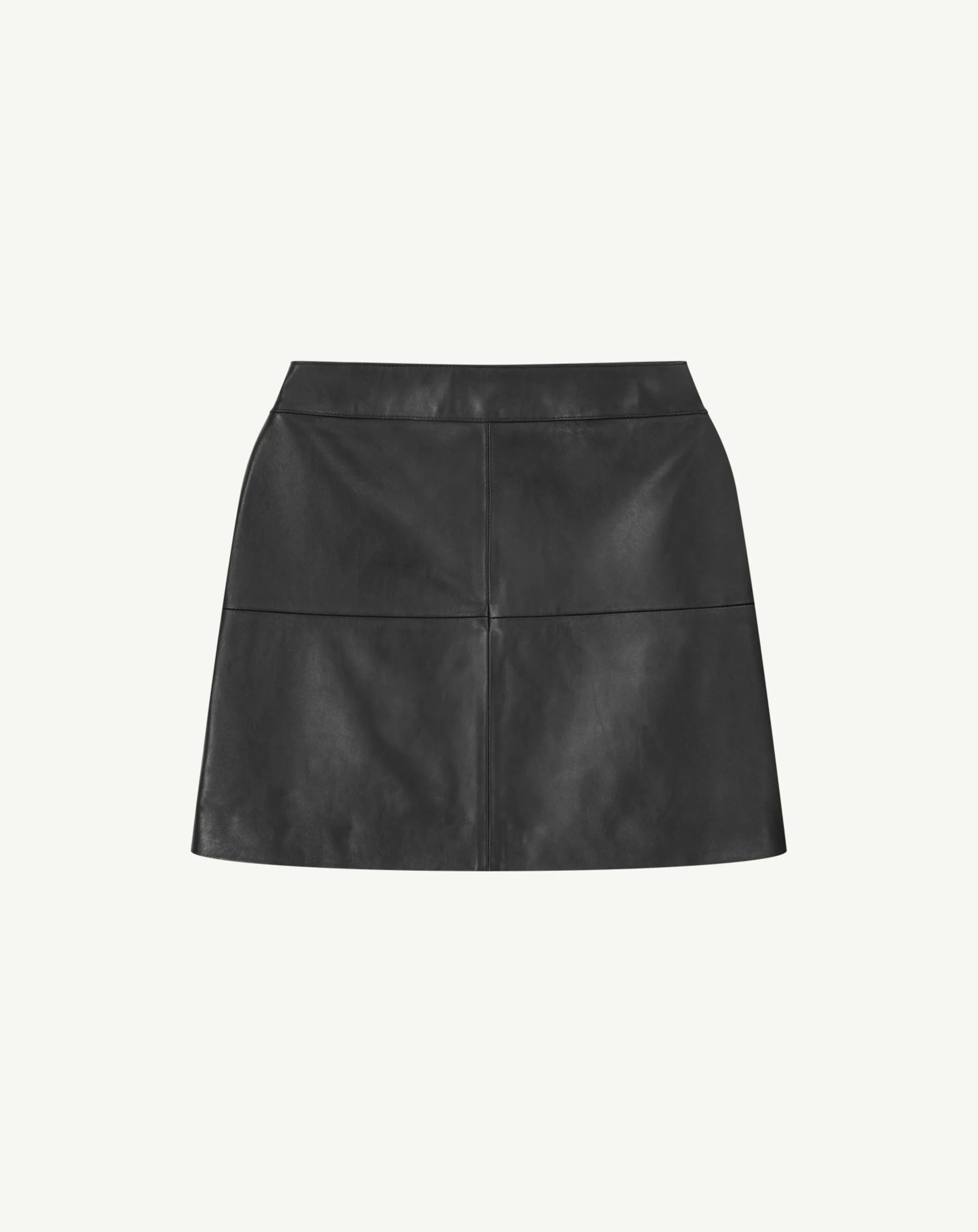 Mini jupe en cuir. Modèle à coupe évasée, confectionné à partir de plusieurs empiècements.