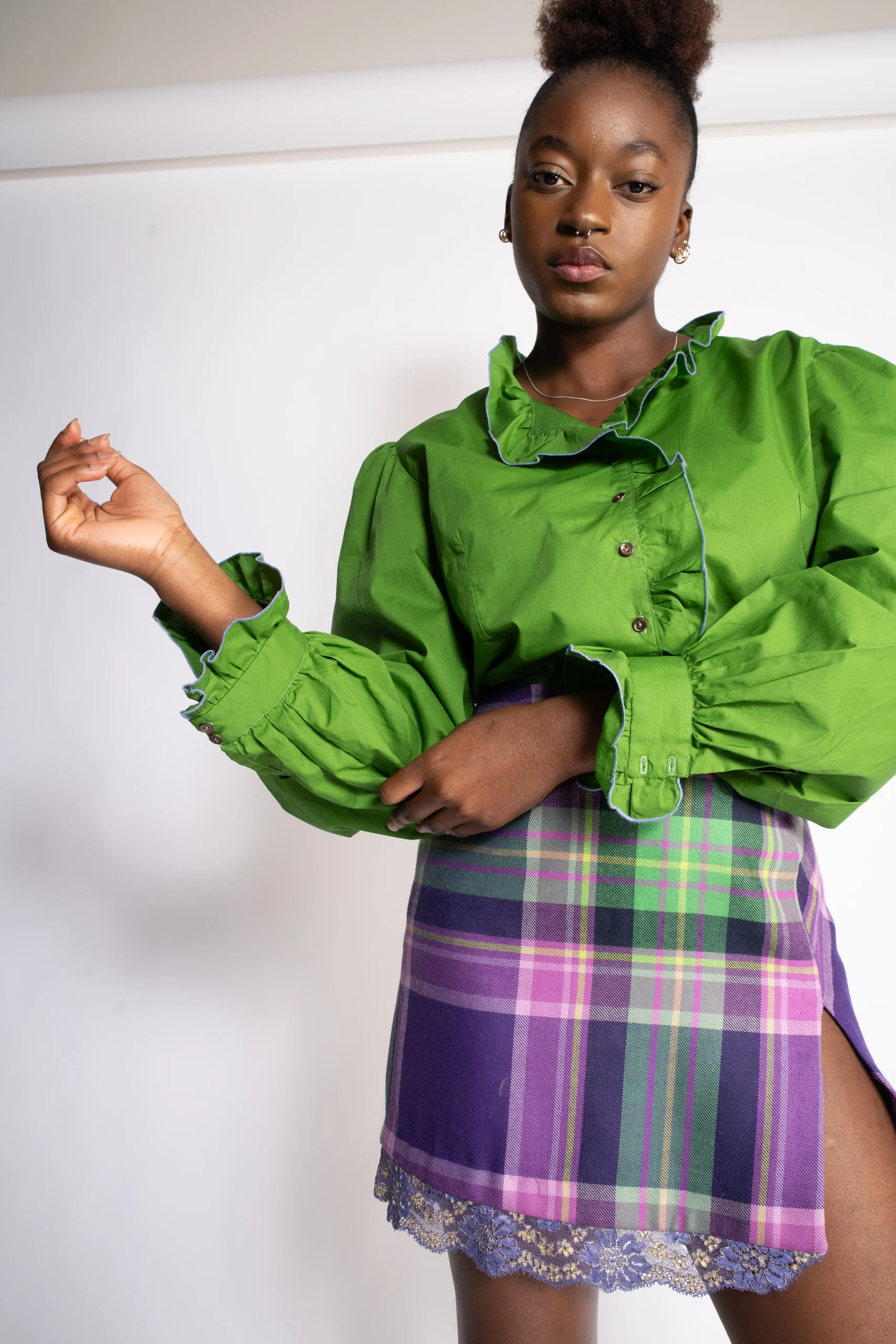 Mini jupe en laine vierge d’Écosse. Fente et détails dentelle. Coupe droite, longueur 40 cm. Fabriquée en France.