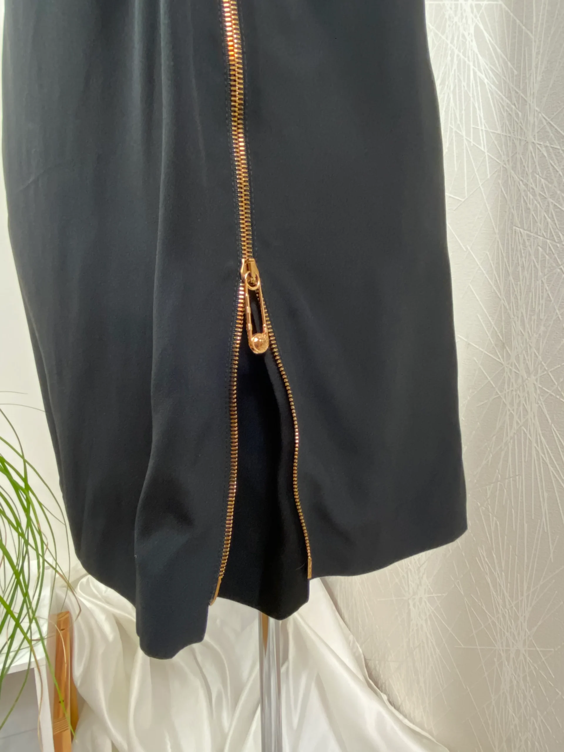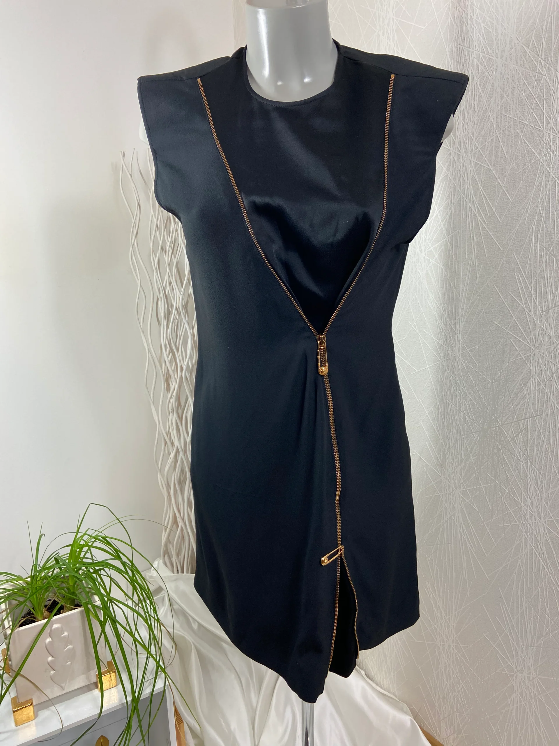 Celle robe de soirée haut de gamme a des épaulettes, des fermetures zippées dorées en diagonale sur le devant avec épingles à nourrice Medusa.