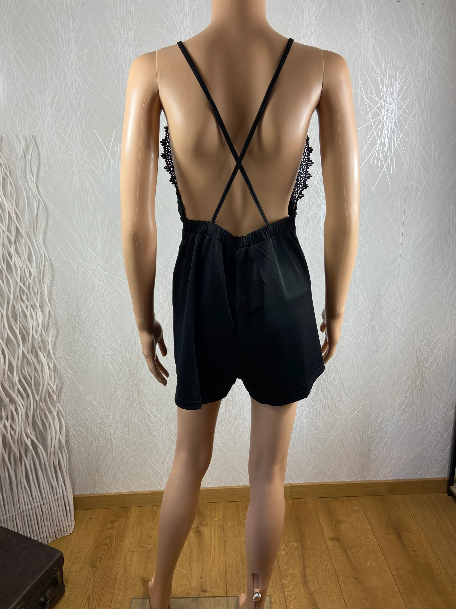Dos nu, joli dentelle à la taille et au buste ainqi que de fines bretelles croisées dans le dos.