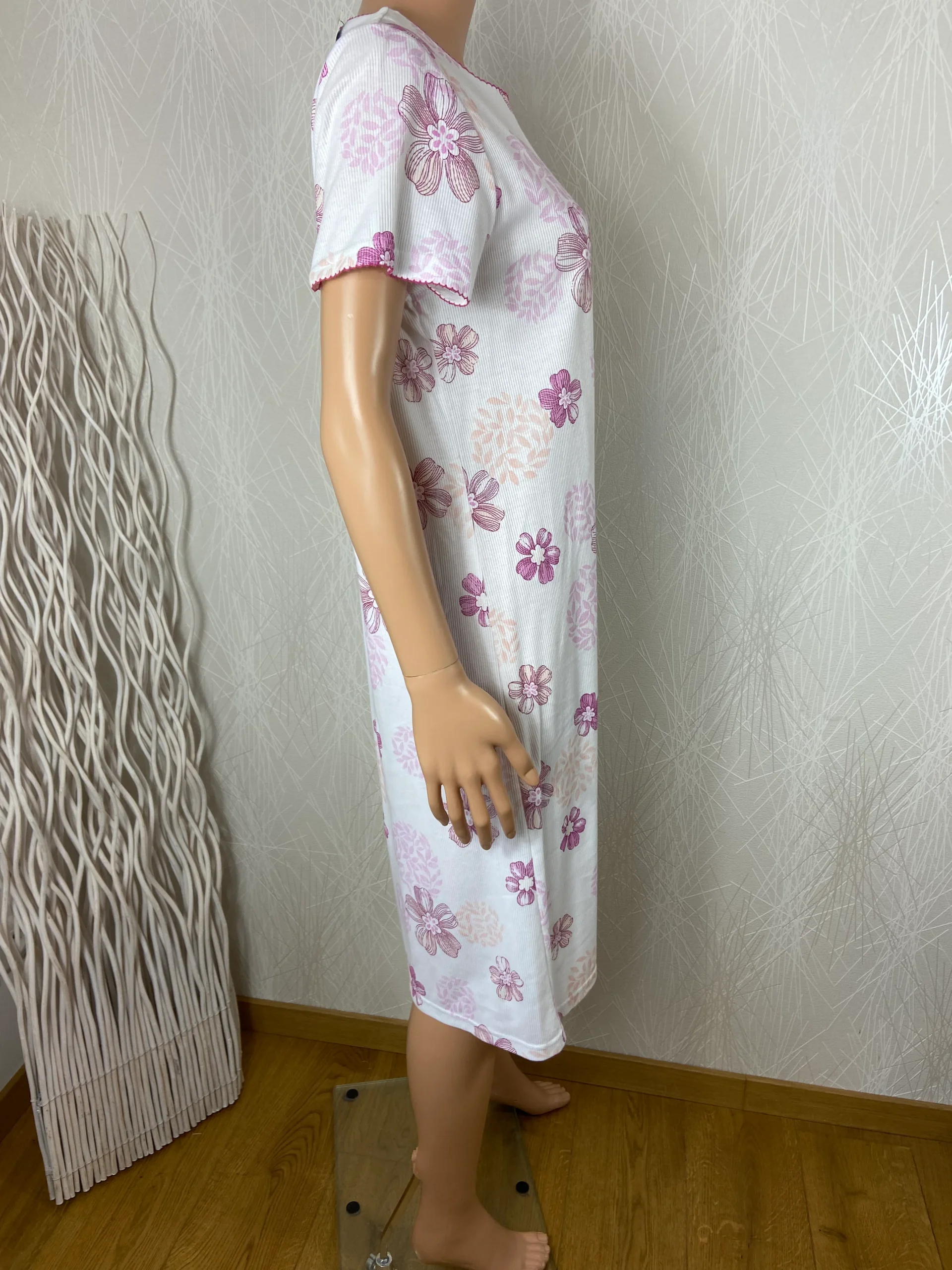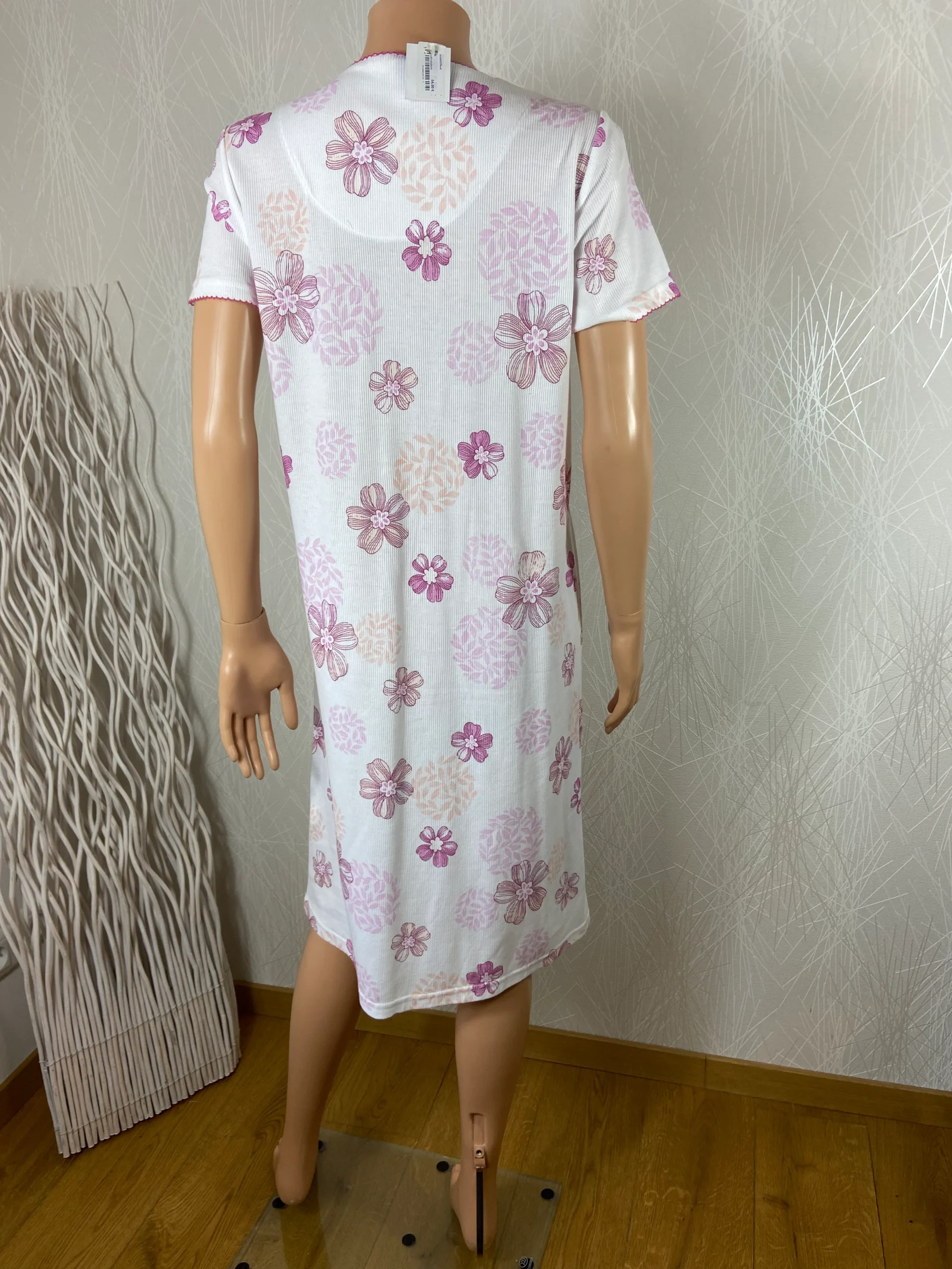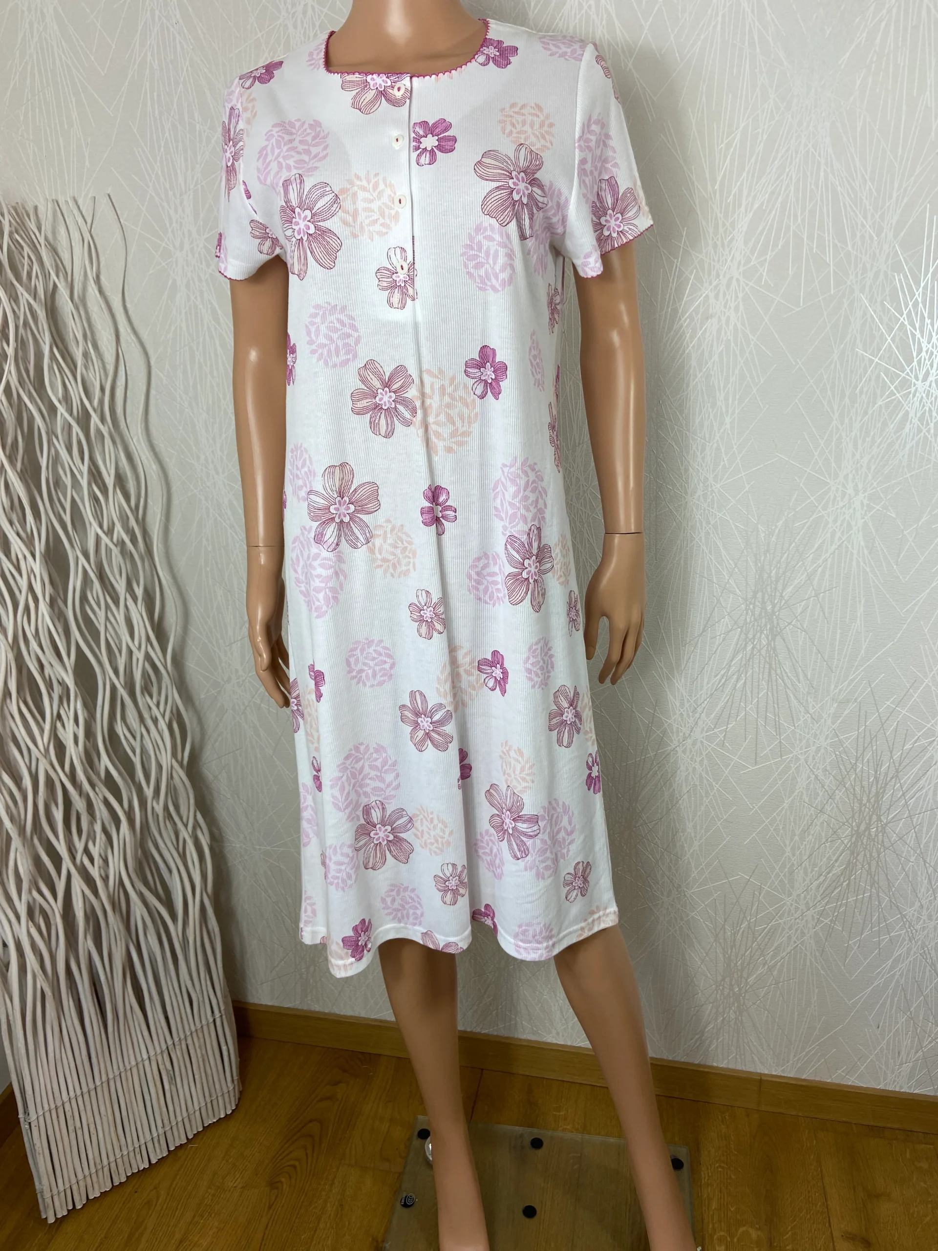 Chemise de nuit à manches courtes, encolure ronde avec 4 boutons, coupe droite et tissu à motif fleuri.