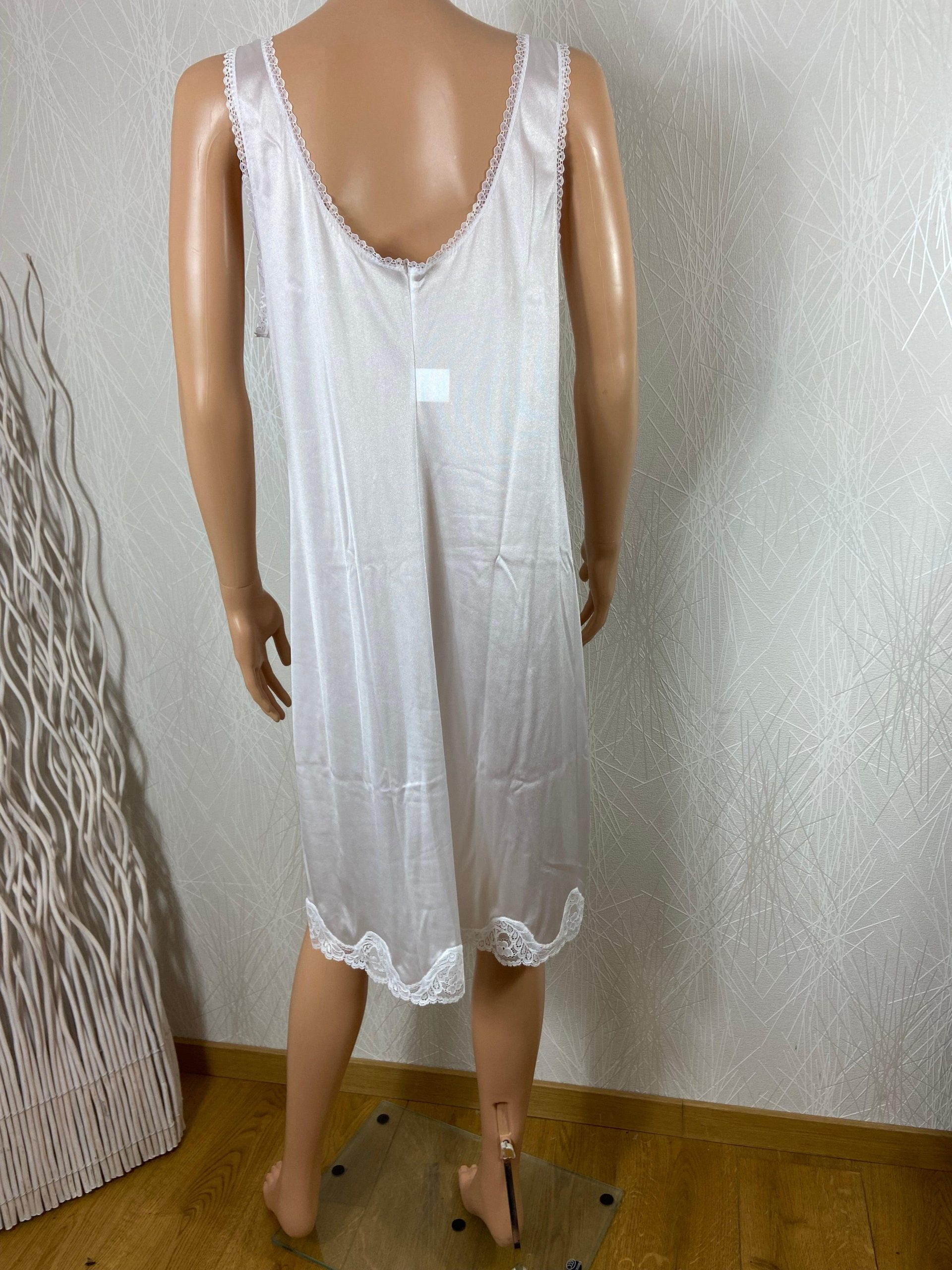 Nuisette blanche en tissu satin modèle Valentine de la marque Privilège. Coupe sans manches, dentelle à l’encolure, tissu effet satiné, broderies sur le bas et coupe droite. Bonne fabrication française. Matière : 100% polyamide Couleur : Blanc Marque : Privilège Dimensions Taille 44 : tour de poitrine : 100cm ; longueur : 98 cm. Dimensions […]