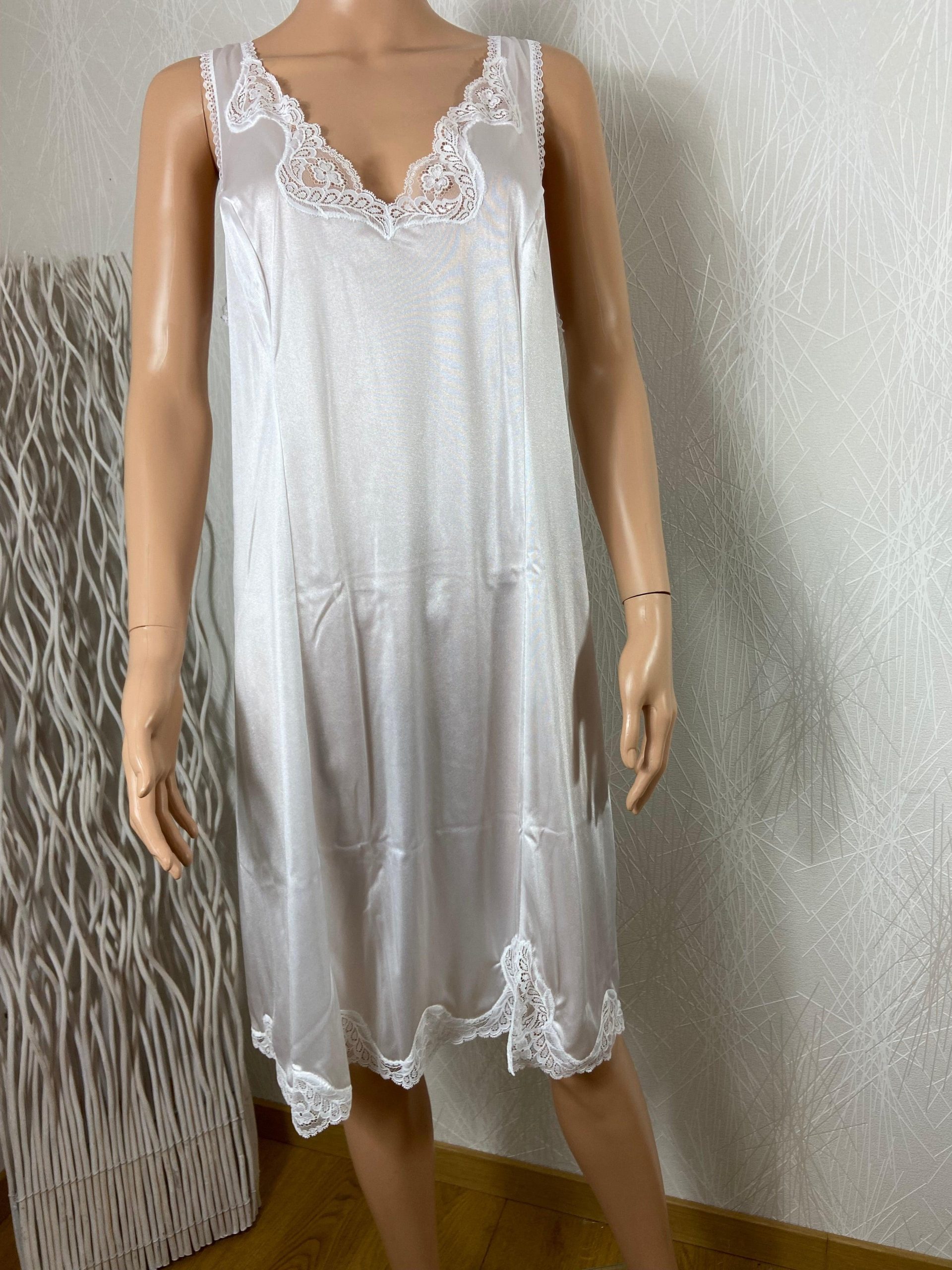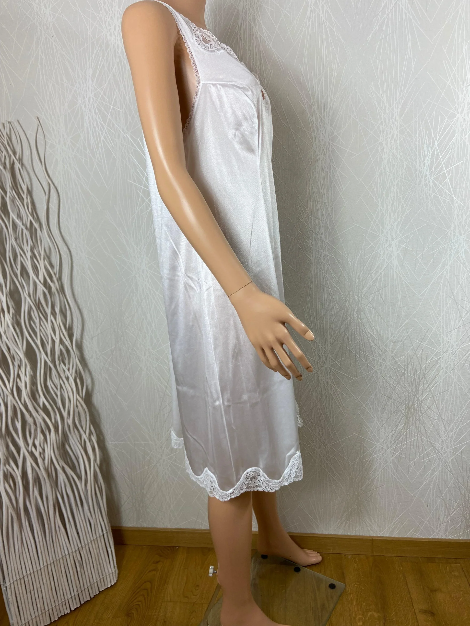 Coupe sans manches, dentelle à l’encolure, tissu effet satiné, broderies sur le bas et coupe droite.