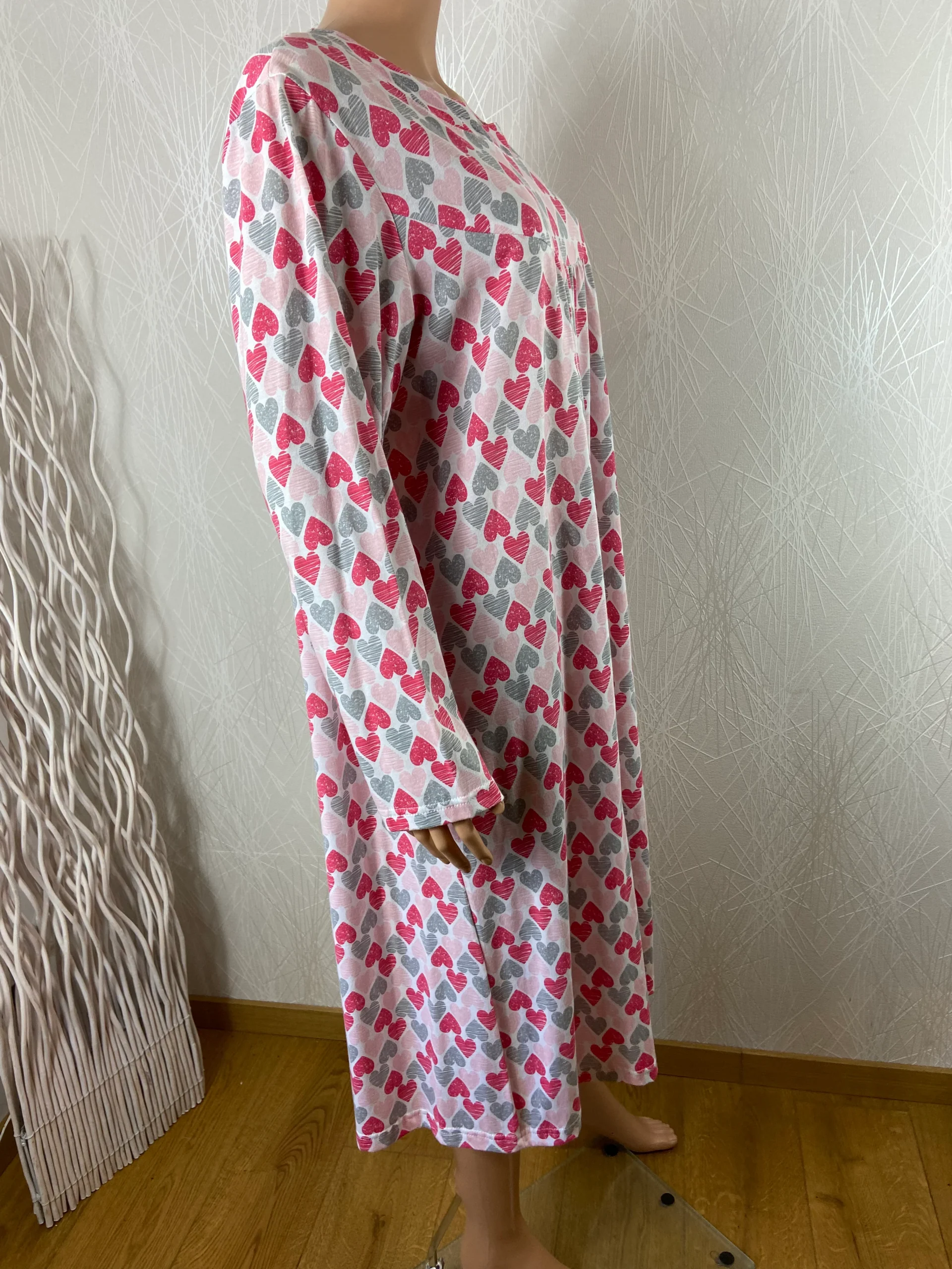 Chemise de nuit à manches longues, encolure ronde, tissu à motif de coeur, coupe droite et fermeture au dos avec scratch à la nuque.