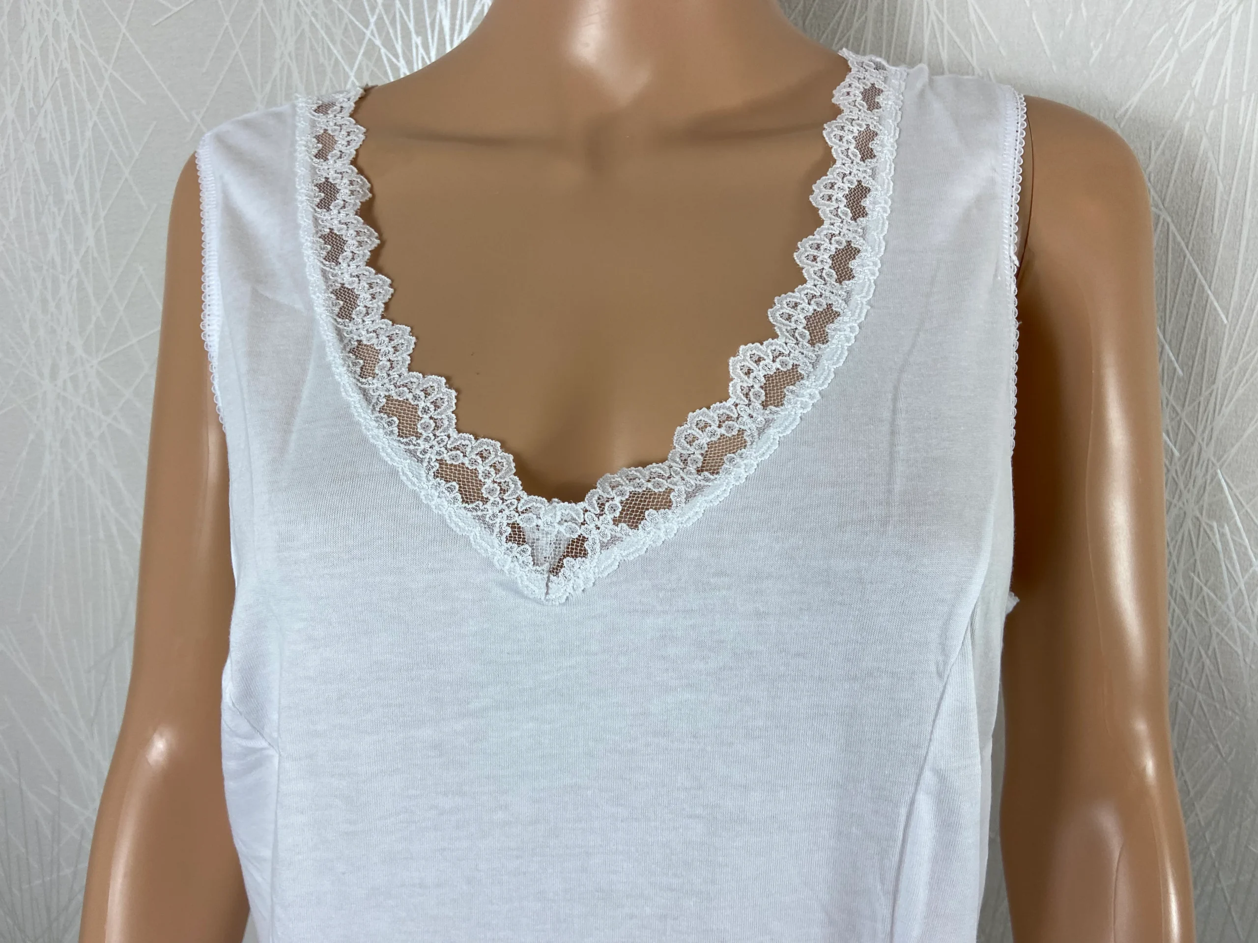 Coupe sans manches, encolure en V avec dentelle, coupe droite et dentelle sur le bas.