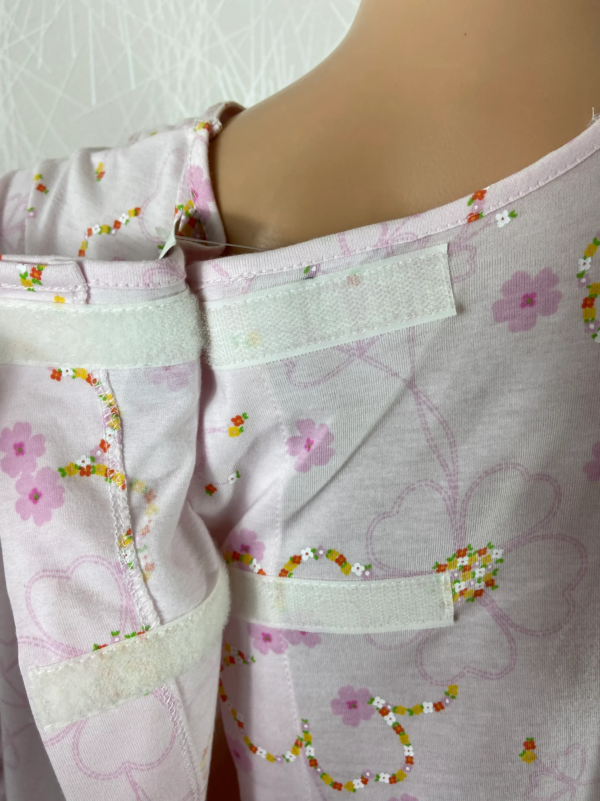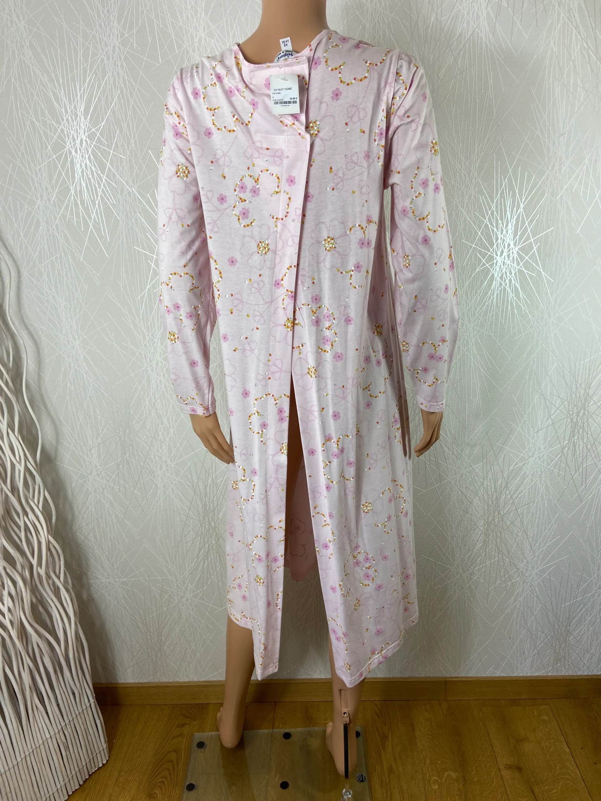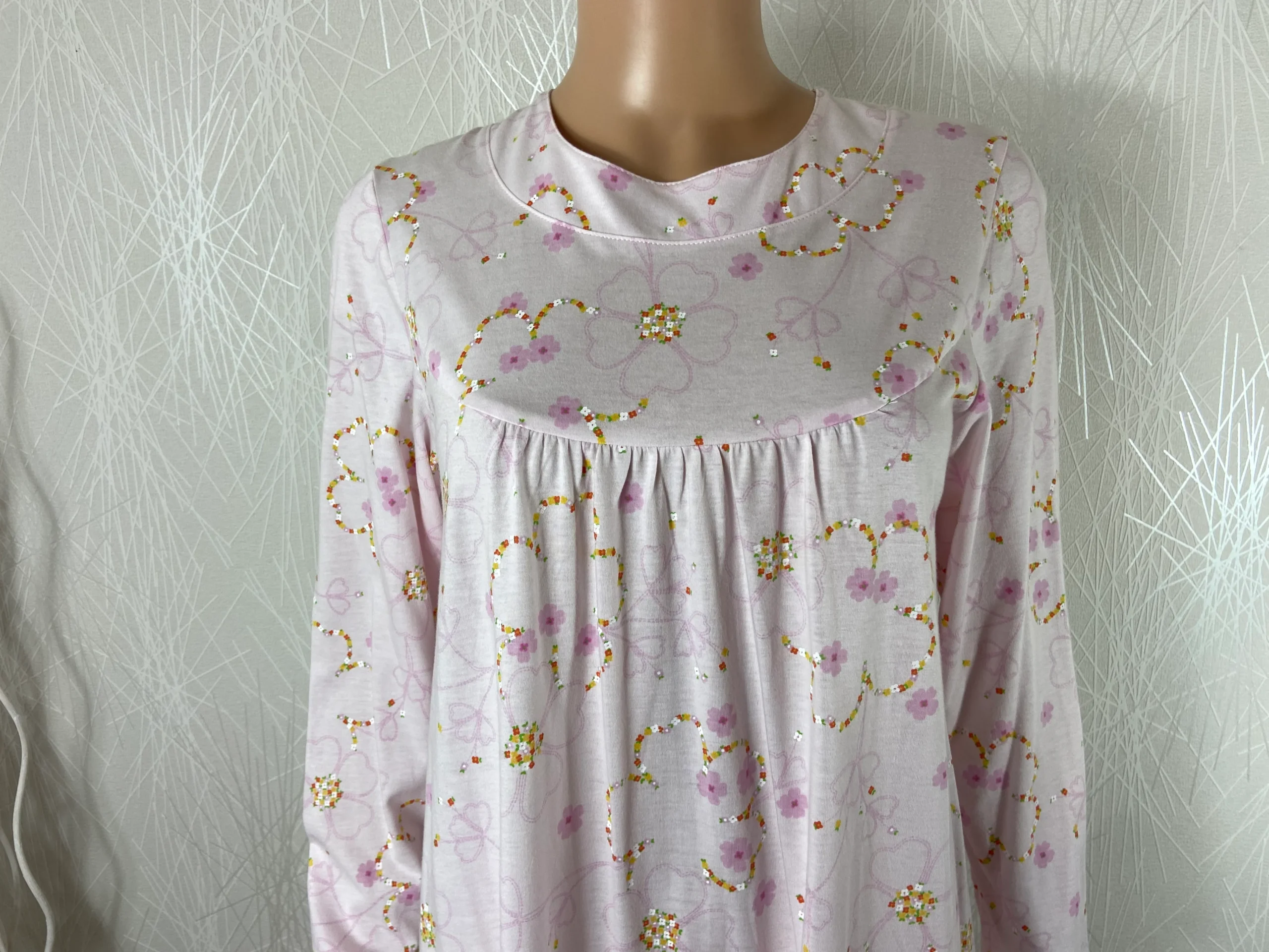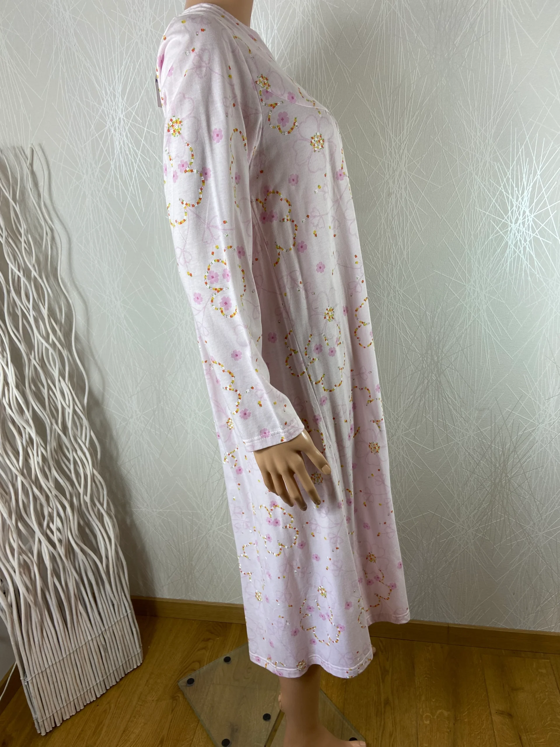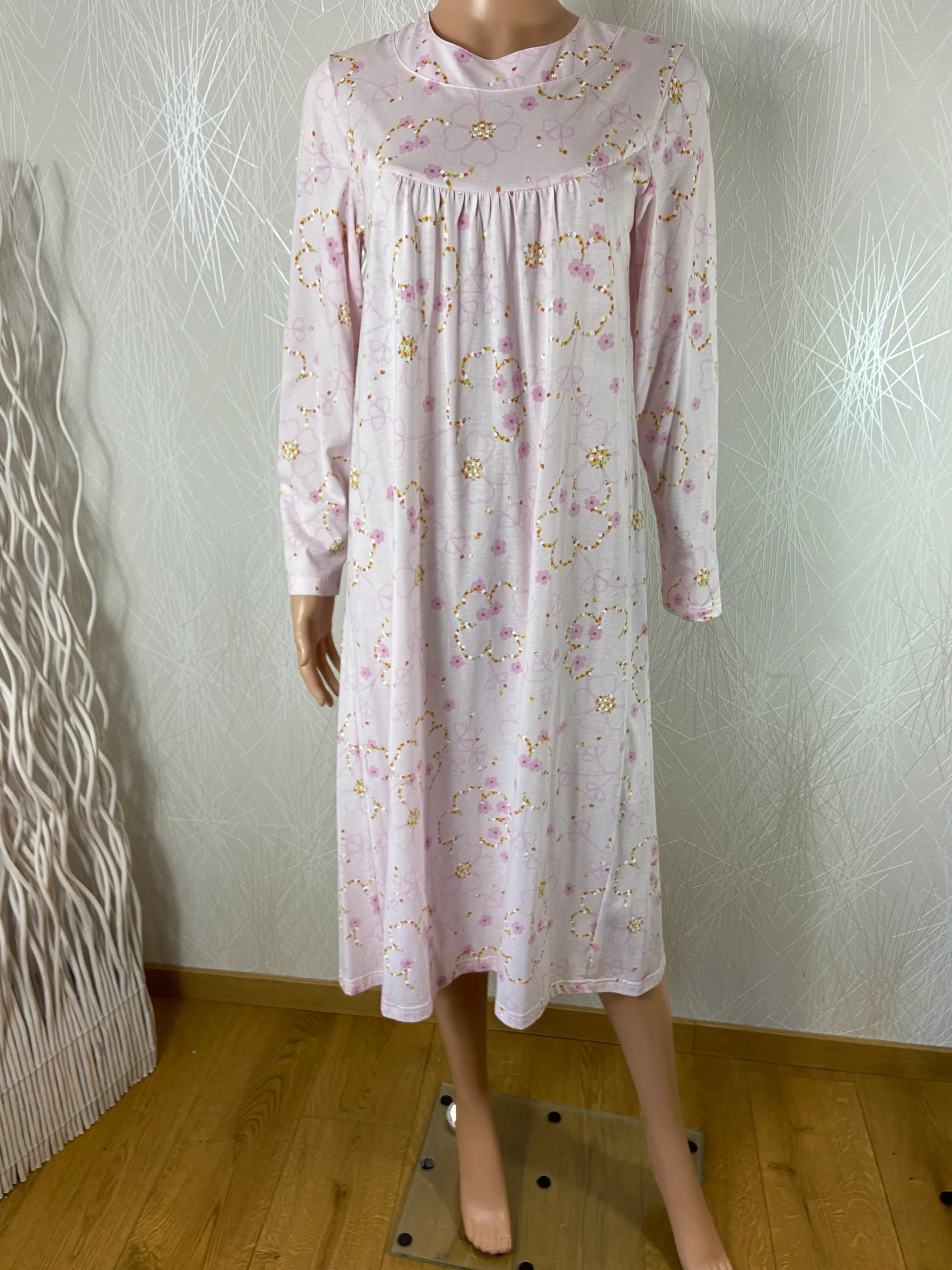 Chemise de nuit à manches longue, encolure ronde, ouverture dans le dos avec scratch à la nuque et tissu en coton à motif fleuri.