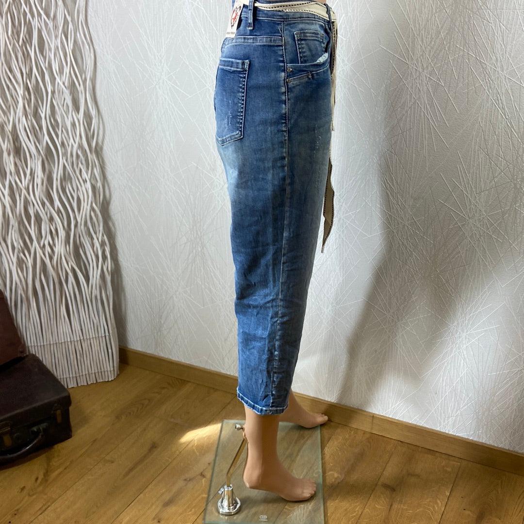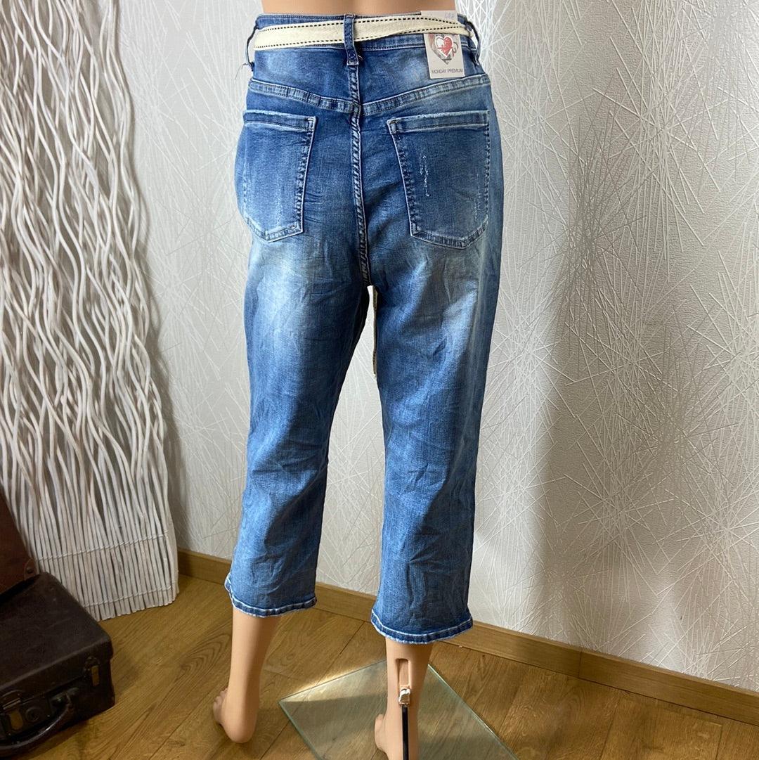 Pantacourt en tissu denim jeans bleu pour femme de la marque Monday Premium. Taille haute avec cordon à nouer à la taille, très confortable, coupe près du corps, légèrement délavé, 3 poches à l’avant, 2 poches à l’arrière, fermeture bouton et zip. Matière : 65,4% coton – 26,4% polyester – 3,2% rayon – 3% elasthanne […]