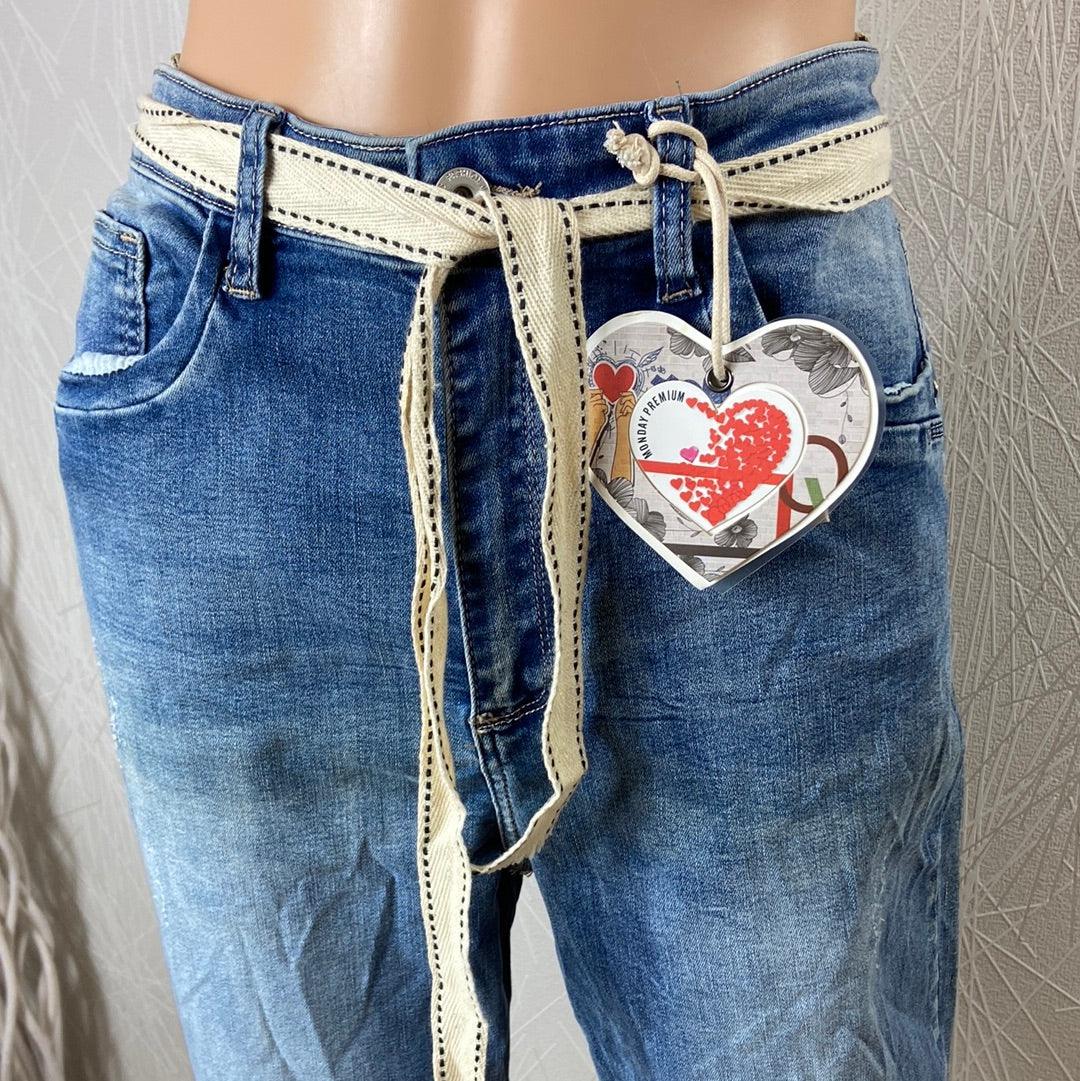 Taille haute avec cordon à nouer à la taille, très confortable, coupe près du corps, légèrement délavé, 3 poches à l’avant, 2 poches à l’arrière, fermeture bouton et zip.