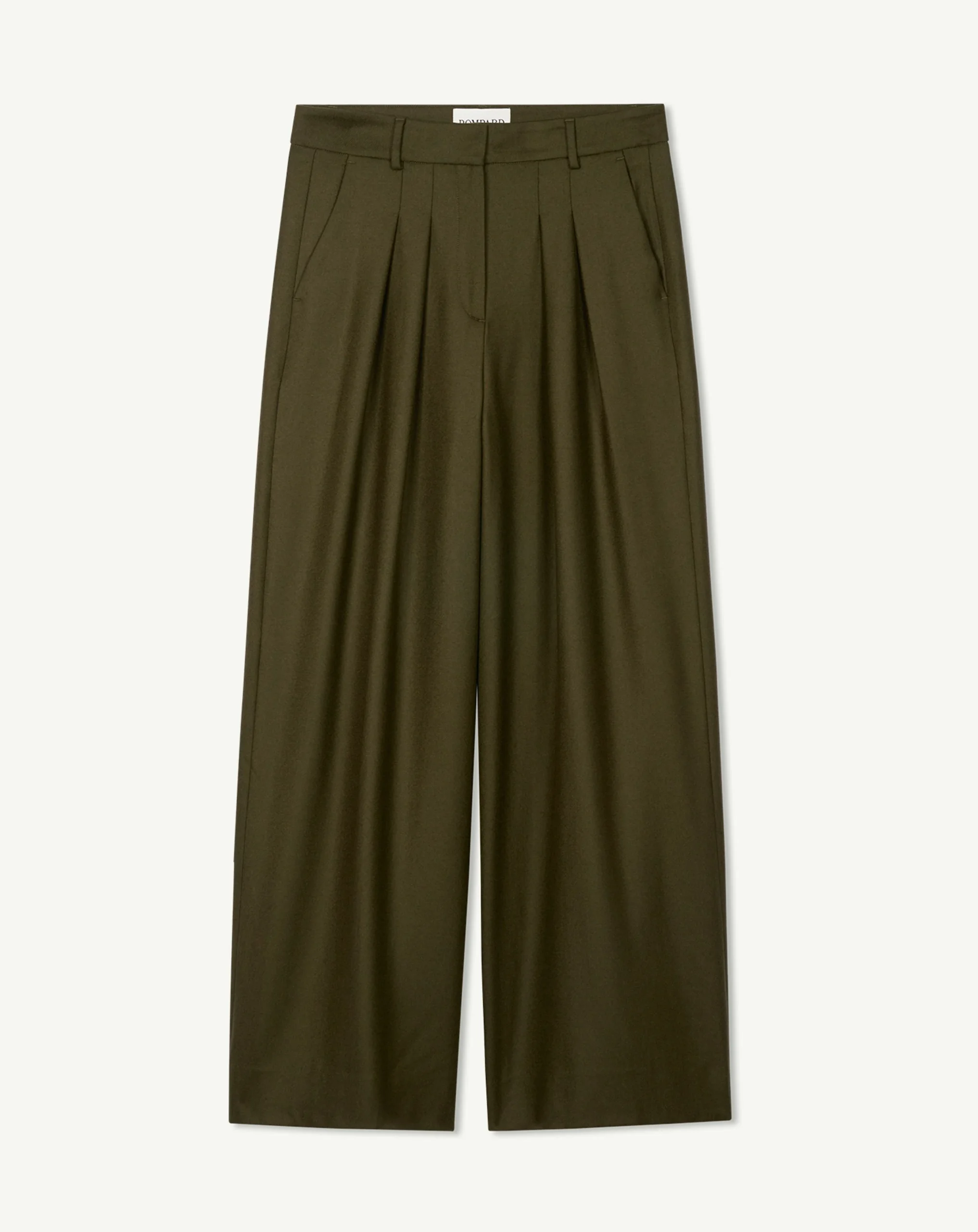 Pantalon femme en drap de laine et cachemire léger. Coupe fuselée, rehaussée par des plis marqués à l’avant.